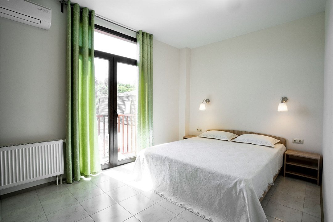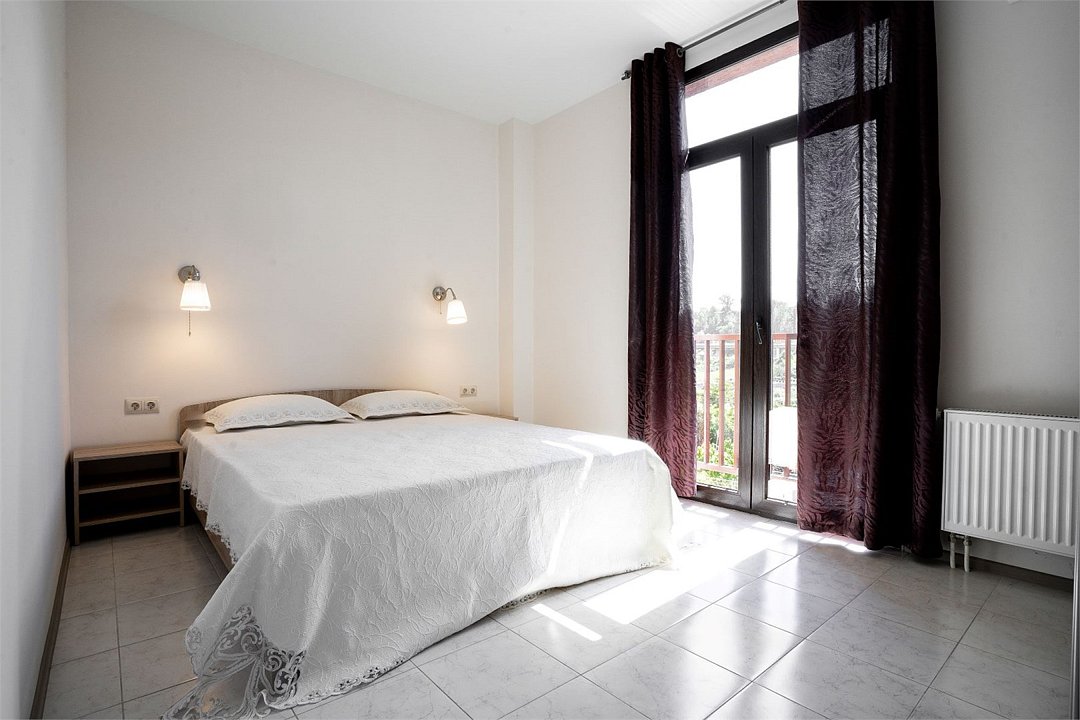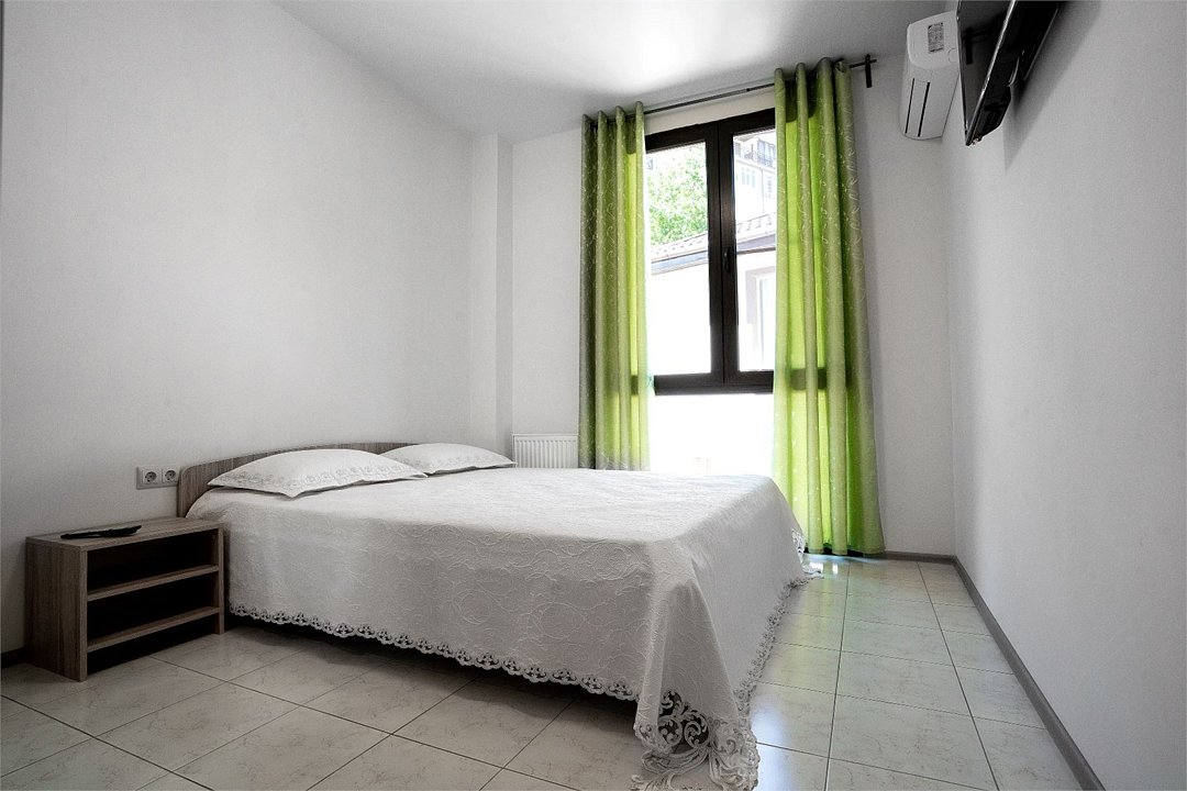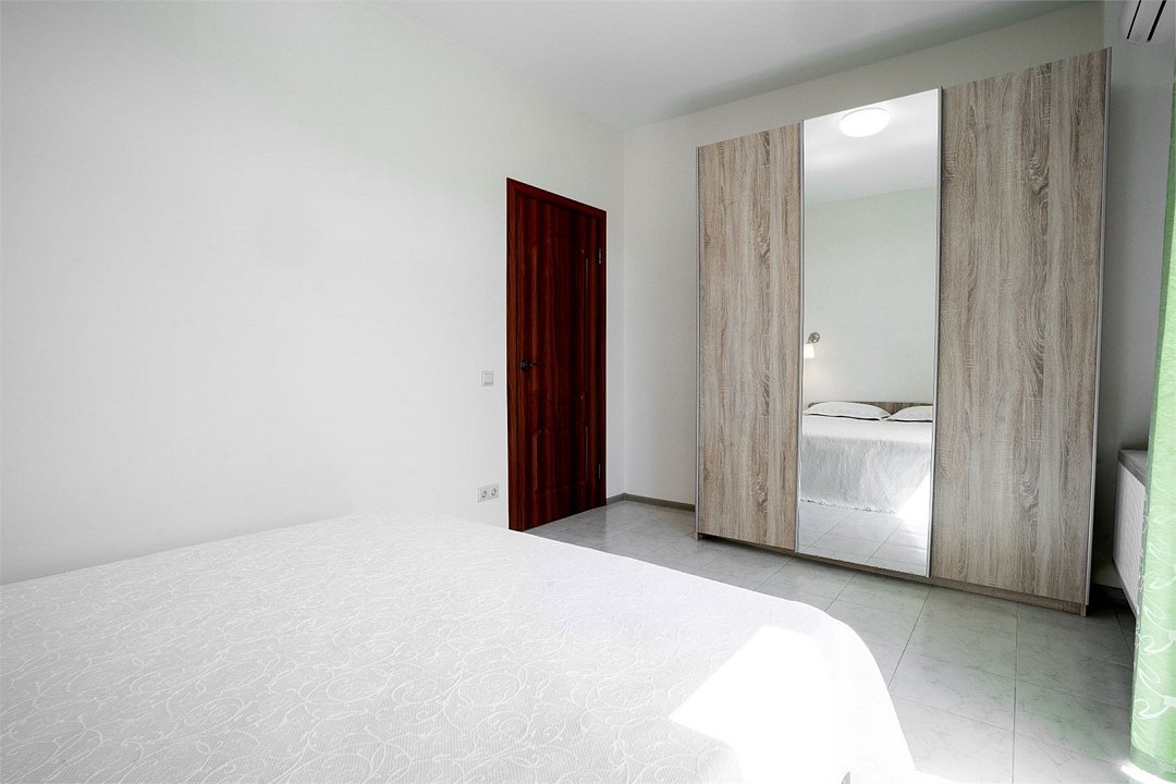 Площадь апартамента, 35 кв.м. Две отдельные комнаты: спальня и кухня-студия. Выделенный с/у. Балкон, французского типа. В спальне, двуспальная кровать 160*200см, шкаф-купе, прикроватная тумбочка, кондиционер, ТВ. В кухне, двуспальный раскладной диван 140*200см, стол/стулья, кондиционер. На кухонной зоне: мойка, электроплита, микроволновка, кухонные шкафы, кухонная вытяжка, холодильник. Также в апартаменте имеется стиральная машина, гардеробная вешалка.Услуги и удобства