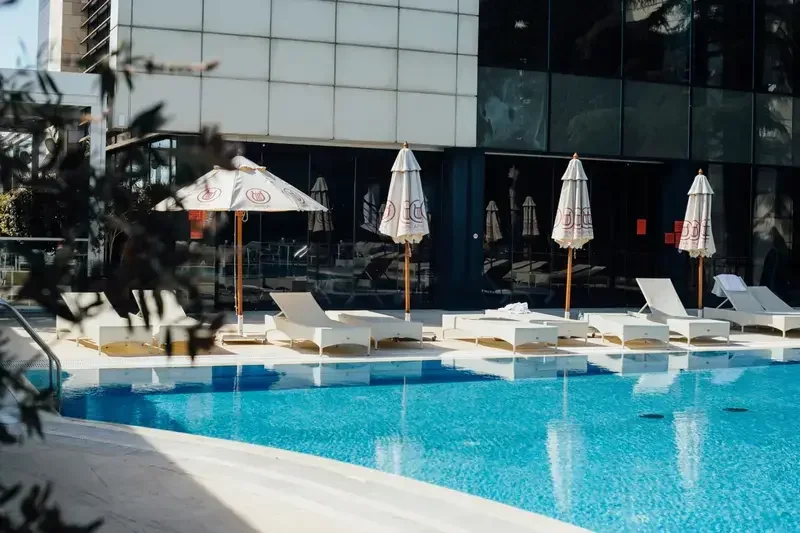 На территории гостиницы расположен просторный открытый бассейн, находящийся в непосредственной близости от Главного корпуса. Он оборудован удобными шезлонгами, душевыми кабинами и пляжными зонтиками, создавая максимально комфортные условия для отдыха. В летний сезон у бассейна работает бар, где можно освежиться напитками на любой вкус.