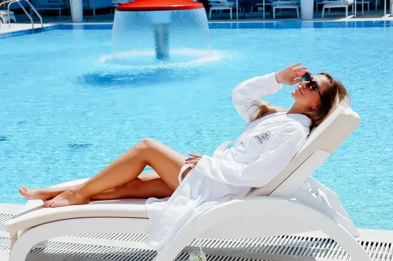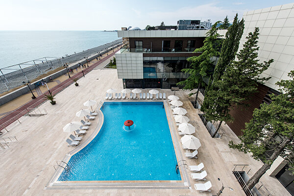 Тип бассейна: открытый бассейнВода в бассейне: подогреваемый бассейнРядом с бассейном: душ, шезлонги, зонтики, бар у бассейнаТемпература в бассейне: 25 °CРазмеры: 14 x 18 мПлощадь: 252 м²Время работы: от 09:00 до 22:00Глубина: 150 смНа территории гостиницы расположен просторный открытый бассейн, находящийся в непосредственной близости от Главного корпуса. Он оборудован удобными шезлонгами, душевыми кабинами и пляжными зонтиками, создавая максимально комфортные условия для отдыха. В летний сезон у бассейна работает бар, где можно освежиться напитками на любой вкус.