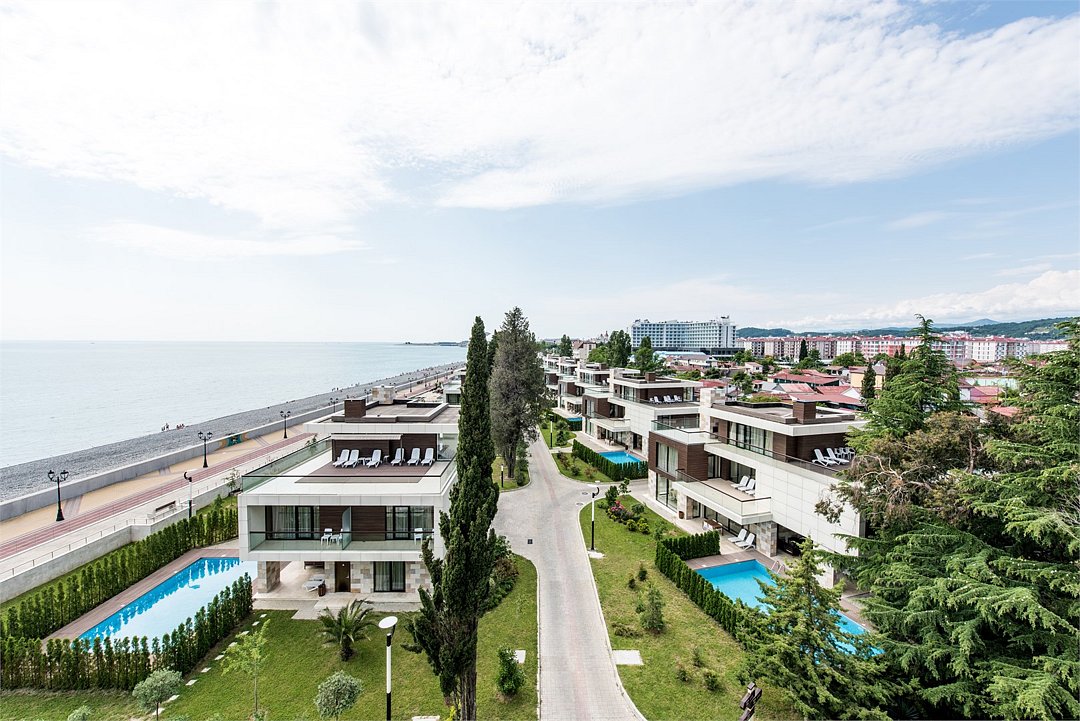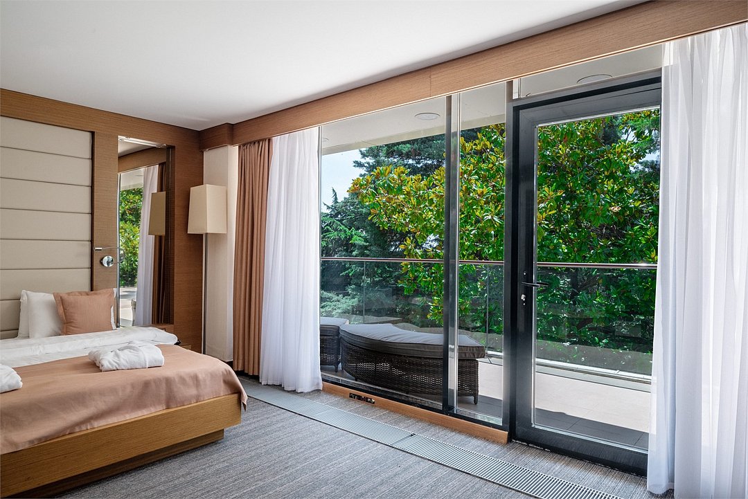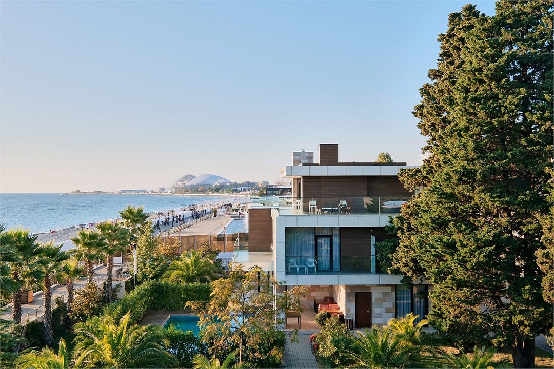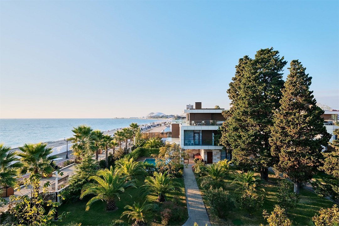 Гости, предпочитающие уединенный отдых, по достоинству оценят Виллы с собственным бассейном, парковкой и цветущим садом прямо на берегу моря. 23 уютных коттеджа расположились в живописном парке, утопающем в зелени пальм, тропических цветов и хвойных деревьев. Просторная и уютная гостиная с высокими потолками и вторым светом занимает первый этаж Виллы и представлена в виде большой мягкой зоны с камином и TV. Далее она переходит в обеденную зону кухни на 12 человек, где встроена вся необходимая бытовая техника. Гостиная имеет выход на террасу к открытому бассейну и саду, где размещается летняя мебель: шезлонги, диваны, кресла и столики для пикника. Всего в Коттедже 7 спален с индивидуальными ванными комнатами. Две спальни на первом уровне, четыре спальни с просторными террасами и балконами на втором уровне, и одна мастер-спальня на третьем уровне с самой большой, панорамной террасой, где приятно наслаждаться морским пейзажем и цветущим парком.Услуги и удобства