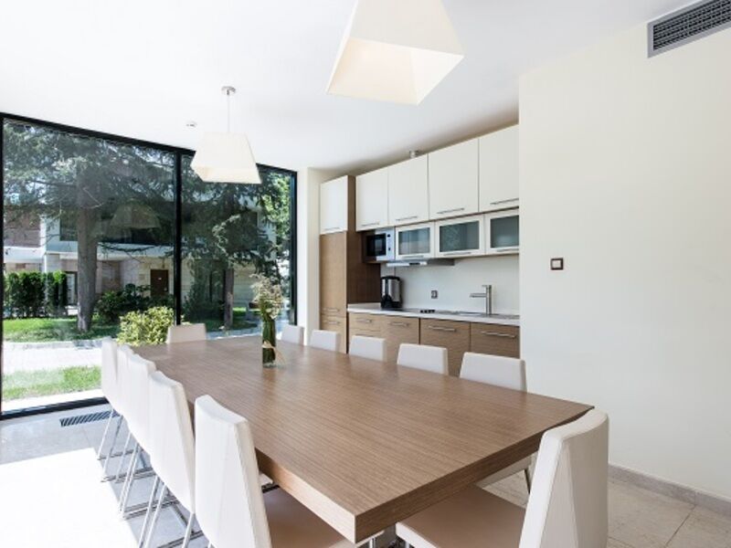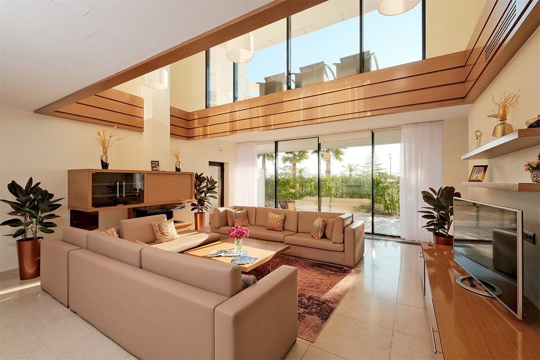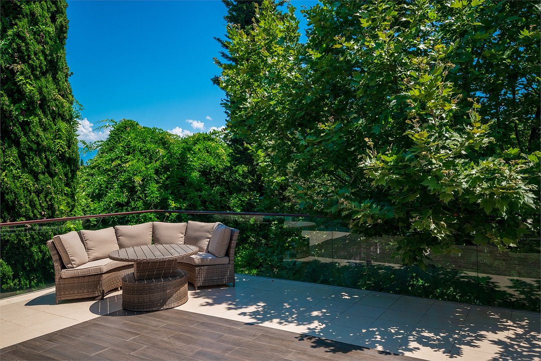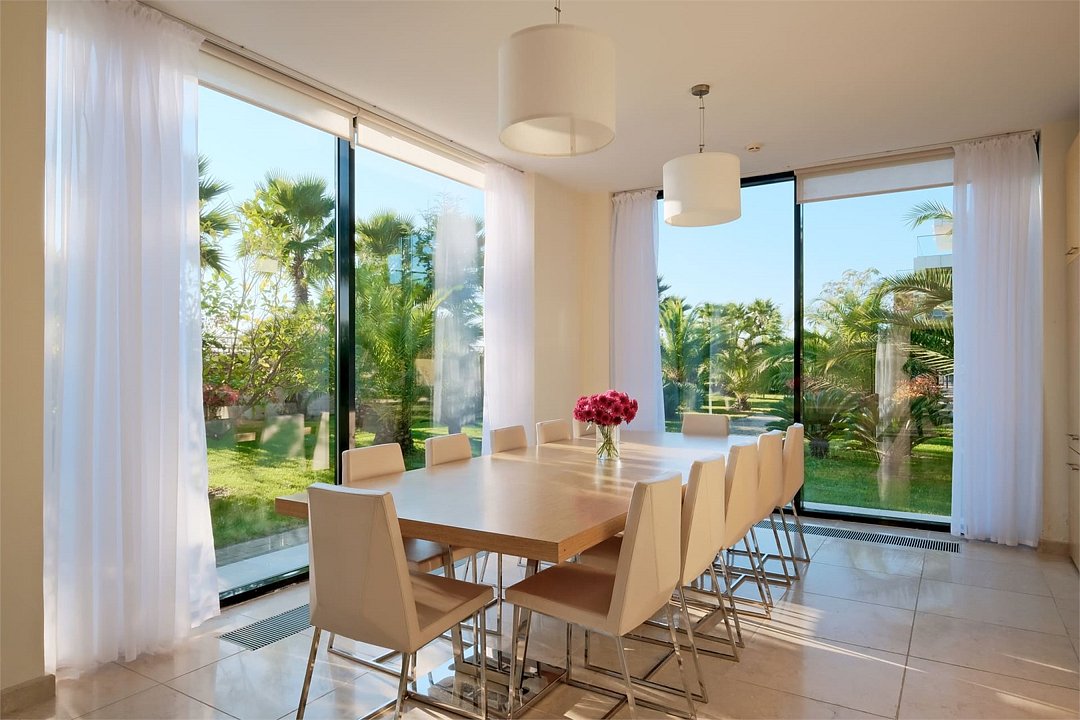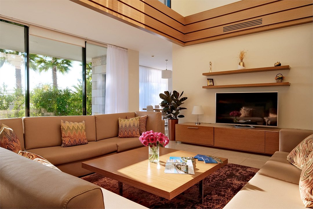 Гости, предпочитающие уединенный отдых, по достоинству оценят Виллы с собственным бассейном, парковкой и цветущим садом прямо на берегу моря. 23 уютных коттеджа расположились в живописном парке, утопающем в зелени пальм, тропических цветов и хвойных деревьев. Просторная и уютная гостиная с высокими потолками и вторым светом занимает первый этаж Виллы и представлена в виде большой мягкой зоны с камином и TV. Далее она переходит в обеденную зону кухни на 12 человек, где встроена вся необходимая бытовая техника. Гостиная имеет выход на террасу к открытому бассейну и саду, где размещается летняя мебель: шезлонги, диваны, кресла и столики для пикника. Всего в Коттедже 7 спален с индивидуальными ванными комнатами. Две спальни на первом уровне, четыре спальни с просторными террасами и балконами на втором уровне, и одна мастер-спальня на третьем уровне с самой большой, панорамной террасой, где приятно наслаждаться морским пейзажем и цветущим парком.Услуги и удобства