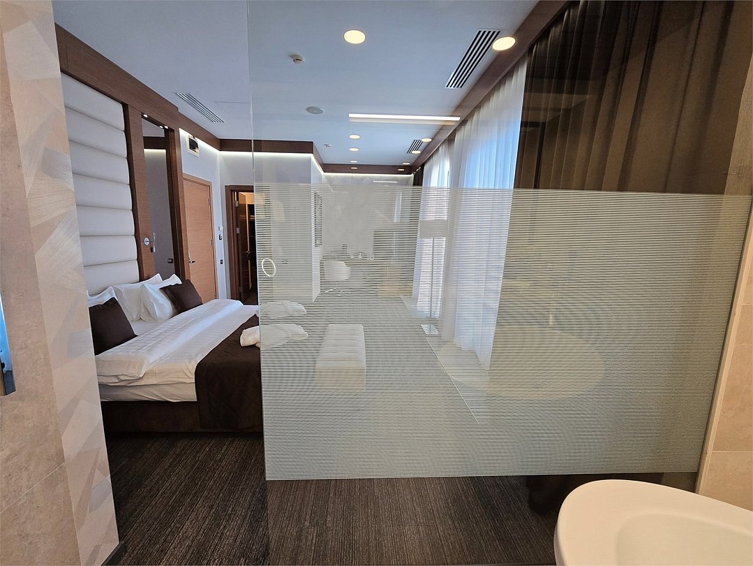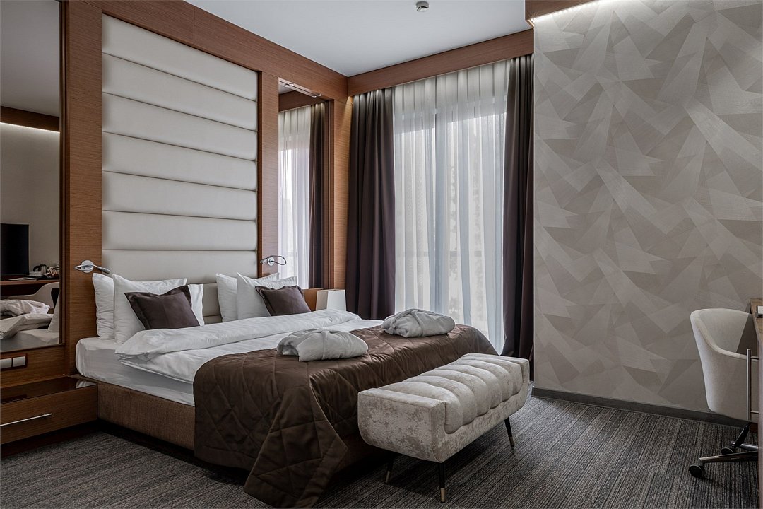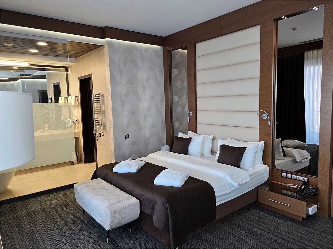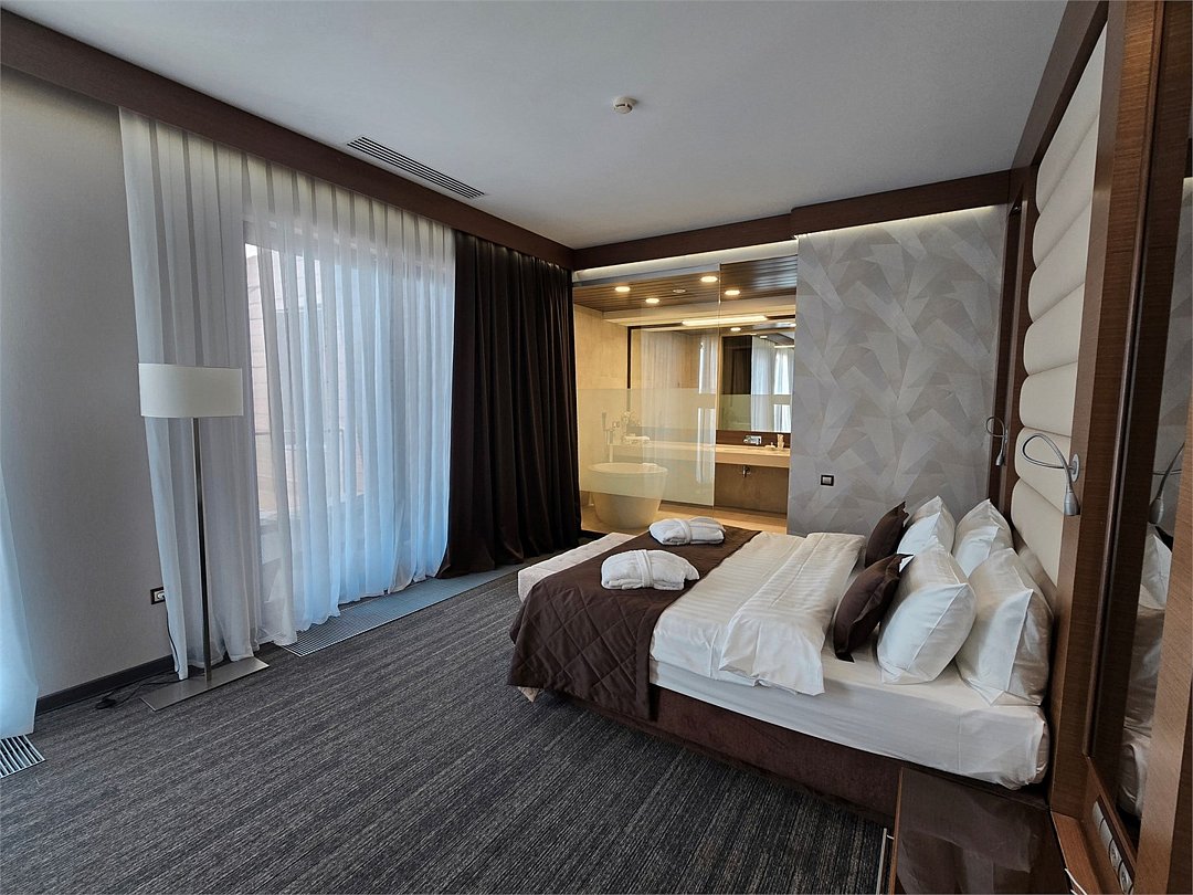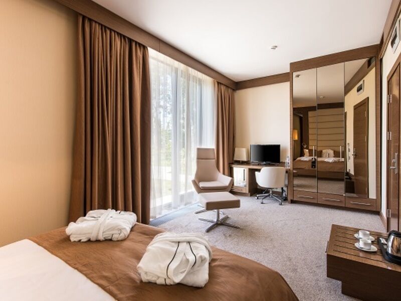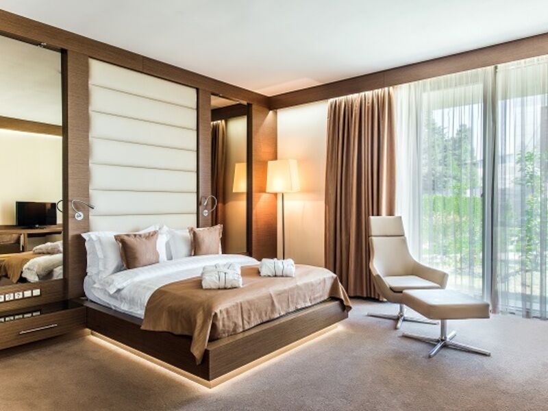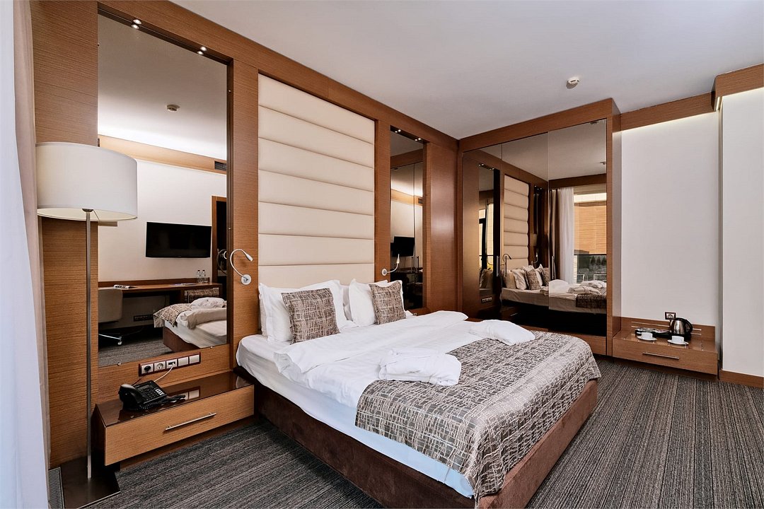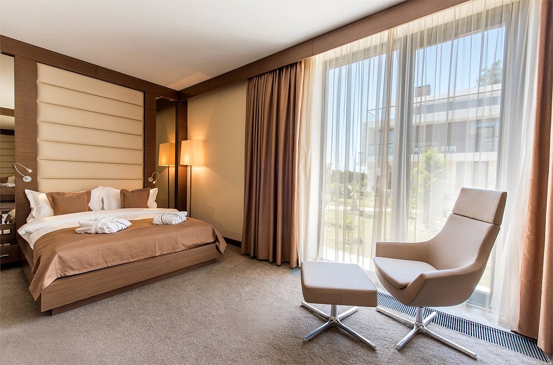 Однокомнатный номер выполнен в классическом, сдержанном стиле, обращая внимание из спальни к живописному парку сквозь панорамные окна. В номере большая двуспальная кровать, телевизор с плоским экраном, электрическим чайником и сейфом. В распоряжении гостей собственная ванная комната с душем, биде и бесплатными туалетно-косметическими принадлежностями. Размещение в Вилле (первый или второй этаж).Услуги и удобства