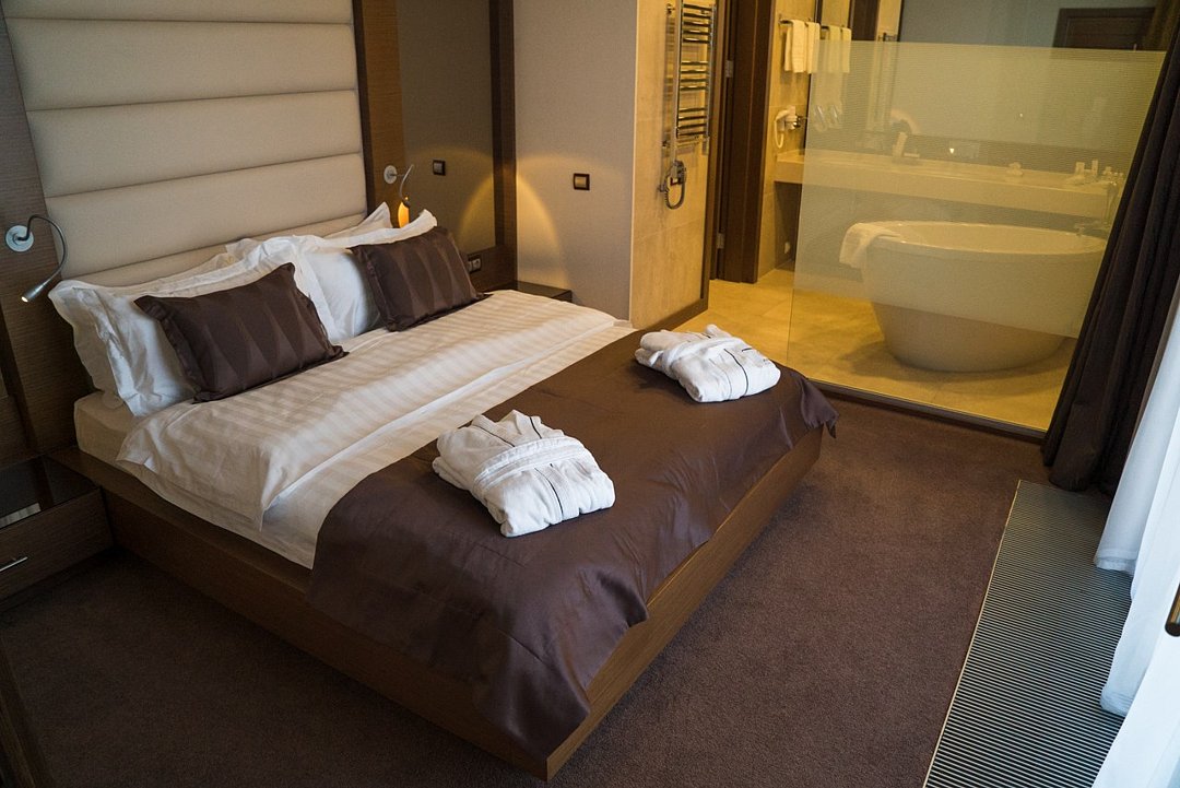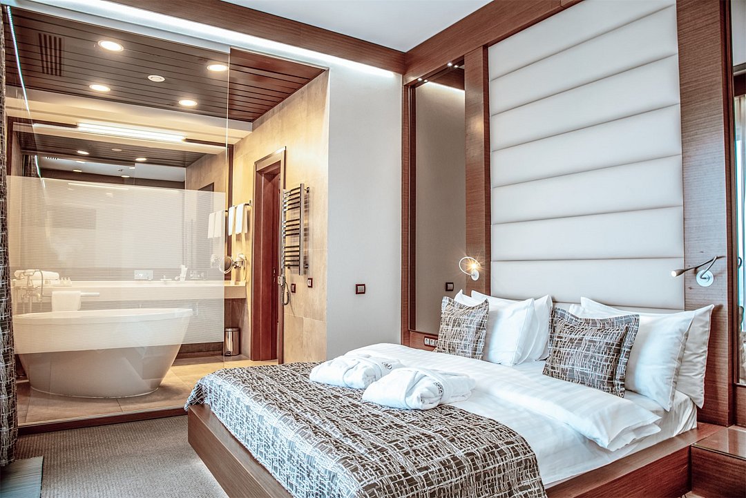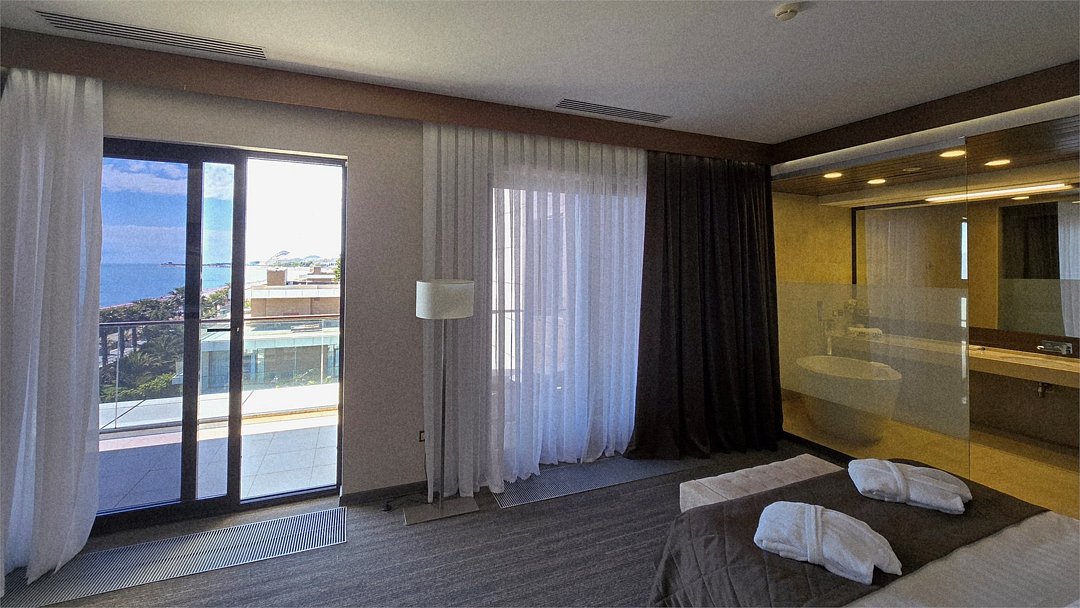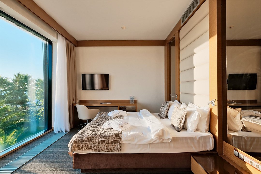 Номера отеля оборудованы современной техникой и обставлены мягкой мебелью. Интерьеры здесь созданы с особенным вкусом. Из огромных окон открывается завораживающий вид на море.