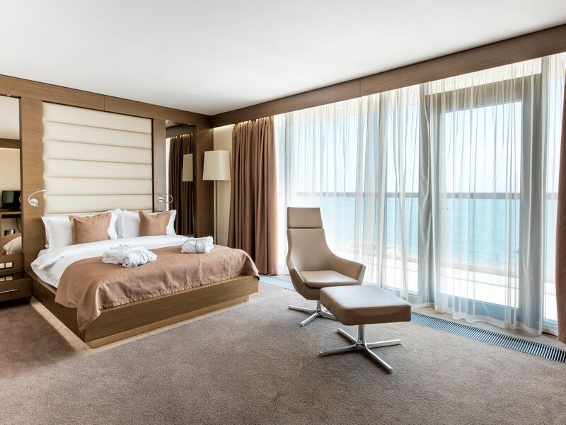 Для короткой деловой поездки или расслабляющего отдыха Люкс “Премьер” с видом на море - идеальный выбор для любых событий. Комфортная спальня, с большой двуспальней кроватью, просторная гостиная, гардеробная, роскошная ванная комната и конечно терраса, где приятно насладиться закатом бескрайнего Черного моря или звездным небом.Услуги и удобства