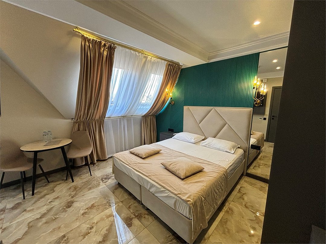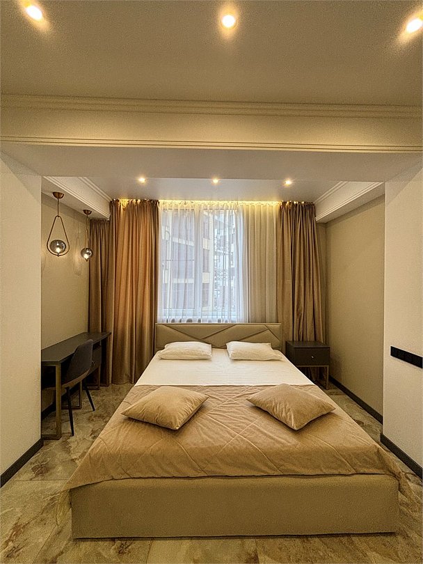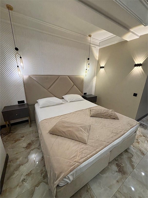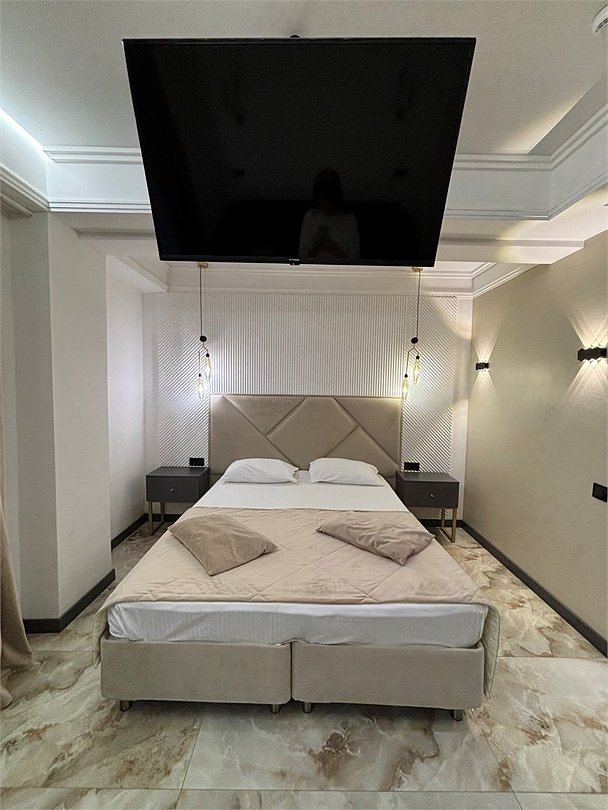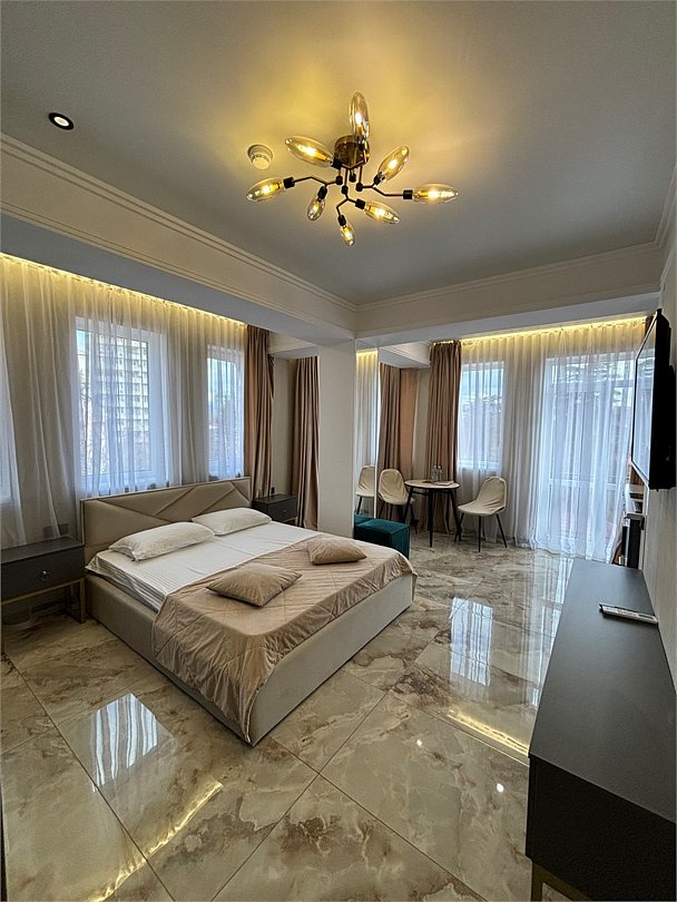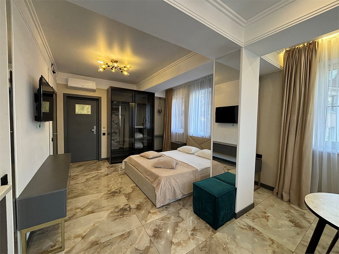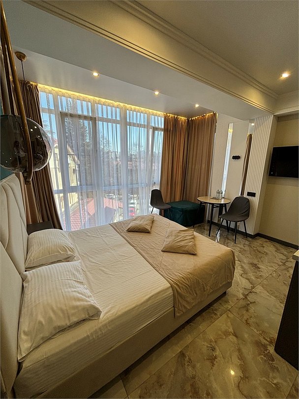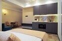 Двуспальная «king-size» кровать, диван-кровать. Миникухня, чайник, микроволновка, эл.плита, кондиционер, индивидуальный с/у в номере