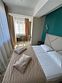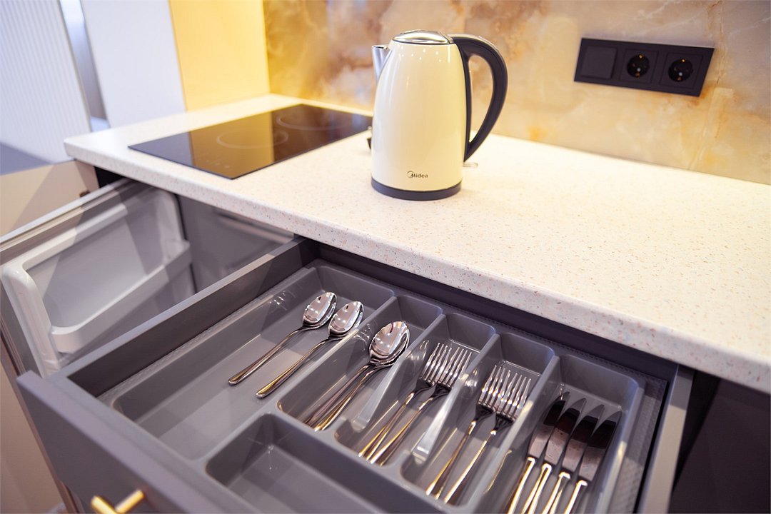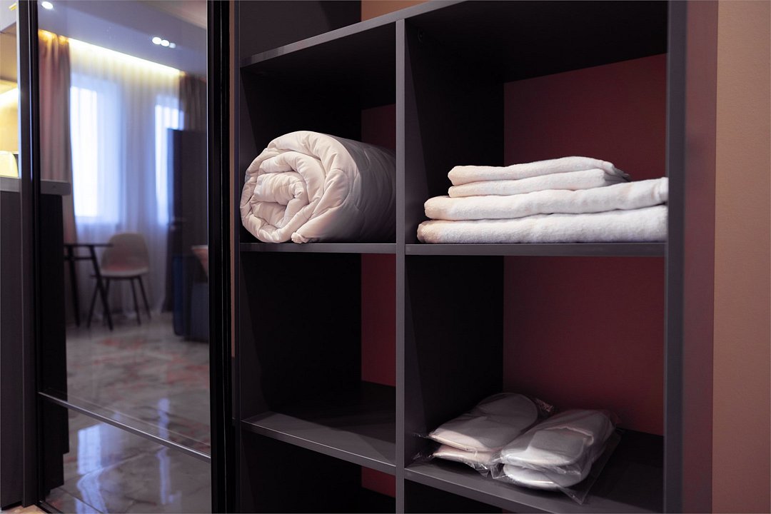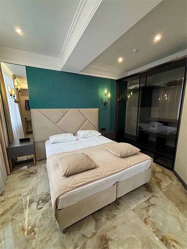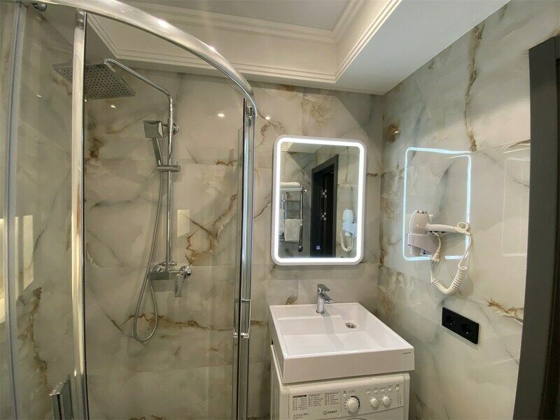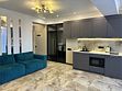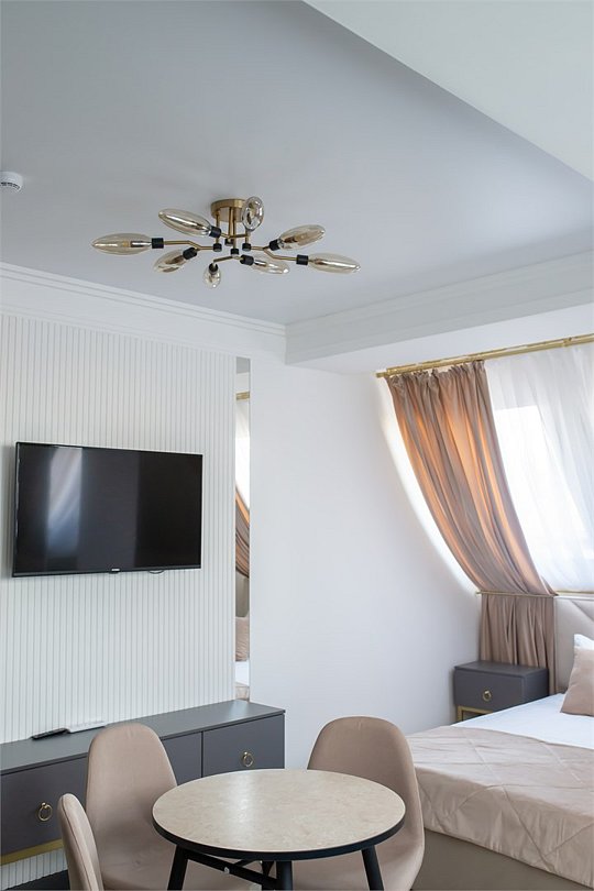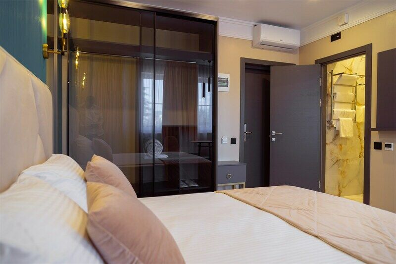 Стильный и просторный апартамент полностью оборудован всем необходимым для комфортного проживания. Двуспальная кровать и двуспальный диван-кровать, расположенные в разных комнатах, позволят оставаться рядом, но иметь личное пространство. Прочувствовать особую атмосферу апартаментов позволяет оборудованная кухня, где приятно приготовить Ваш любимый завтрак или заварить чашечку любимого кофе. Современная функциональная бытовая техника: индукционная панель, микроволновая печь, чайник, мини-холодильник, телевизор, а также просторный санузел с душевой кабиной, стиральная машина, полотенцесушитель, фен, гигиенические принадлежности- Всё, что необходимо для жизни! Номера данной категории могут незначительно отличаться планировкой между собой.Услуги и удобства