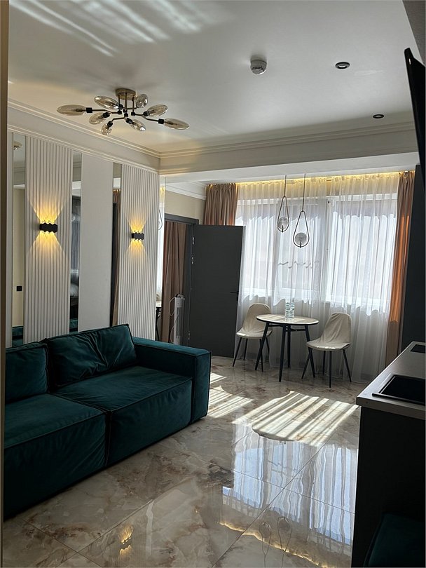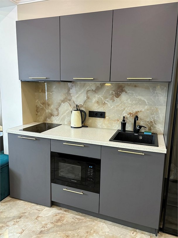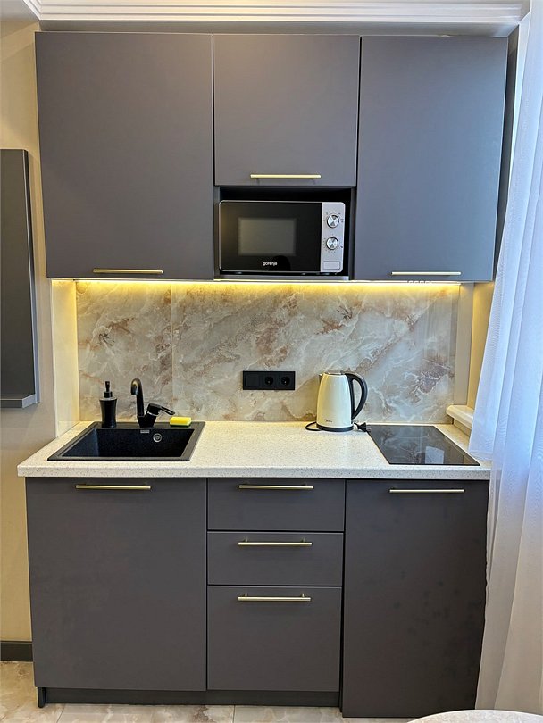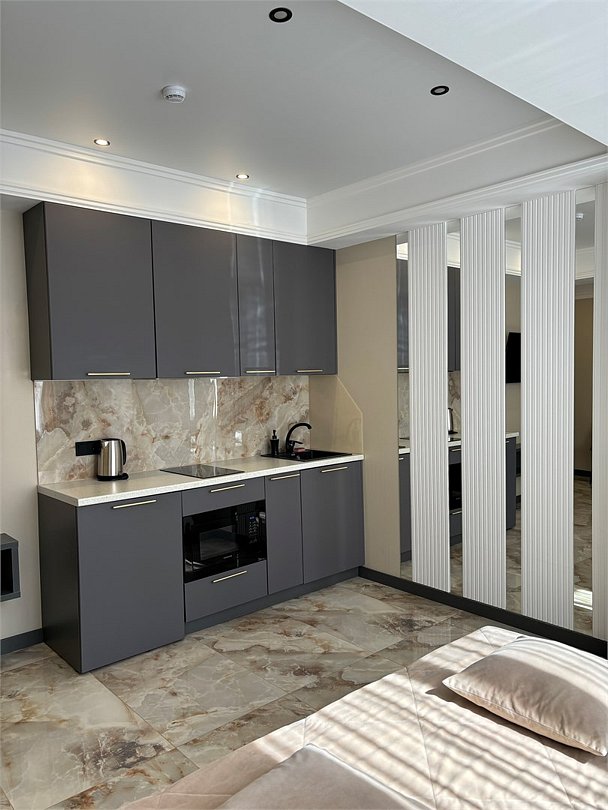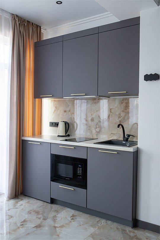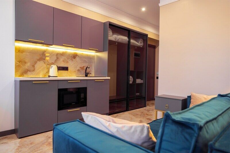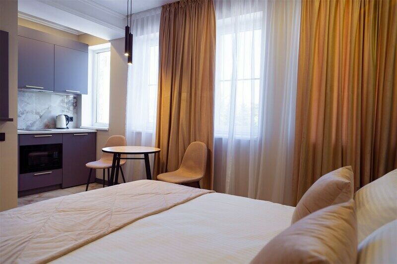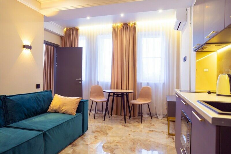Стильный апартамент представляет собой небольшую уютную студию с удобным раскладывающимся двуспальным диваном. Smart TV, стабильный быстрый Wi-Fi, сплит-система, сейф, шторы blackout -Всё, чтобы Вам было комфортно и удобно. Мини-кухня в апартаментах полностью укомплектована всем необходимым для самостоятельного приготовления пищи-варочная панель, вытяжка, микроволновая печь, электрический чайник, барный холодильник, а также посуда и столовые приборы. В светлом и просторном санузеле можно найти душевую кабину, унитаз, стиральную машину, фен и полотенцесушитель. Каждый апартамент при заезде комплектуется необходимыми гигиеническими принадлежностями.Услуги и удобства