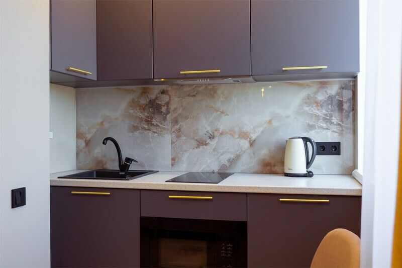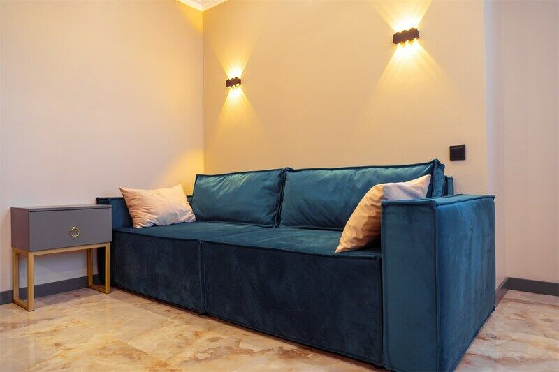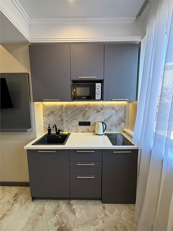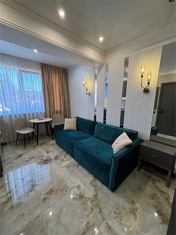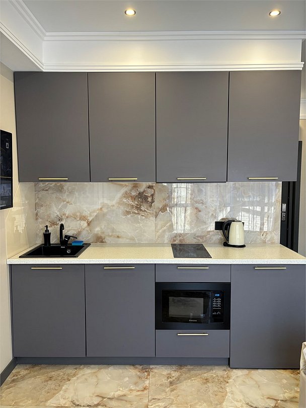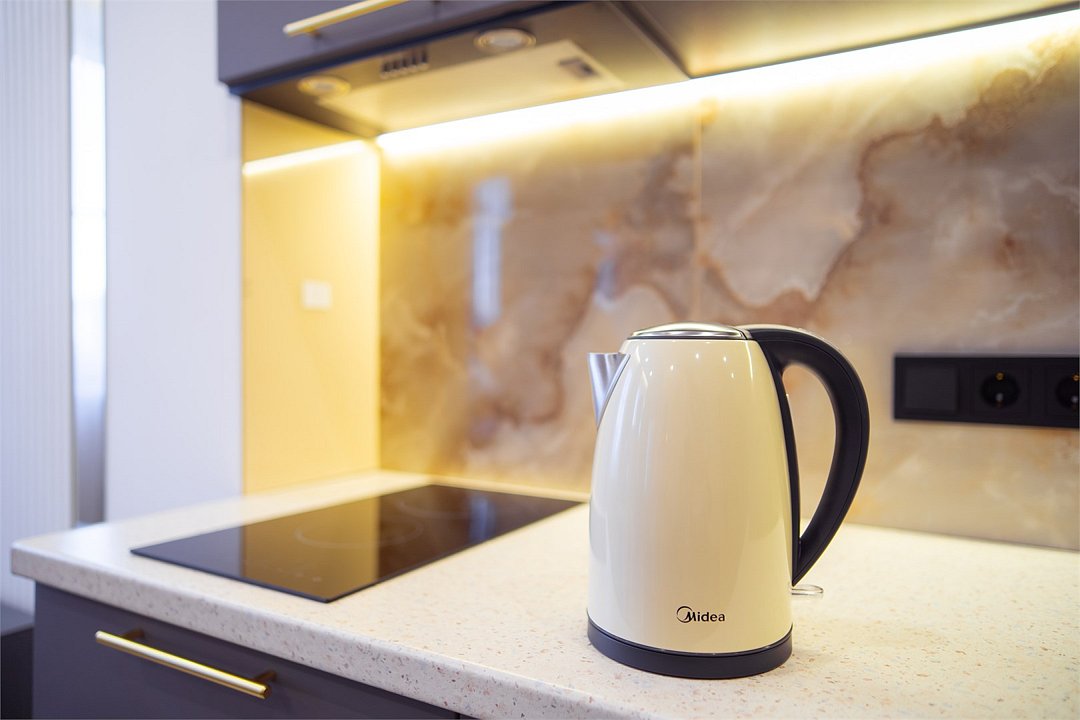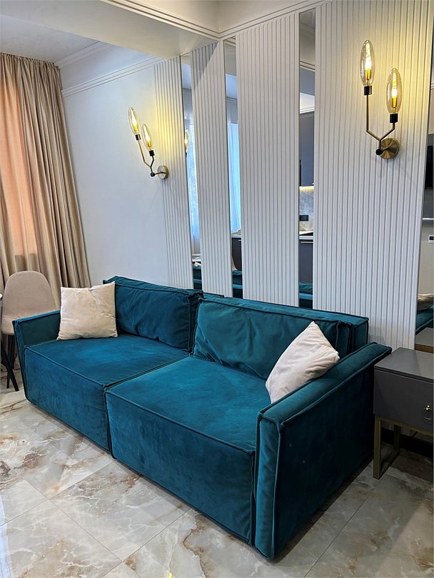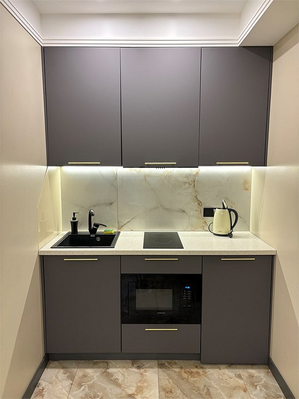 Стильный апартамент представляет собой небольшую уютную студию с удобным раскладывающимся двуспальным диваном. Smart TV, стабильный быстрый Wi-Fi, сплит-система, сейф, шторы blackout -Всё, чтобы Вам было комфортно и удобно. Мини-кухня в апартаментах полностью укомплектована всем необходимым для самостоятельного приготовления пищи-варочная панель, вытяжка, микроволновая печь, электрический чайник, барный холодильник, а также посуда и столовые приборы. В светлом и просторном санузеле можно найти душевую кабину, унитаз, стиральную машину, фен и полотенцесушитель. Каждый апартамент при заезде комплектуется необходимыми гигиеническими принадлежностями.Услуги и удобства
