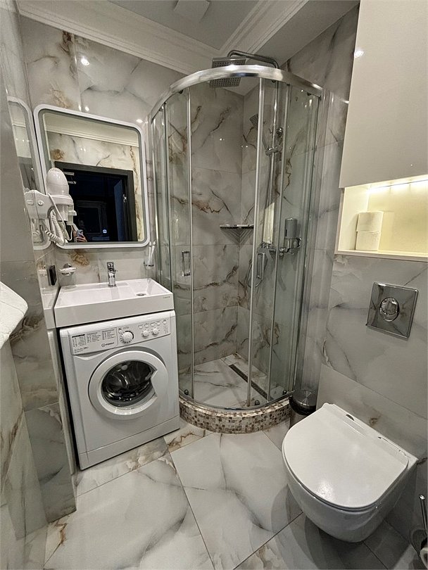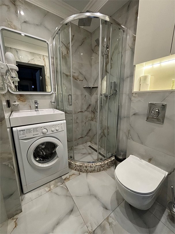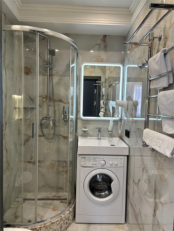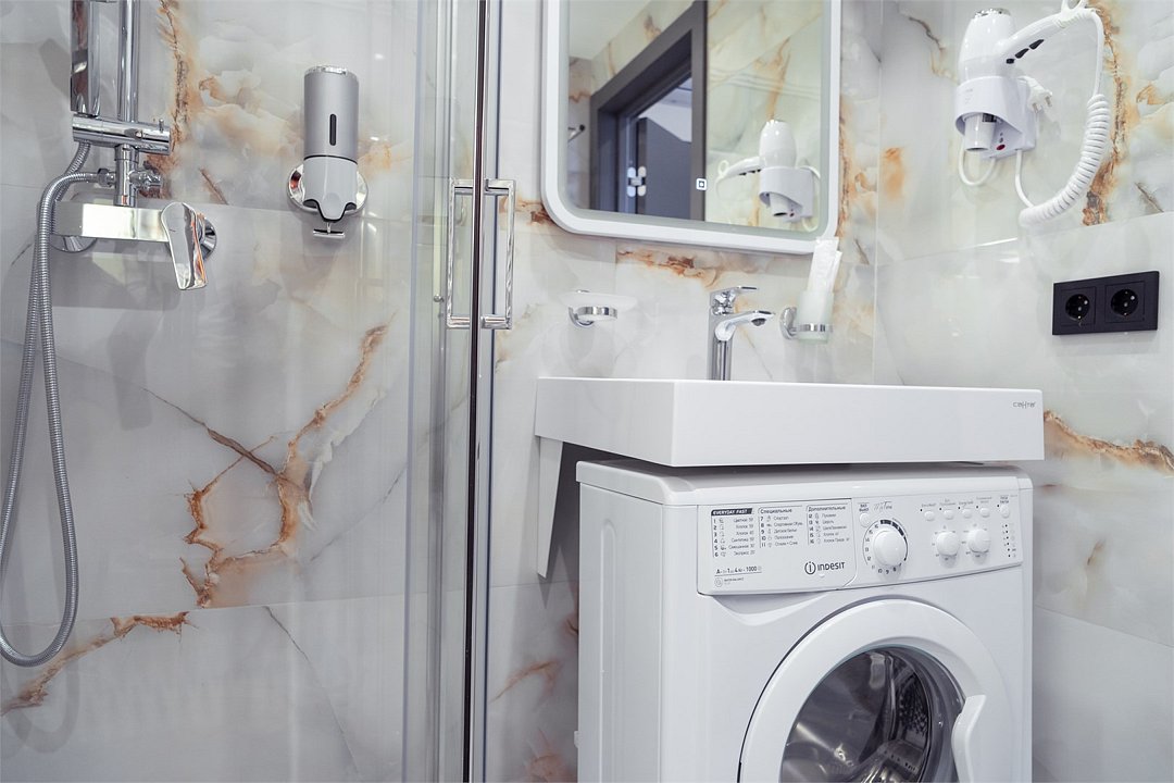 Просторный и уютный апартамент полностью оборудован и укомплектован по всем современным стандартам. Двуспальная кровать с удобным матрасом (в некоторых номерах данной категории спальные места могут быть раздельными (две односпальные кровати), телевизор с плоским экраном, оснащенная кухонная зона с варочной панелью и вытяжкой, обеденная зона со столом и стульями, барный холодильник с морозильной камерой, СВЧ-печь, электрический чайник, комплект посуды и столовых приборов, собственный санузел с душевой кабиной, стиральная машина, полотенцесушитель и фен- всё, что необходимо для комфортного проживания! Утюг и гладильная доска расположена на каждом этаже в круглосуточном доступе. Каждые апартаменты спроектированы с учетом комфортного проживания наших гостей! Номера данной категории могут незначительно отличаться планировкой между собой.Услуги и удобства
