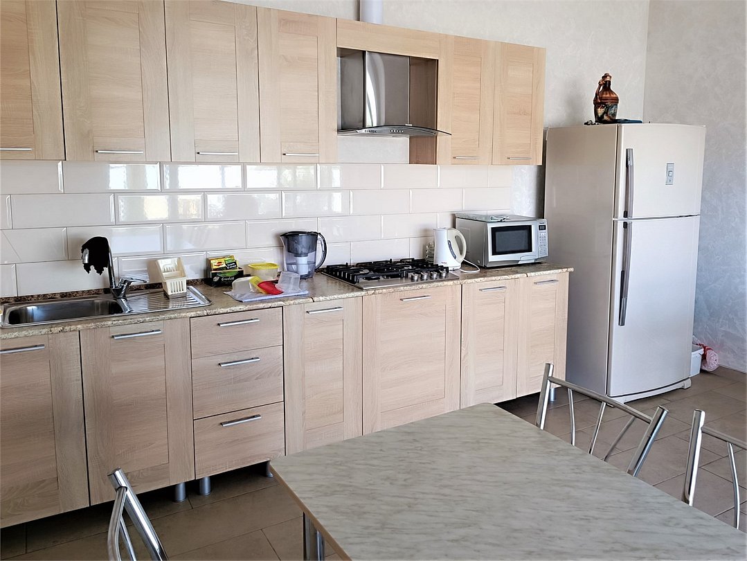 В номере есть всё, что нужно для комфортного отдыха ( кондиционер, телевизор , фен, тапочки, туалетная бумага, гель для душа, шампунь и т.д.) кулер и большой холодильник на этаже. На 1 эт.кухня с ещё одним большим холодильником , микроволновкой, чайником, плитой и всей необходимой посудой. Столики есть как на кухне, так и на воздухе перед домом. Можно готовить самим ( магазинов полно), а можно питаться в кафешках. Не далеко вкусный шашлык. -