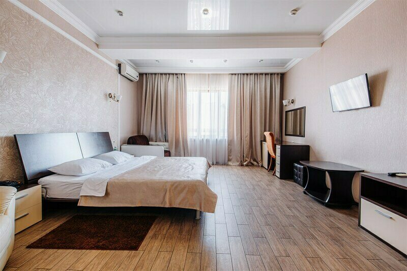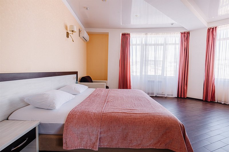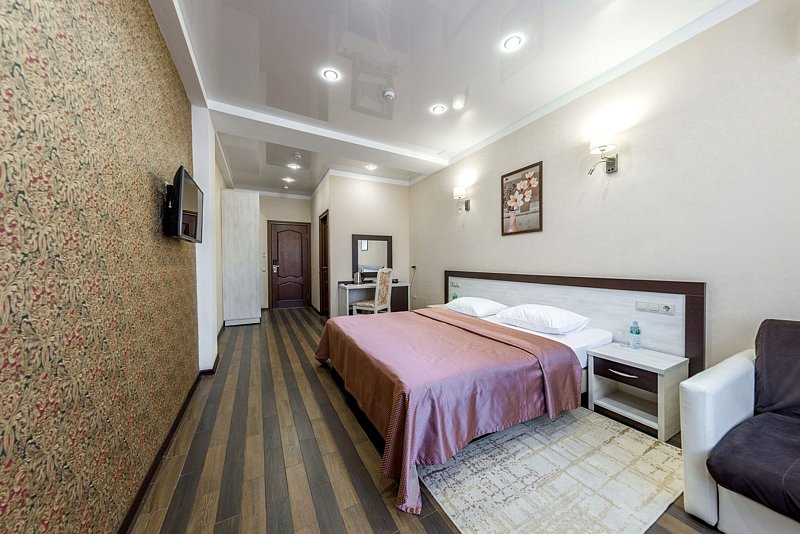 Просторный однокомнатный номер площадью 40 кв. м с одной просторной кроватью. Размещение для 2 гостей с возможностью установки дополнительного места.
