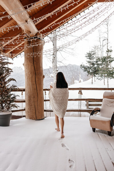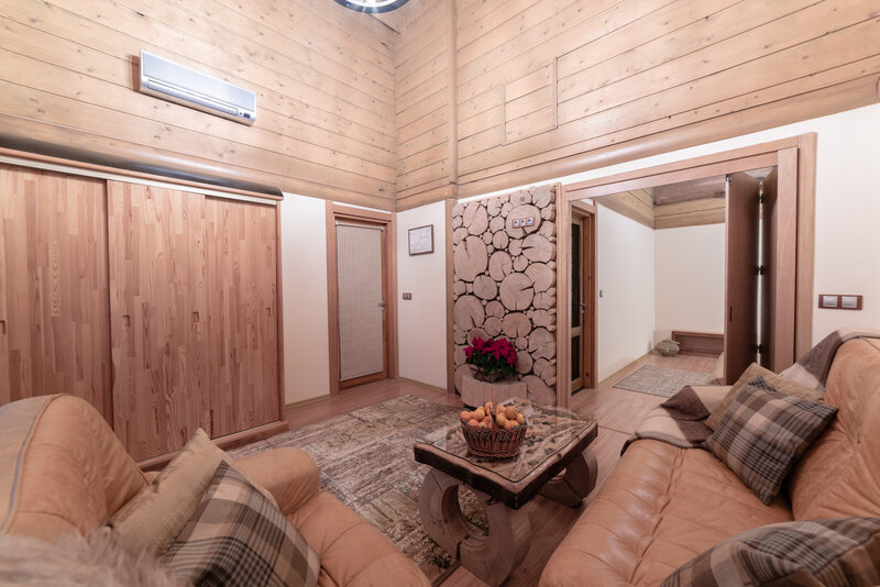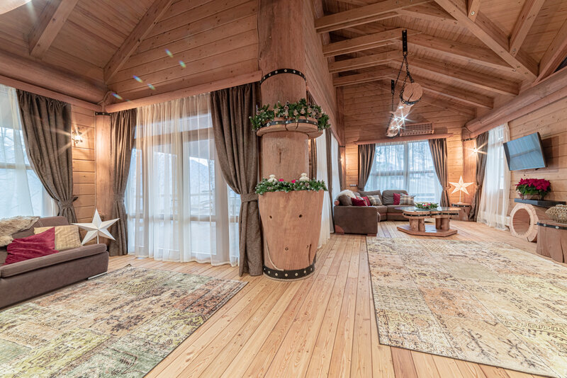 В Шале площадью комфортно разместится компания из 10 человек в пяти спальнях, оформленных в альпийском стиле. С террасы Шале открывается потрясающий вид на хребет Аибга.
