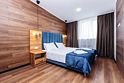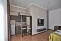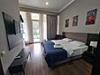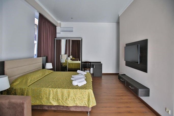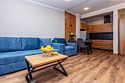 Двухкомнатные апартаменты. В спальне двуспальная кровать или две односпальные (на выбор), в гостинной двуспальный диван, односпальная кровать и раскладное кресло. Возможно поставить еще допместо. Мини кухня, теплые полы. Кондиционер, чайник - все есть. Взимается депозит в размере 2000рУслуги и удобства