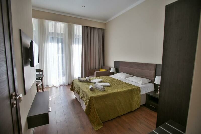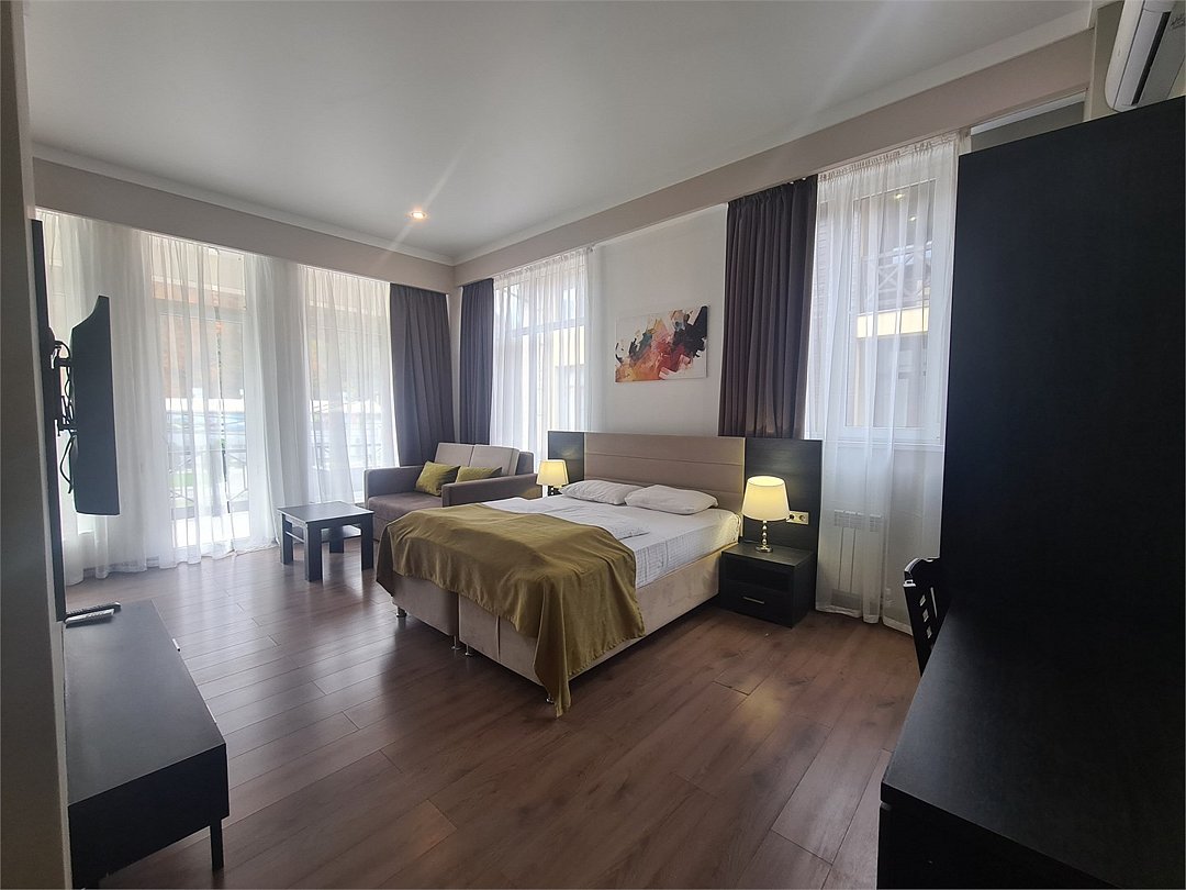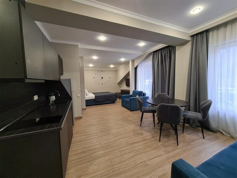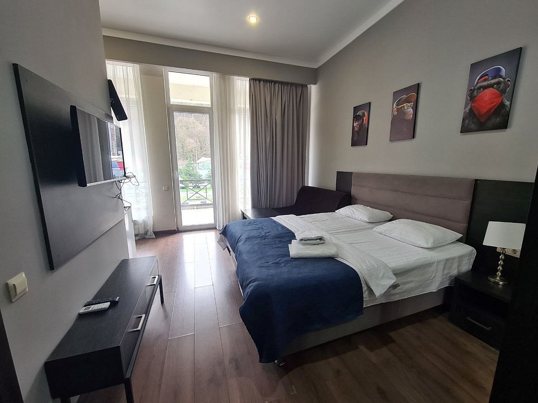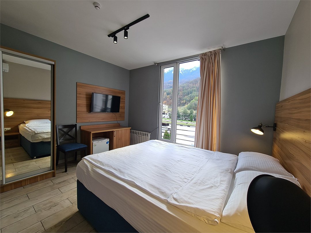 Апартаменты - студия с собственным столиком на террасе и видом на горы. Двуспальная кровать или две односпальные и раскладной диван. Мини-кухня в номере. Взимается депозит в размере 2000рУслуги и удобства