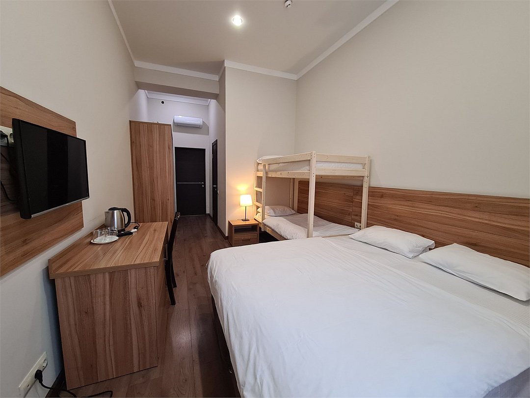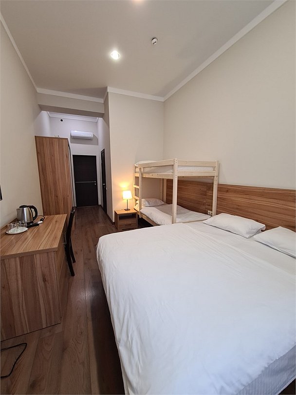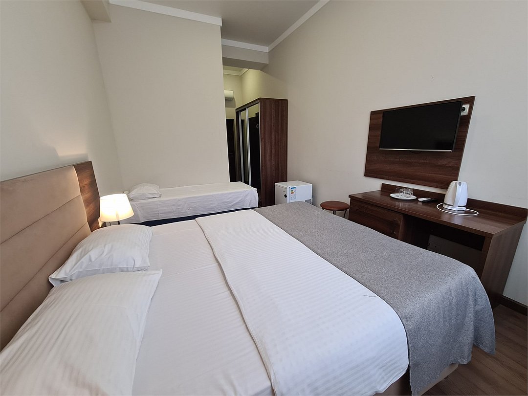Трехместный номер. В номере двуспальная или две односпальные кровати + односпальная кровать. Душ и туалет в номере, холодильник, кондиционер, тв, чайник - все есть. Взимается депозит в размере 2000рУслуги и удобства