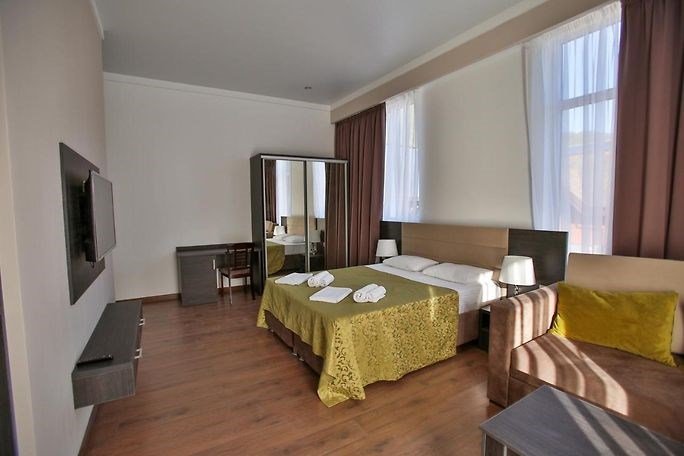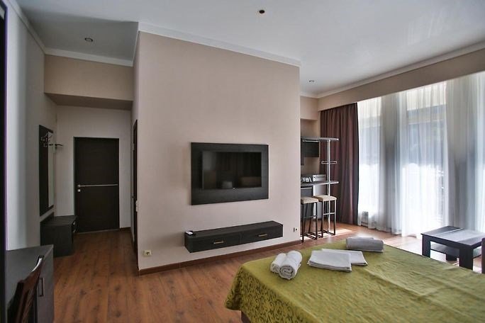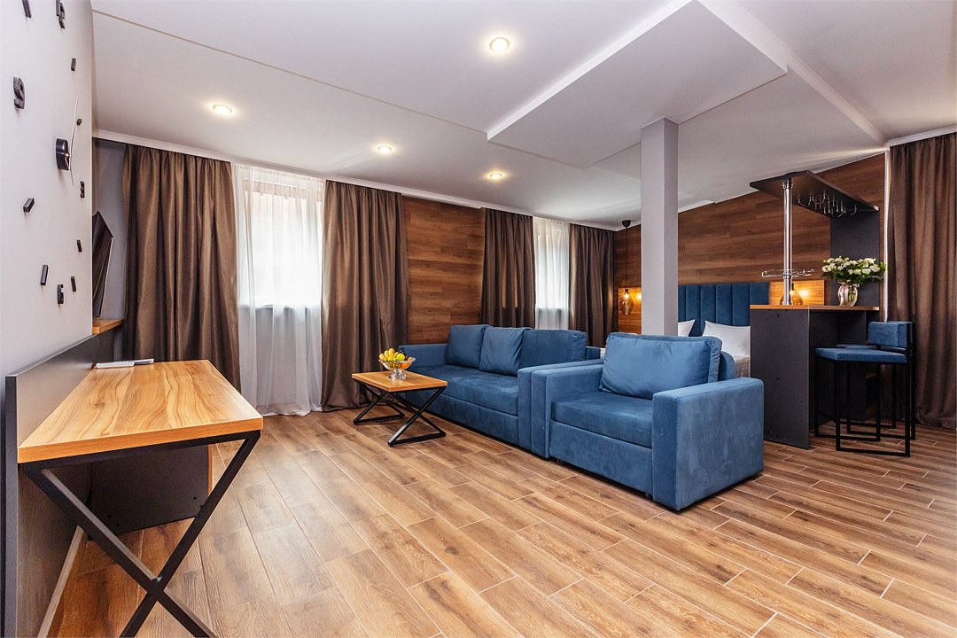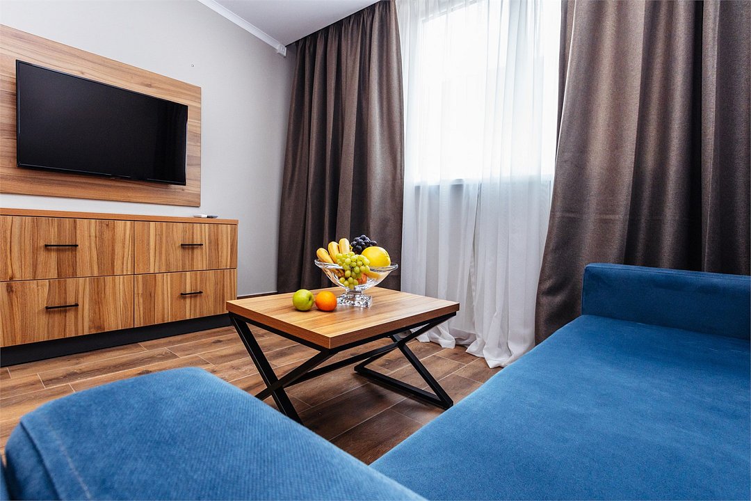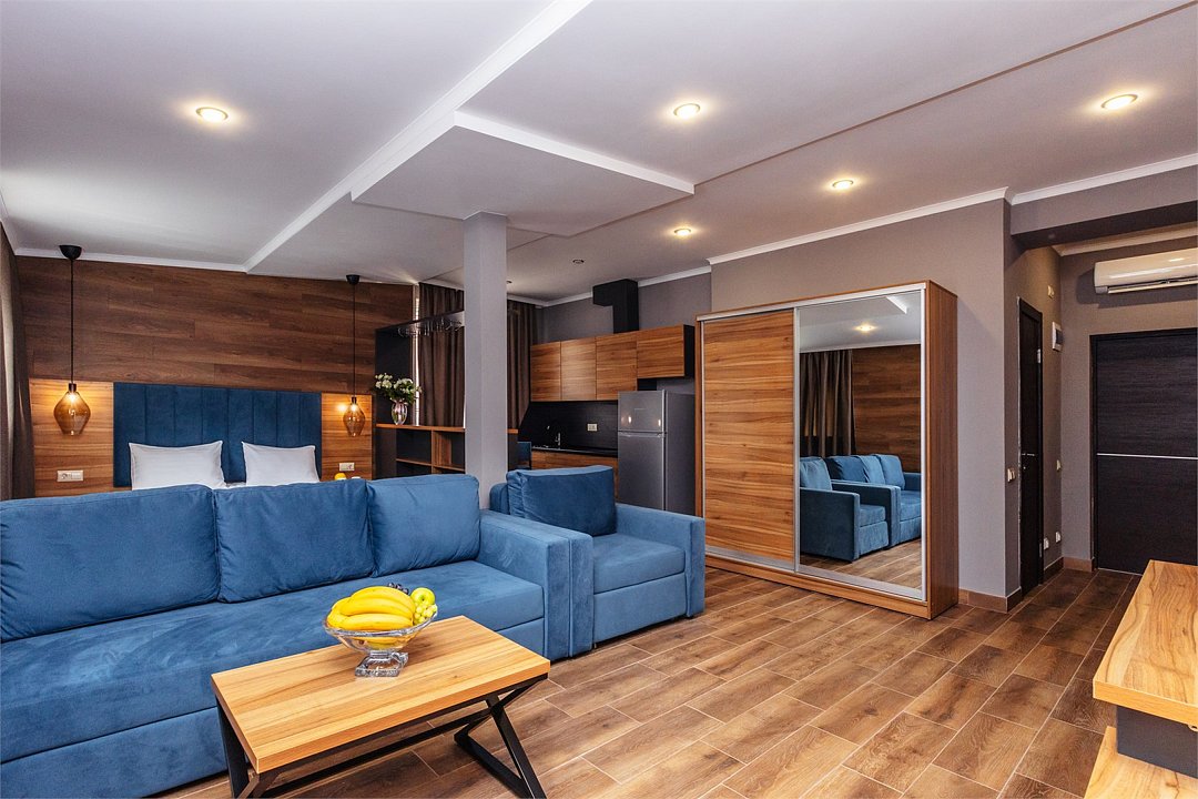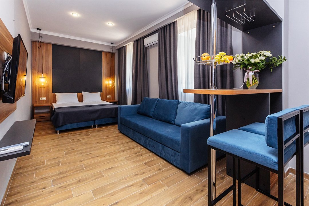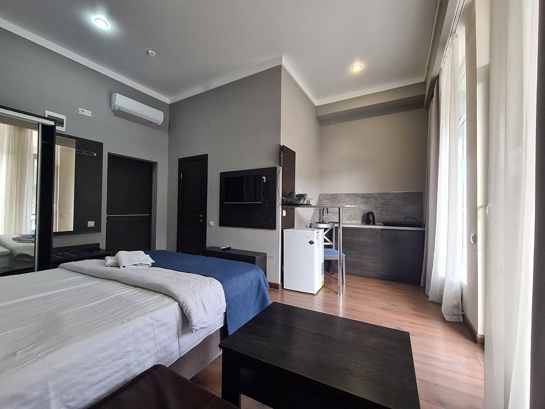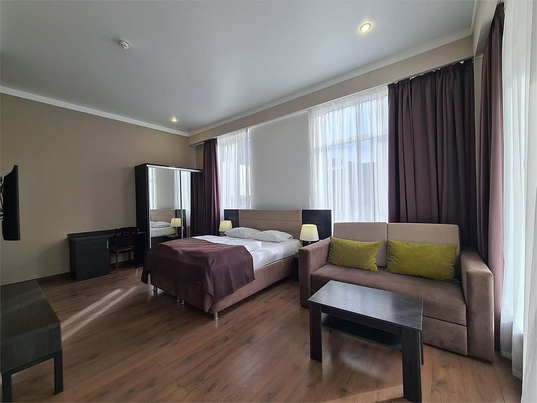 Улучшенные Апартаменты вмещают до 5 человек. Двуспальная кровать или две односпальные + раскладной диван + раскладное кресло. Кухонный блок в номере. Интернет, посуда, чайник, тв, кондиционер. Взимается депозит в размере 2000рУслуги и удобства