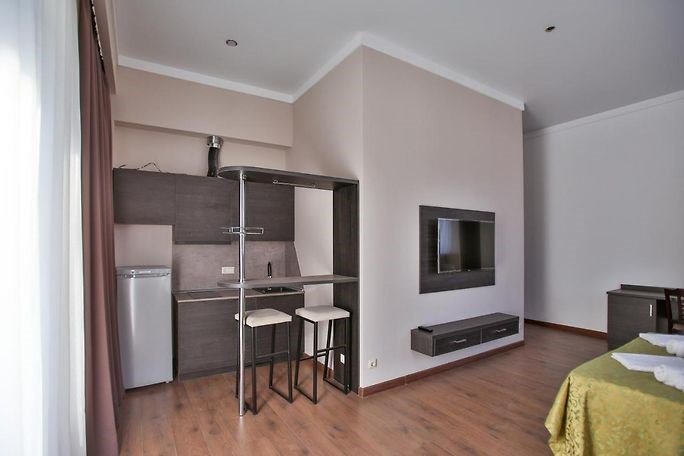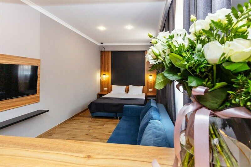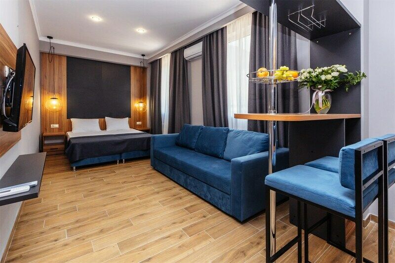 Wi-Fi, холодильник, кондиционер, плита для приготовления пищи, ванная комната, душевая кабина, санузел, банные полотенца, две односпальные или большая двуспальная кровать, чайник, гостиная зона, кухонная посуда, стул, диван-кровать, телевизор с плоским экраном, мини-кухня, шкаф-купе, номер для некурящих, кресло-кроватьВ апартаментах