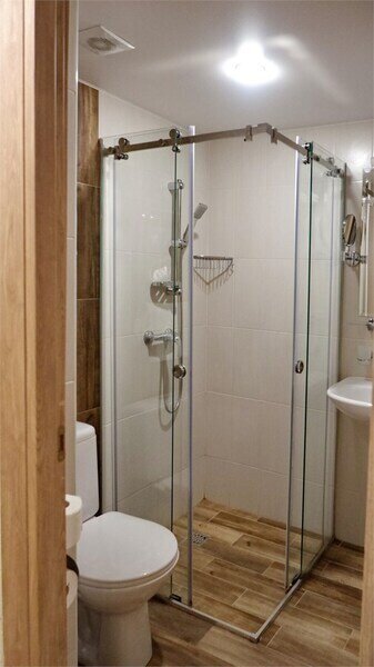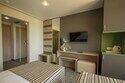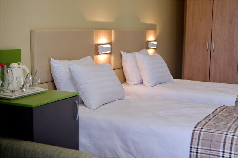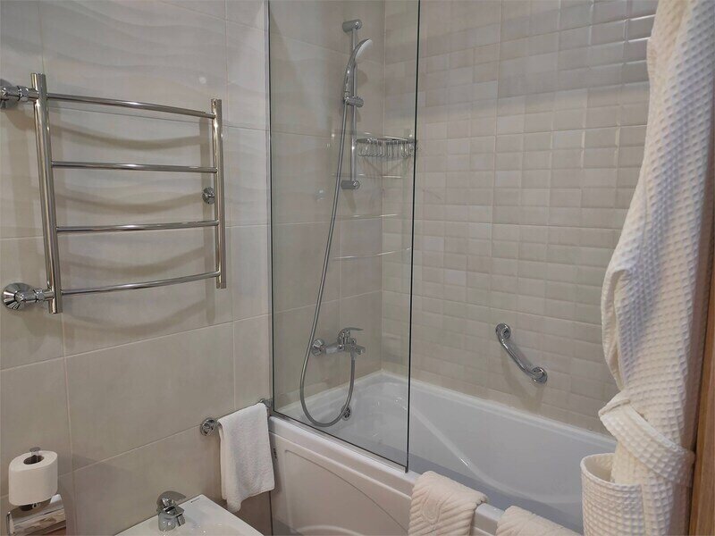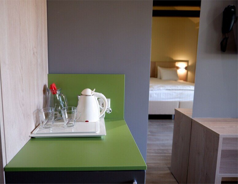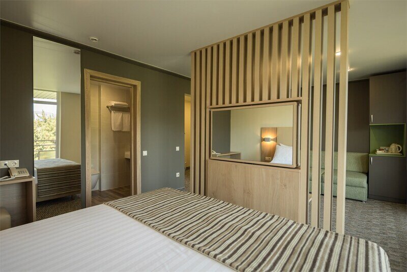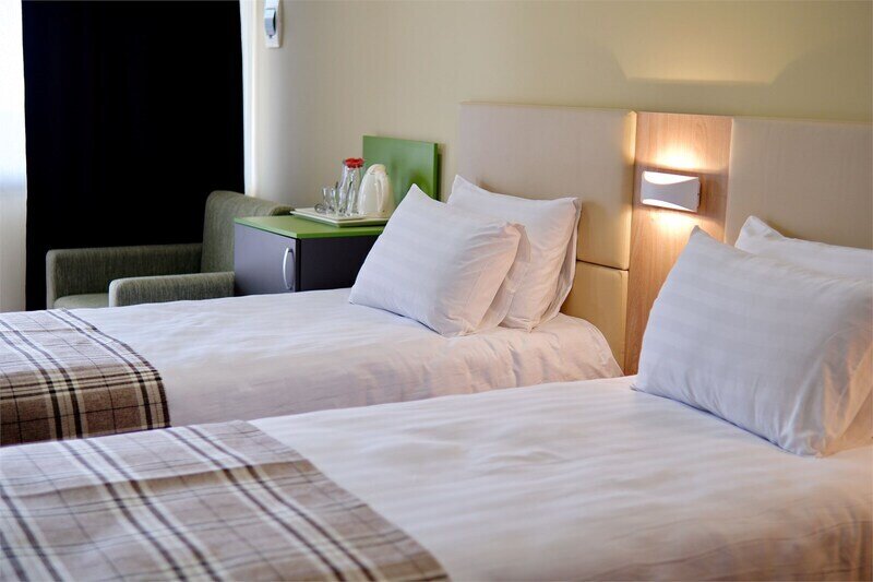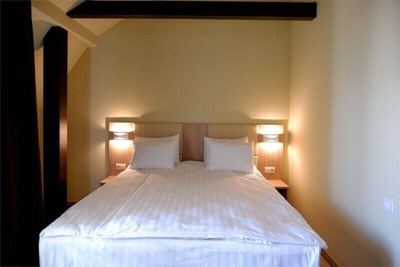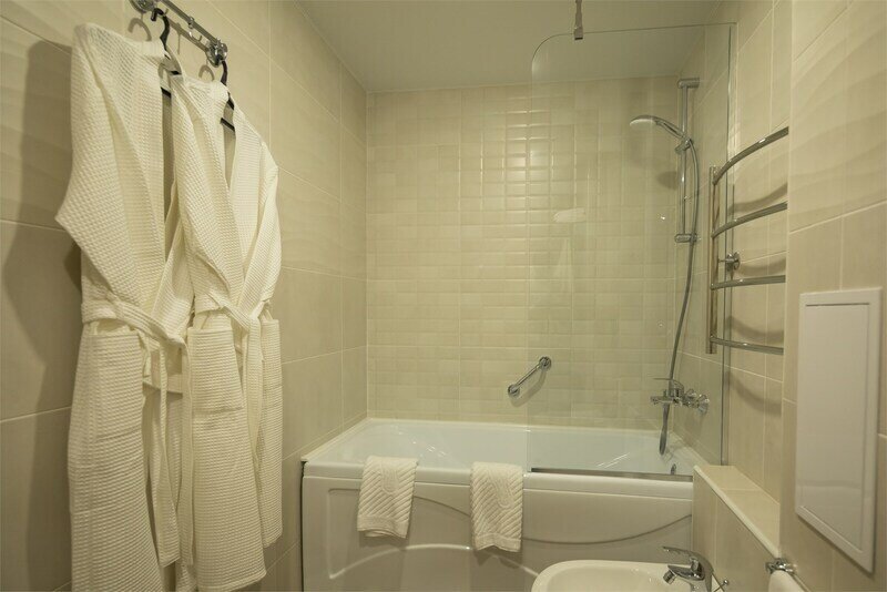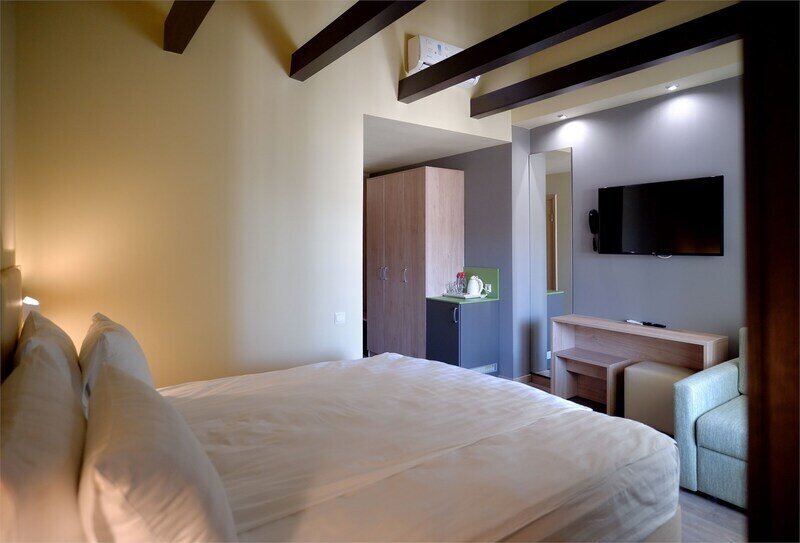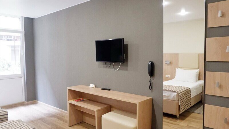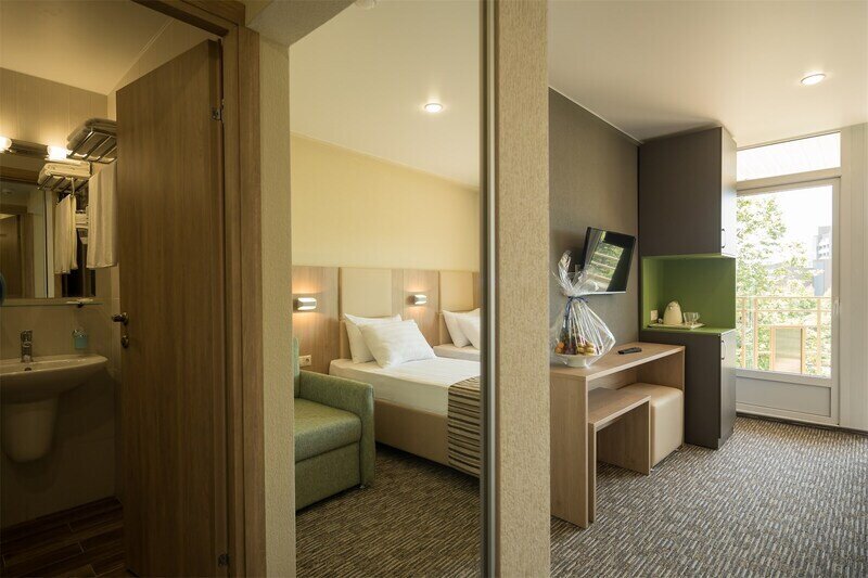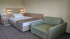 В номере: две односпальные кровати (90х200) с возможностью соединения в одну двуспальную кровать (180х200), дополнительное место (раскладной диван), совмещенный санузел.