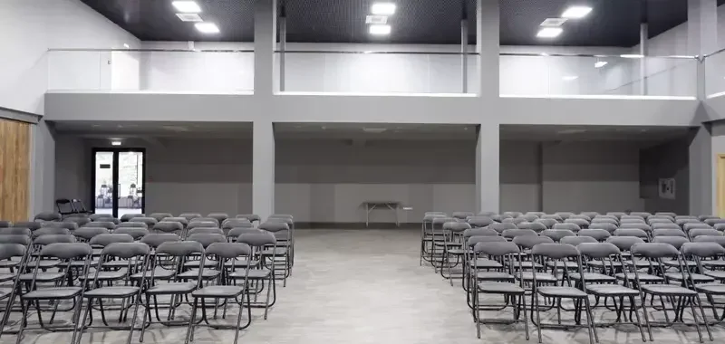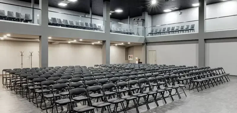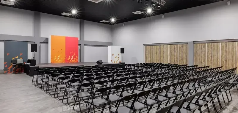 Новый прекрасно оснащённый многофункциональный зал, который подходит для любого типа мероприятий: форумов, симпозиумов, выставок, пресс-конференций, лекториев, организации концертных программ и демонстрации кинофильмов. Планировочное решение конференц-зала позволяет организовать отдельное функциональное рабочее пространство как для 100, так и для 500 участников. Площадь зала 350 м² 1-й этаж + 85 м² балкон.