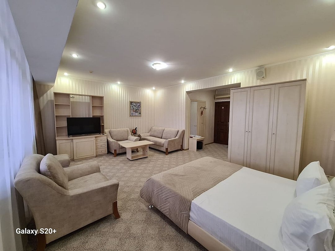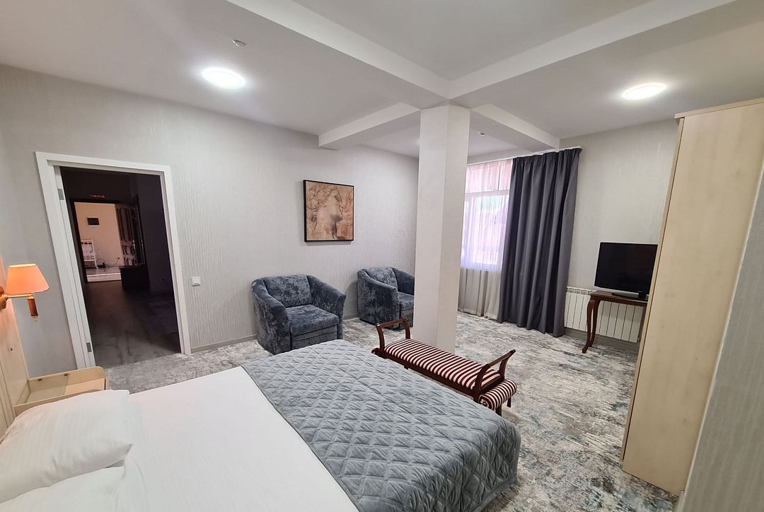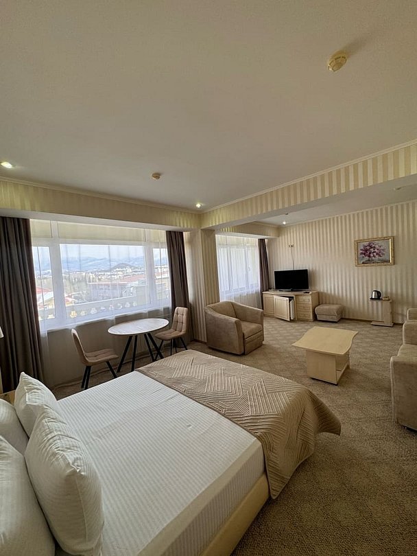 Комфортабельный номер оснащён двуспальной кроватью, диваном и креслами, а так же всеми необходимыми удобствами для комфортного проживания. С меблированного балкона открывается живописный вид на горы.В номере