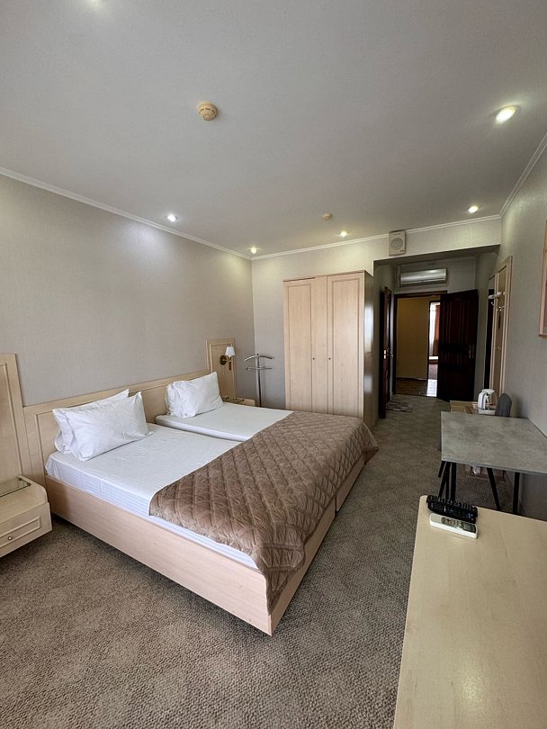 Расположение номеров со второго этажа .Все стандартные номера расположены с видом на город ,в каждом номере есть балкон. На балконе можно курить с условием ,что дым не помешает гостям из соседнего номера .Балкон у каждого номера отделен перегородкой и оснащен пластиковым столиком и креслами .В каждом номере есть кондиционер ,телевизор ,маленький холодильник (расположенный в шкафчике под телевизором)чайник ,фен. В стандартный номер укомплектован бельевым шкафом с сейфом, ,двуспальной кроватью ,журнальным столиком ,шкафчиком с холодильником и пуфиком. Телевизор подключен к 20 цифровым федеральным каналам .Запрещено подключать к телевизорам игровые приставки и флэшки. В каждом номере есть противопожарный датчик и колонка оповещения для внештатных ситуаций .В коридорах стоят огнетушители. Полу-люксы или сюиты в большинстве расположены с балконами выходящими на сторону моря и нашего сада. Номер укомплектован бельевым шкафом с сейфом ,диваном двумя креслами журнальным столиком ,двуспальной кроватью ,шкафчиком с холодильником ,в некоторых номерах есть письменный стол ,при бронировании номера можно попросить разместить такой номер .На балконе можно курить ,не мешая гостям из соседнего номера, балконы разделены перегородкой. В отеле любят располагаться гости с детьми ,просьба соблюдать тишину в здании, в послеобеденное время