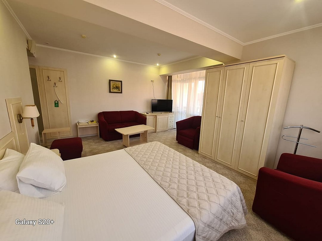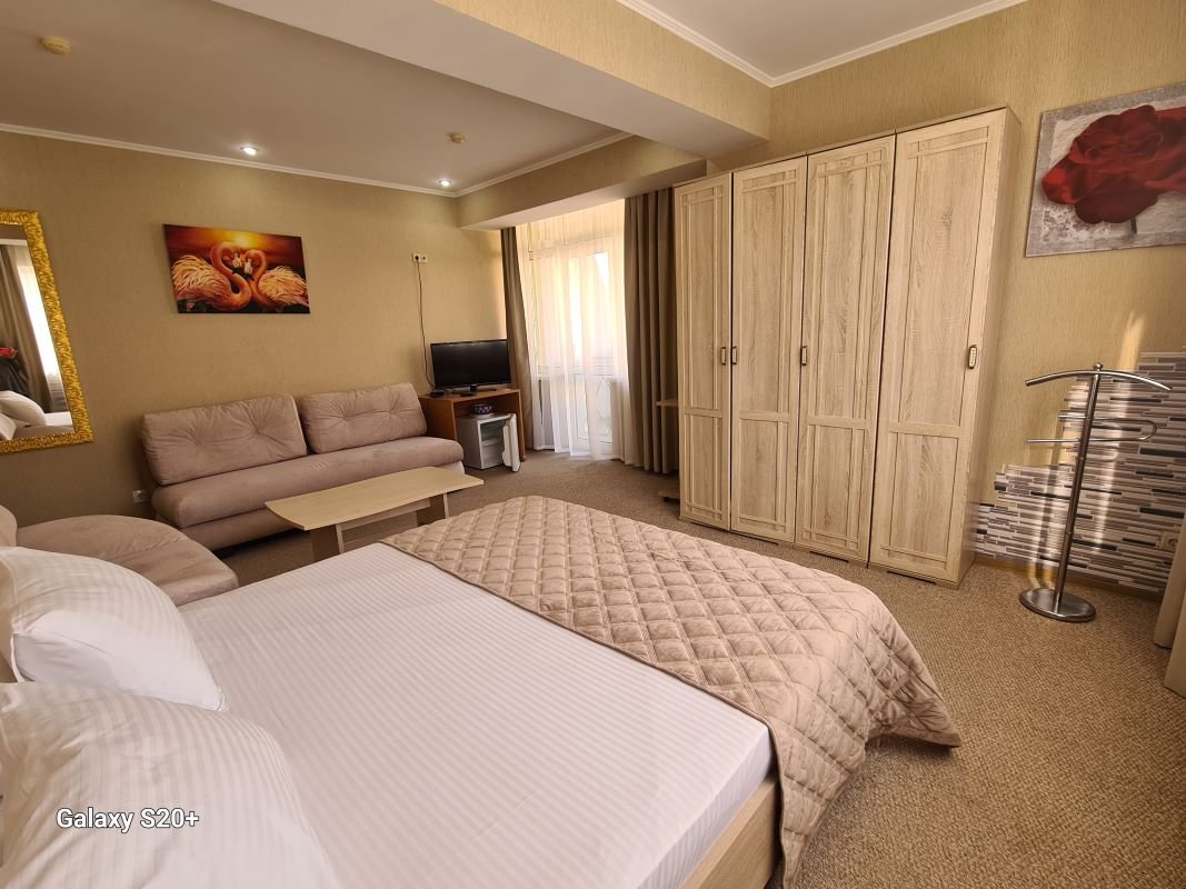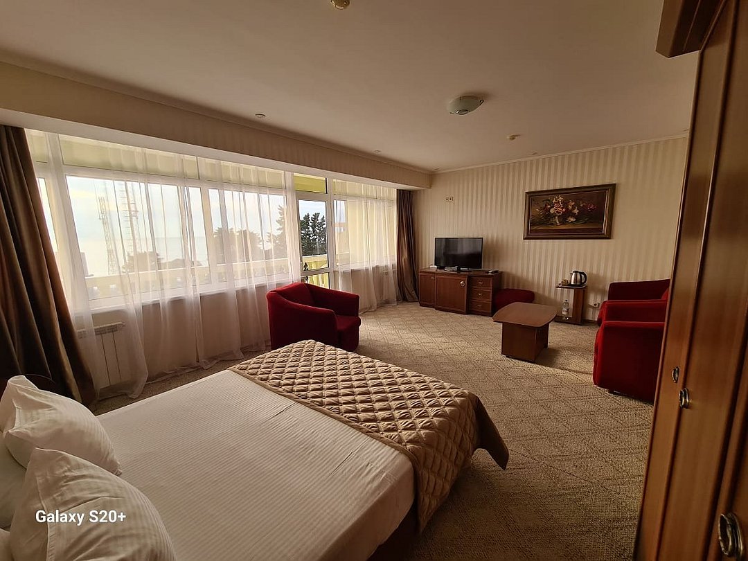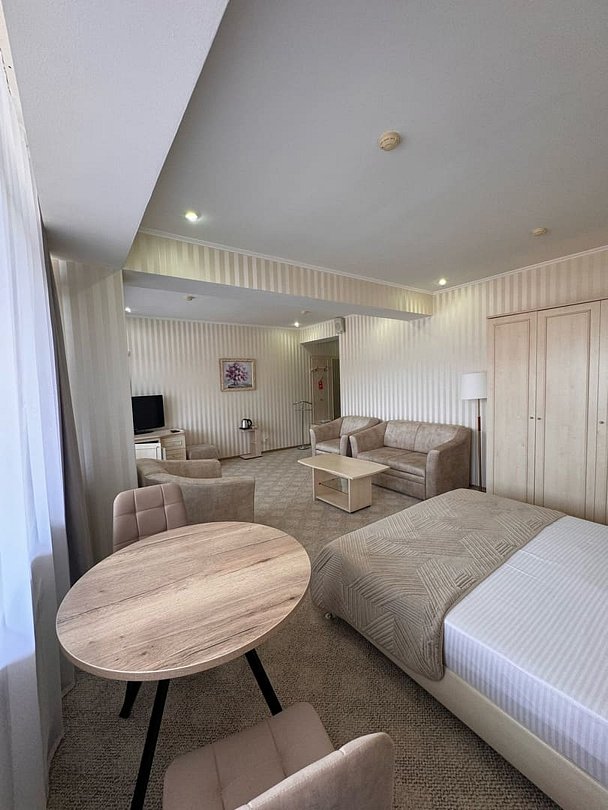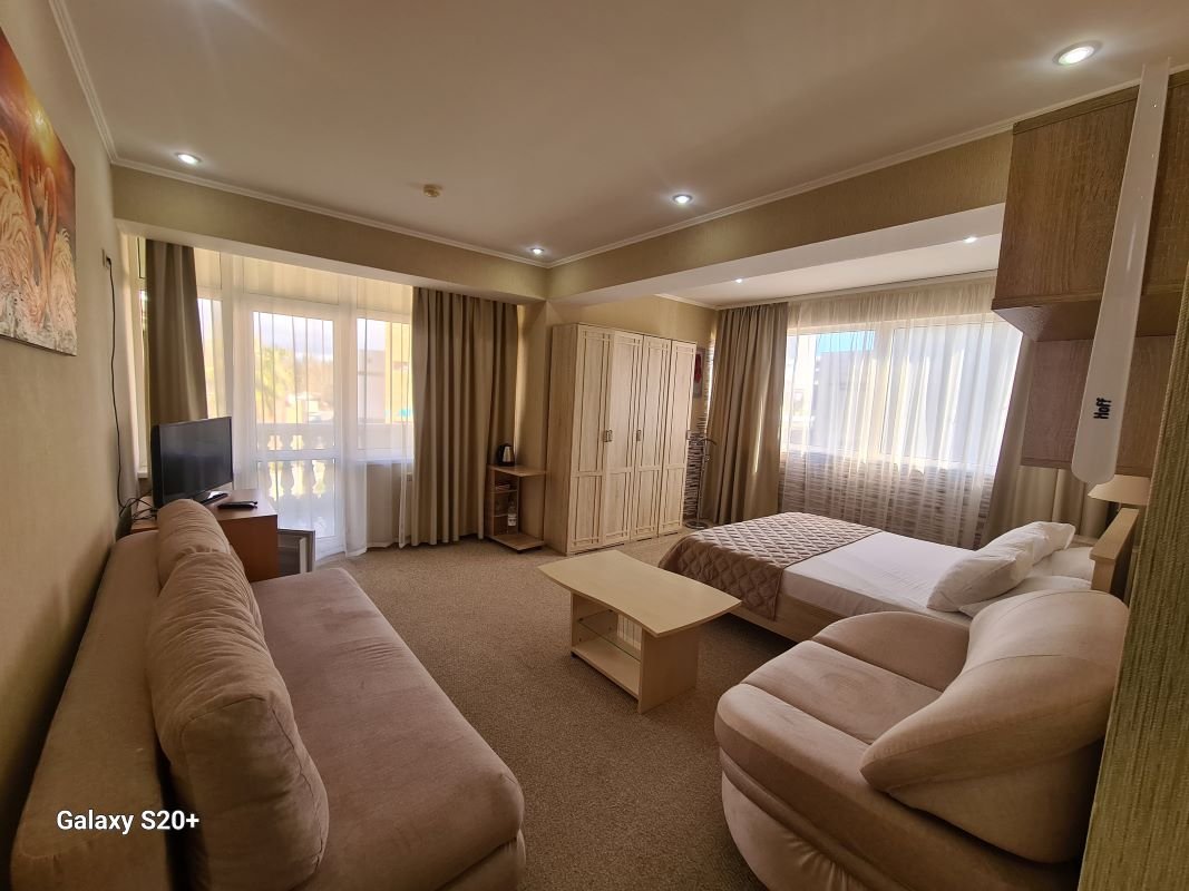 Комфортабельный номер оснащён двуспальной кроватью, диваном и креслами, а так же всеми необходимыми удобствами для комфортного проживания. С меблированного балкона открывается живописный вид на мореВ номере