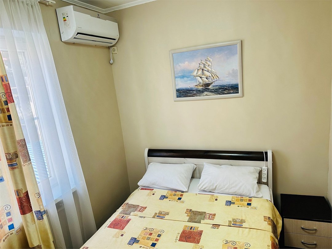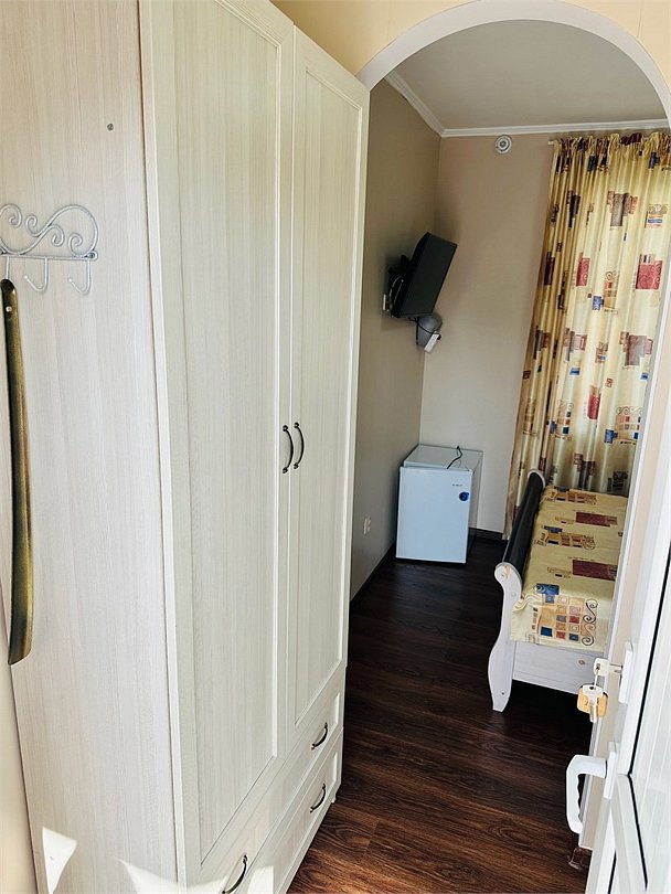 телевизор, кабельное телевидение, Wi-Fi, холодильник, фен, ванная комната, двуспальная кровать, тумбы, шкаф для одежды, вешалки, унитаз, раковина, вид во двор, ламинат, стул, стол, туалетные средства, сплит-система, москитная сетка, гостиничная парфюмерия, номер для некурящих, мылоВ гостиничном номере