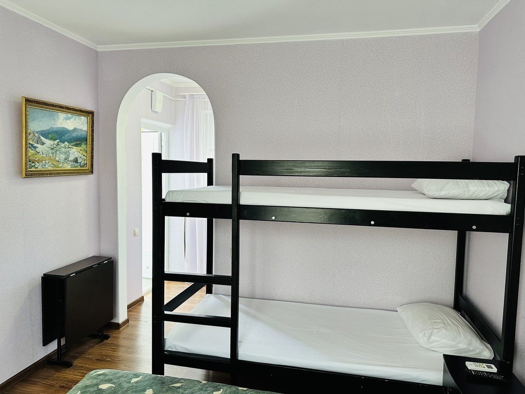 Четырёхместный номер с двуспальной и двухъярусной кроватями.Услуги и удобства