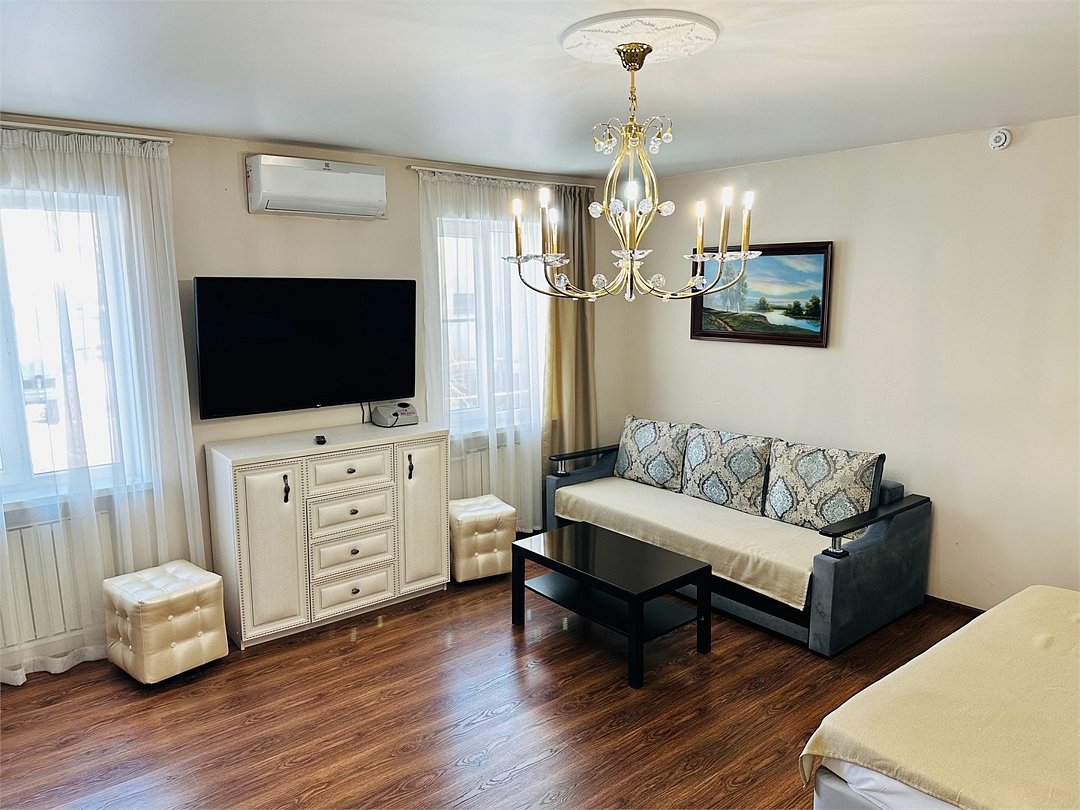 кабельное телевидение, Wi-Fi, холодильник, фен, ванная комната, банные полотенца, тапочки, кровать «King size», диван, тумбы, шкаф для одежды, вешалки, журнальный столик, комод, пуфики, унитаз, раковина, вид во двор, стол, туалетные средства, сплит-система, диван-кровать, раскладной диван, телевизор с плоским экраном, гостиничная парфюмерия, мыло, зеркало в полный ростВ гостиничном номере