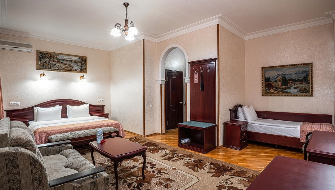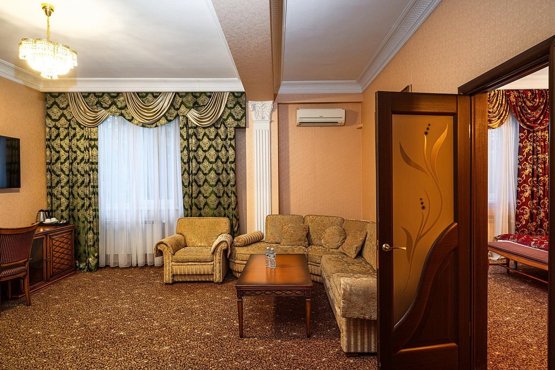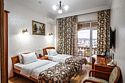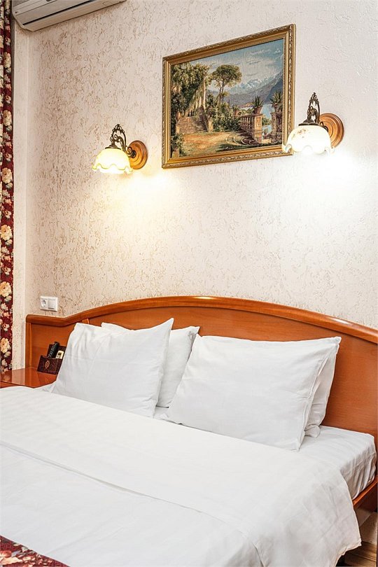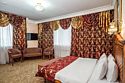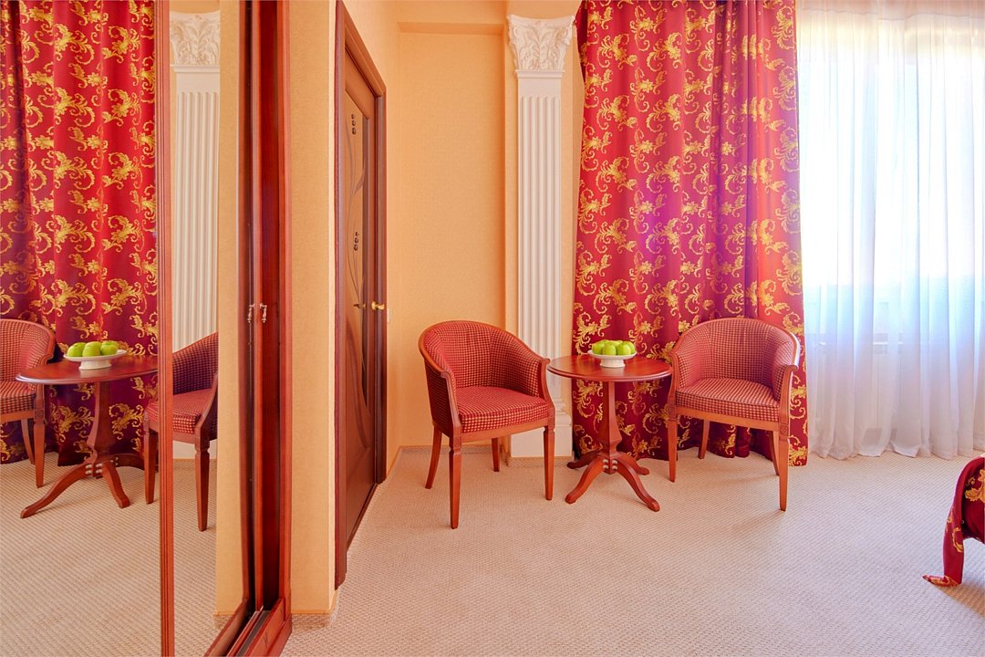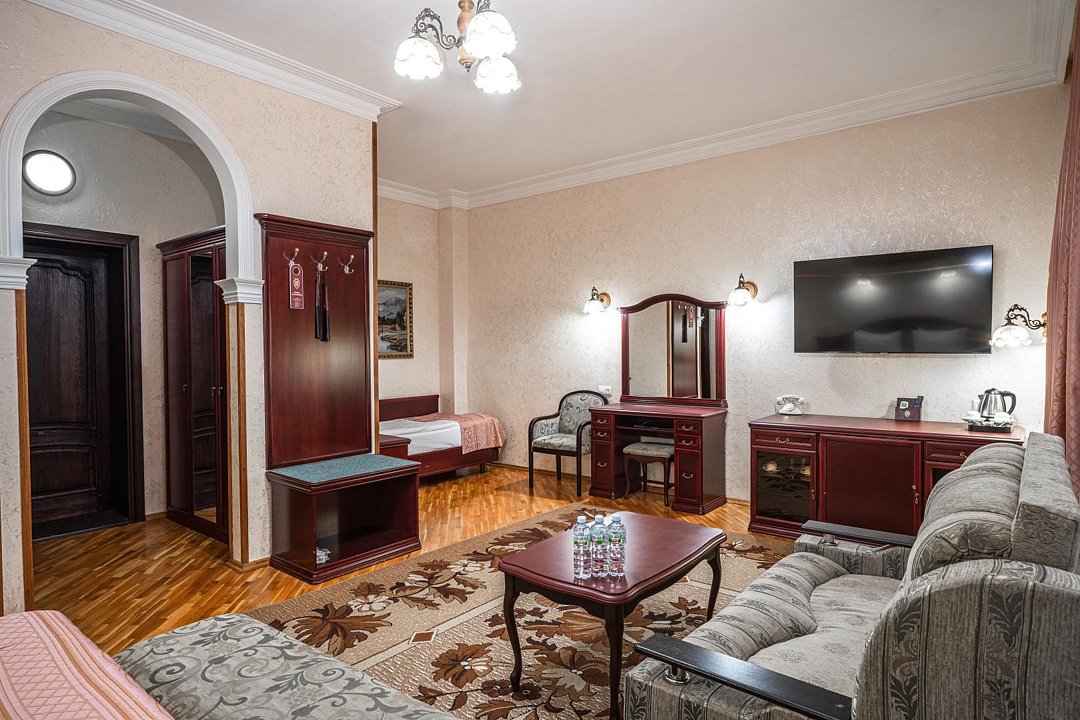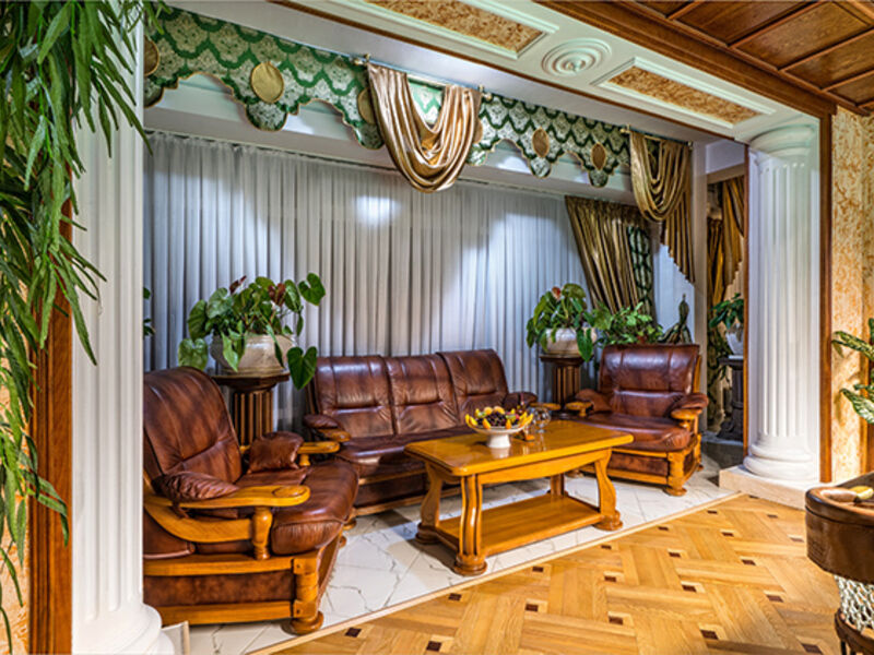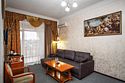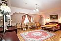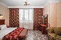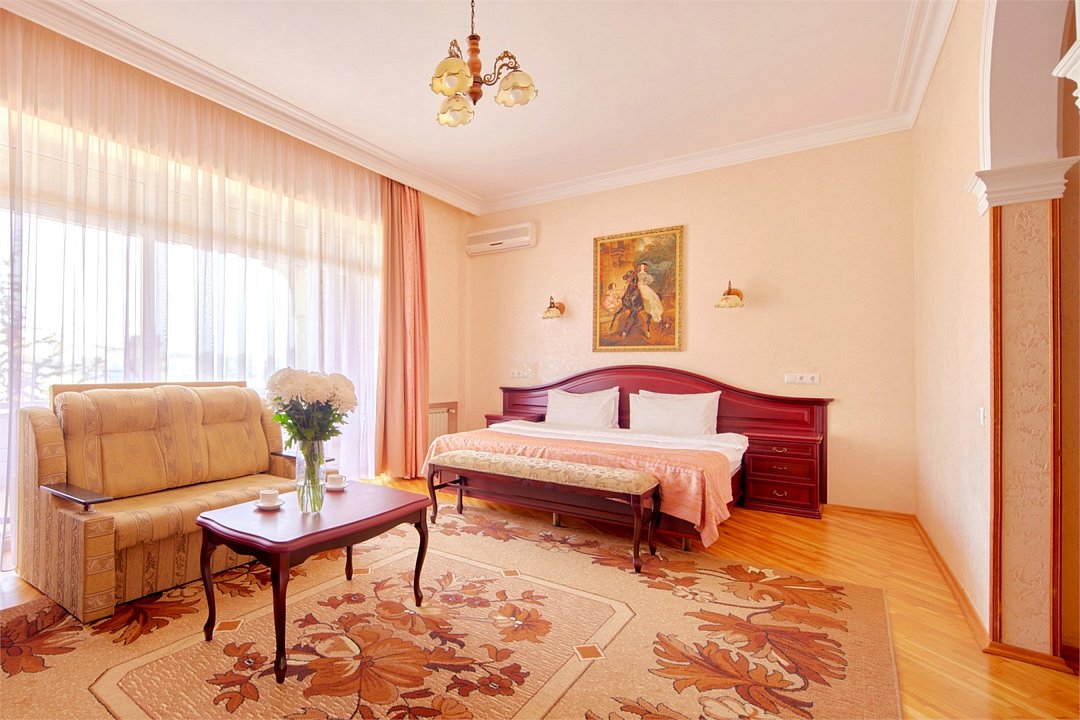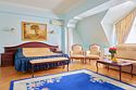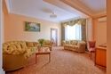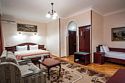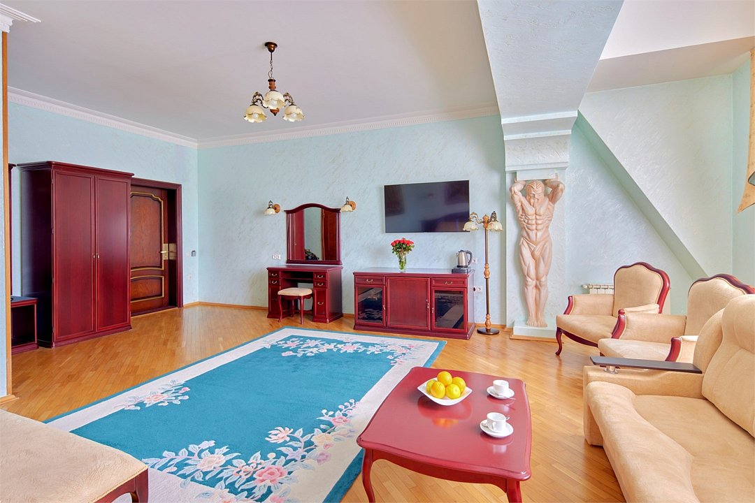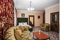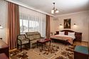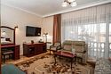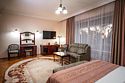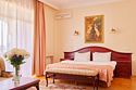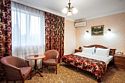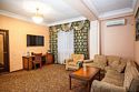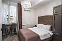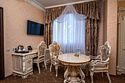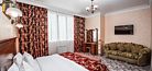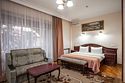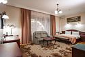 Маэстро - Очень уютный просторный номер площадью 45 м2 для комфортного размещения до 3-х человек. Номера оформлены в спокойных и гармоничных тонах, что создает приятную атмосферу для отдыха. В номере имеется двуспальная кровать, 2 кресла, пуфик, раскладной диван, журнальный столик, прикроватные тумбы, диван и многое другое. Уникальное сочетание комфорта, стиля и удобства ждет Вас здесь! Итальянская мебель придает номеру приятный шарм. Удобная ванна позволит с комфортом помыться и расслабиться.Услуги и удобства
