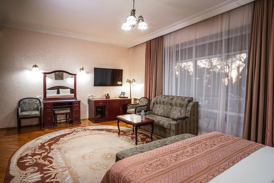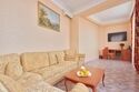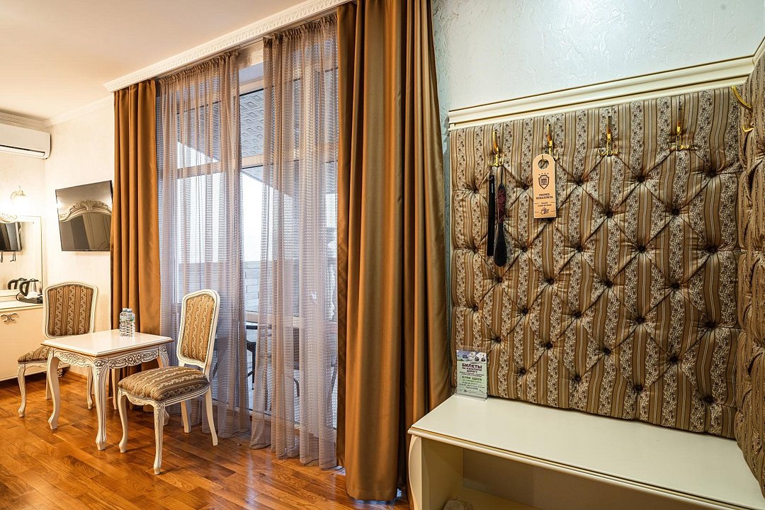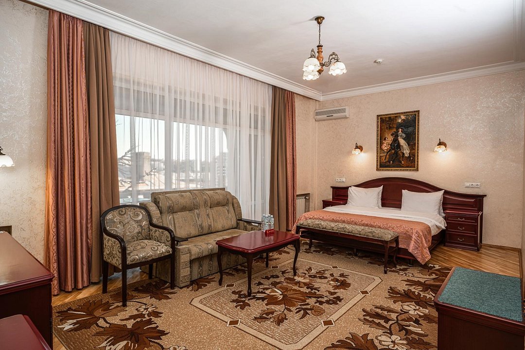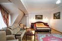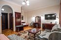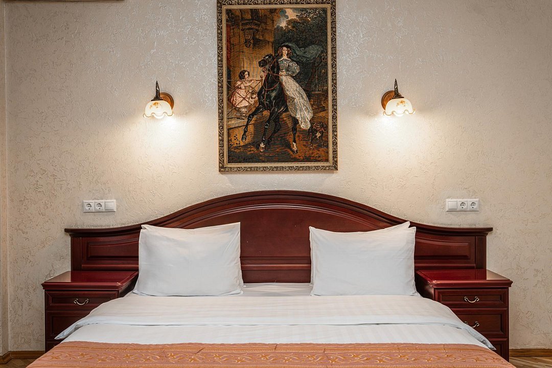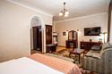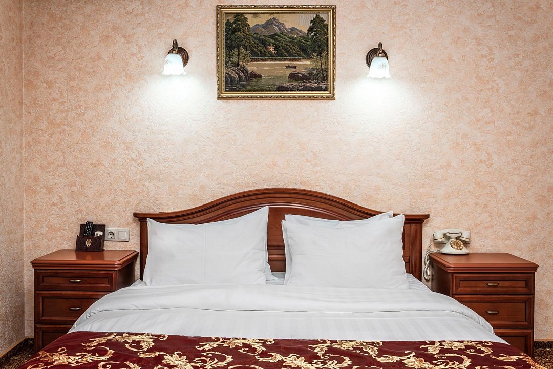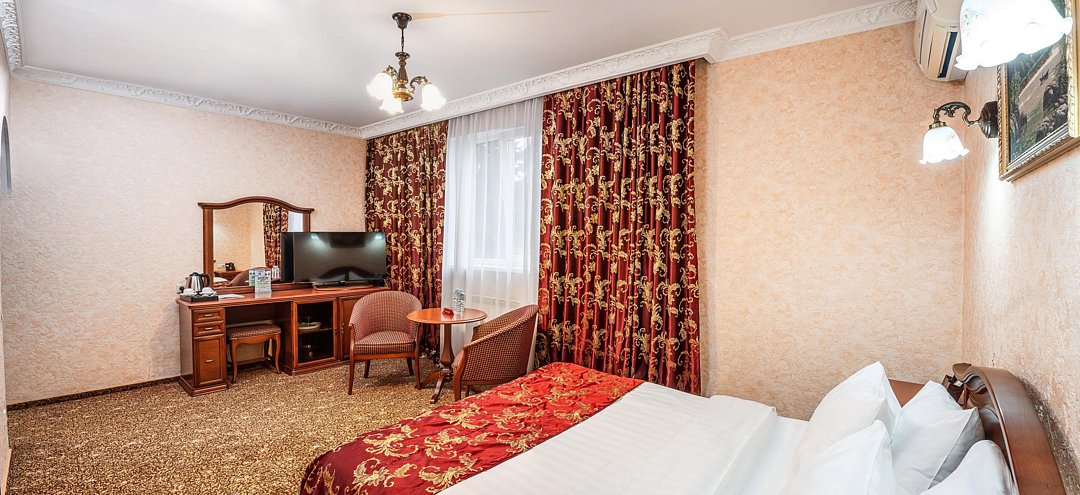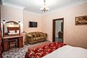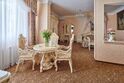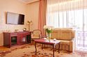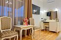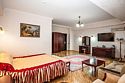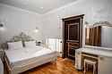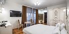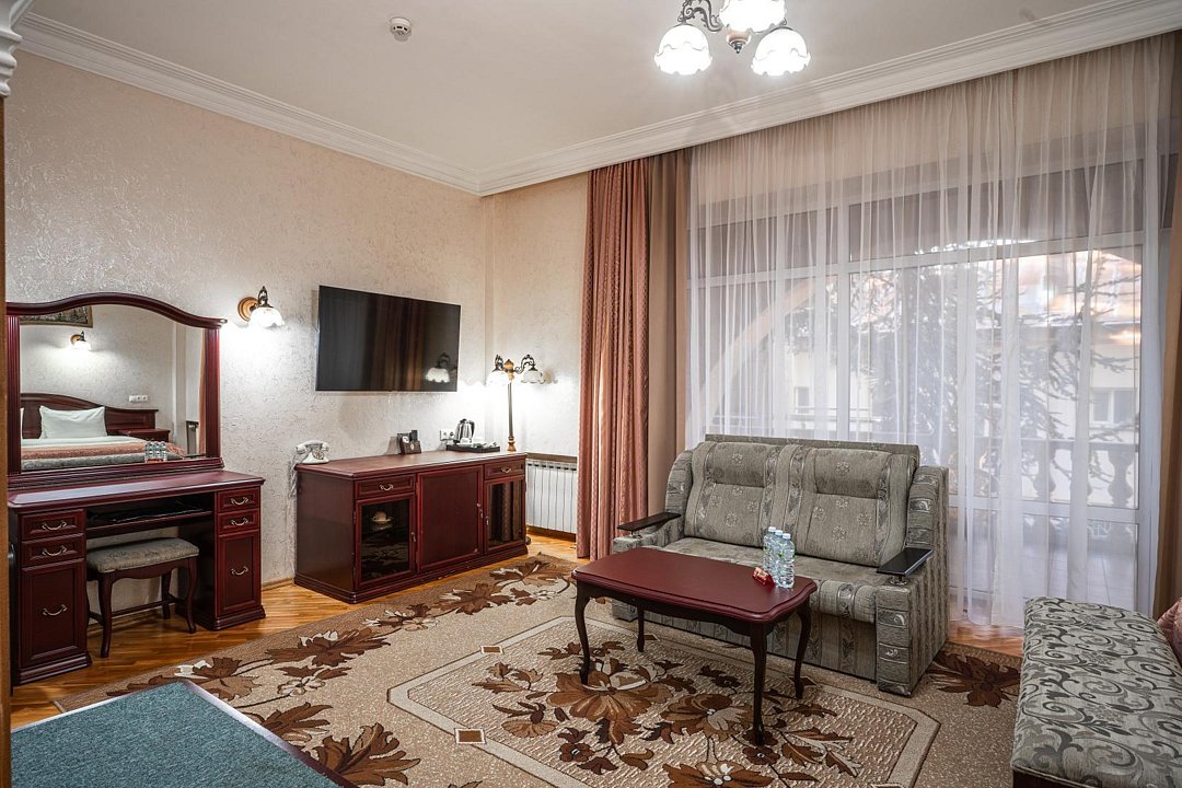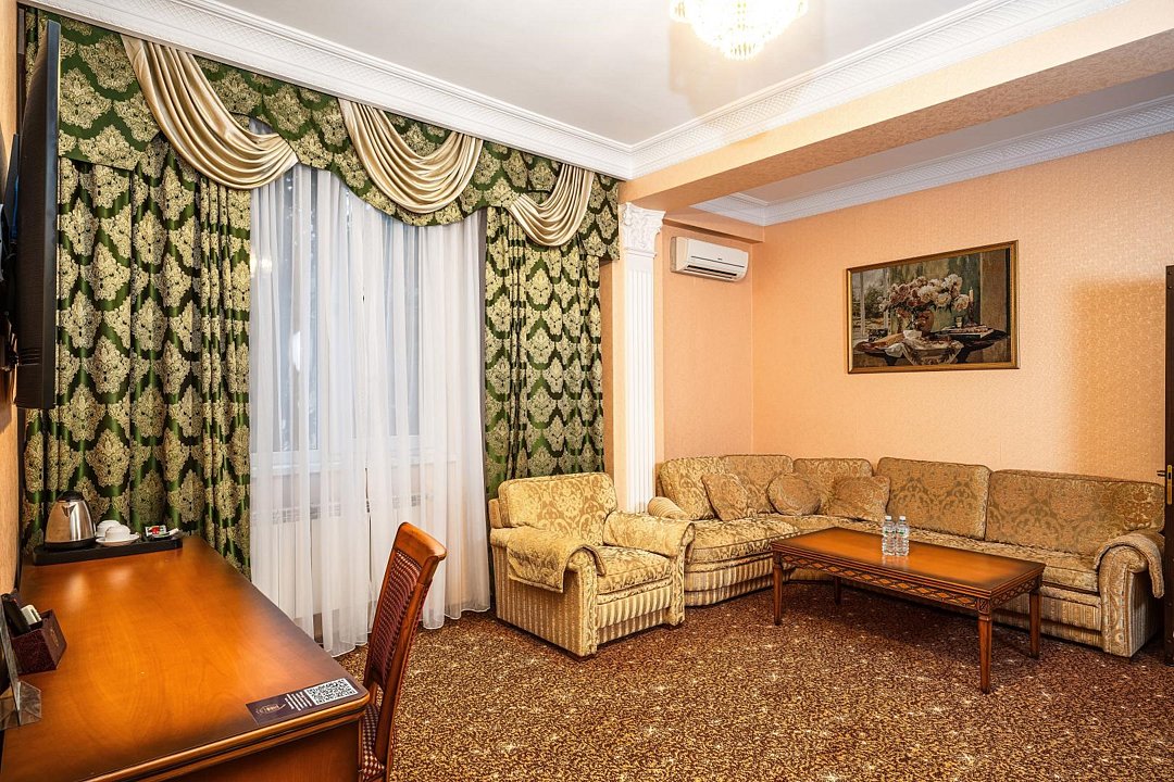 Маэстро - Очень уютный просторный номер площадью 45 м2 для комфортного размещения до 3-х человек. Номера оформлены в спокойных и гармоничных тонах, что создает приятную атмосферу для отдыха. В номере имеется двуспальная кровать, 2 кресла, пуфик, раскладной диван, журнальный столик, прикроватные тумбы, диван и многое другое. Уникальное сочетание комфорта, стиля и удобства ждет Вас здесь! Итальянская мебель придает номеру приятный шарм. Удобная ванна позволит с комфортом помыться и расслабиться.Услуги и удобства