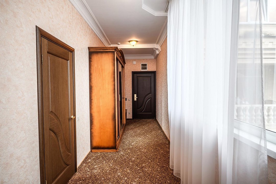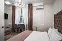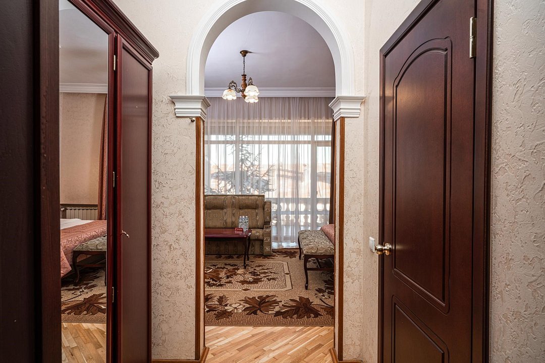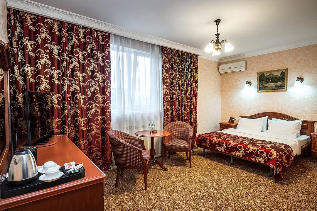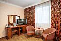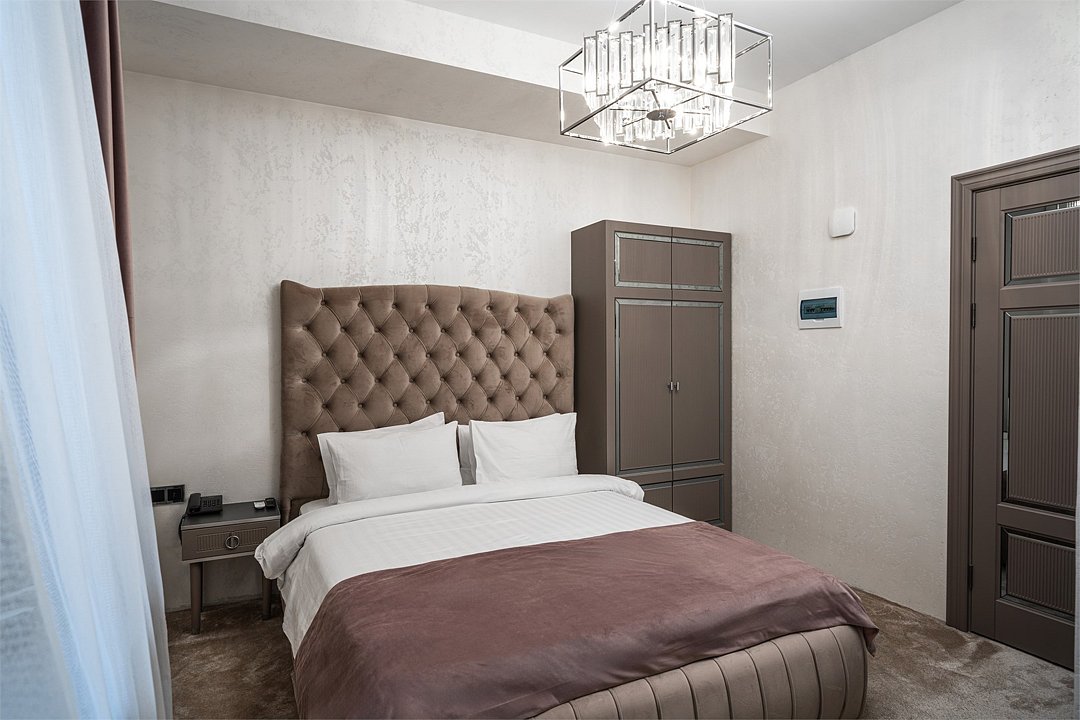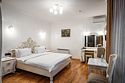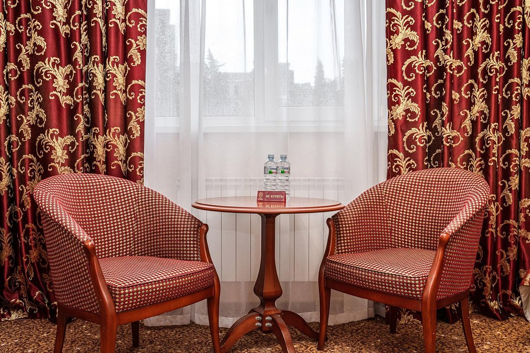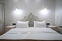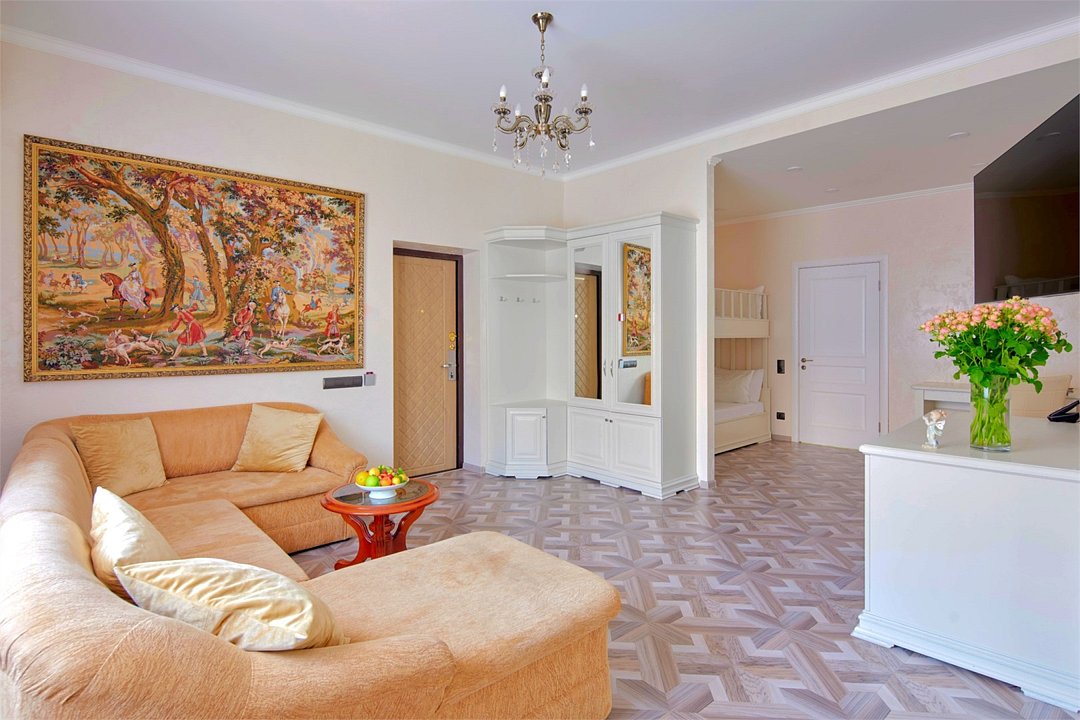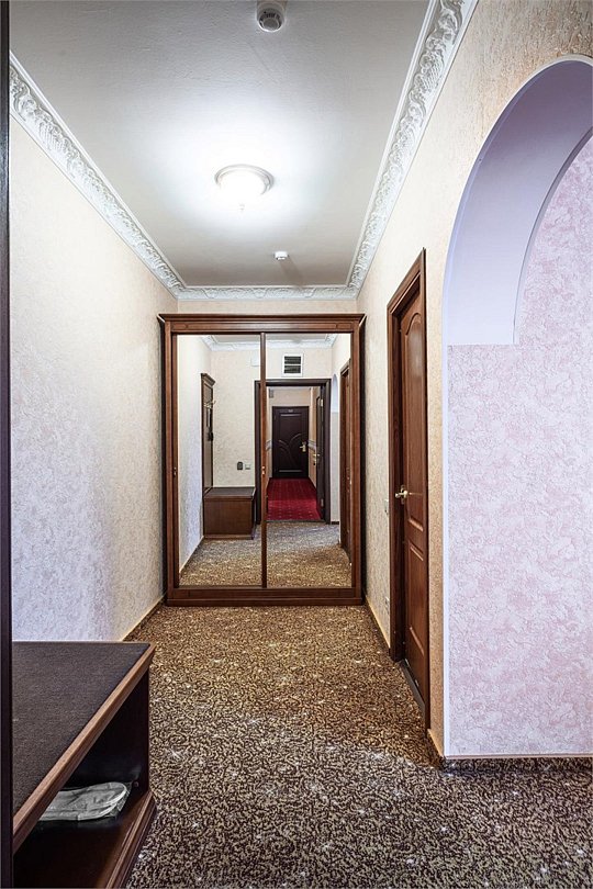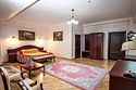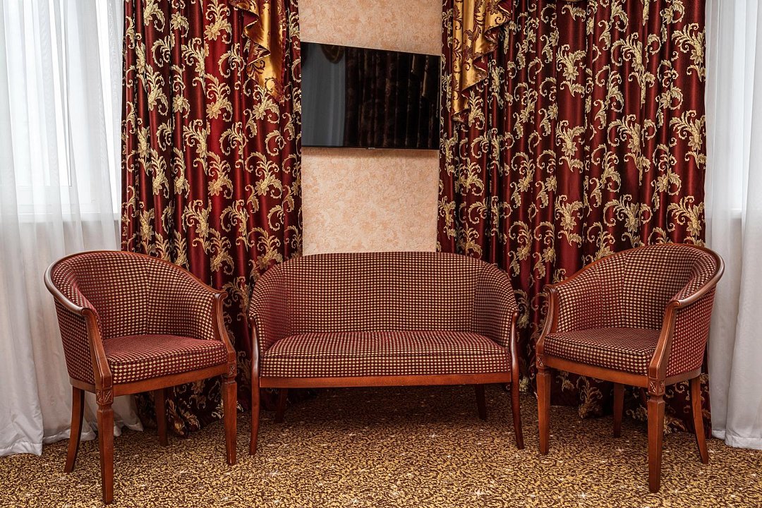 Маэстро - Очень уютный просторный номер площадью 45 м2 для комфортного размещения до 3-х человек. Номера оформлены в спокойных и гармоничных тонах, что создает приятную атмосферу для отдыха. В номере имеется двуспальная кровать, 2 кресла, пуфик, раскладной диван, журнальный столик, прикроватные тумбы, диван и многое другое. Уникальное сочетание комфорта, стиля и удобства ждет Вас здесь! Итальянская мебель придает номеру приятный шарм. Удобная ванна позволит с комфортом помыться и расслабиться.Услуги и удобства