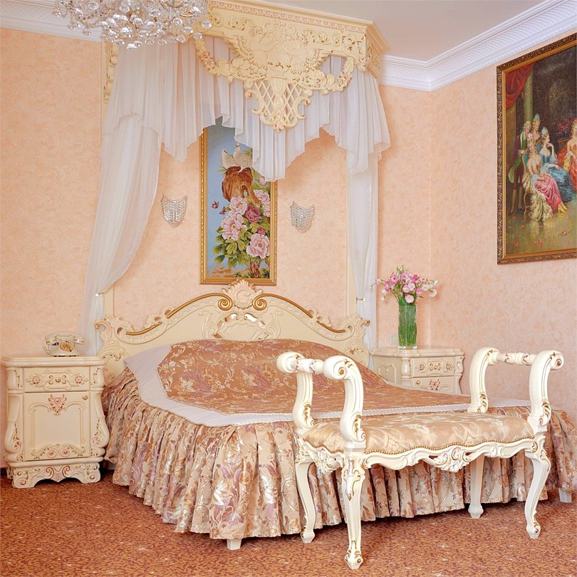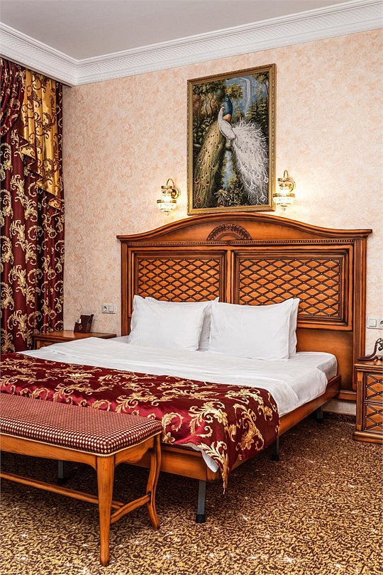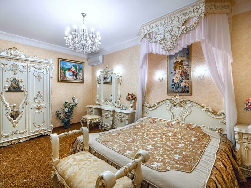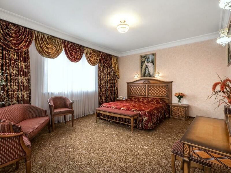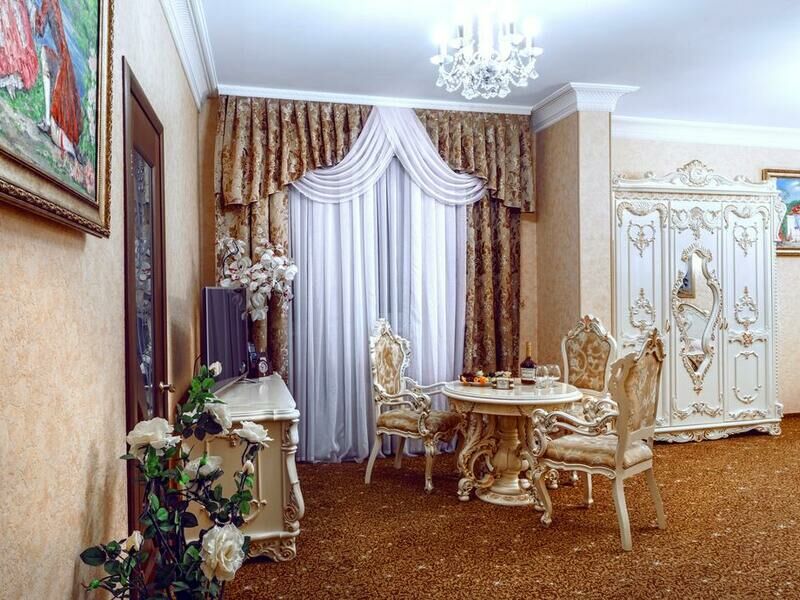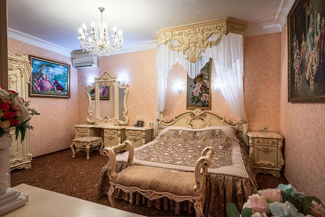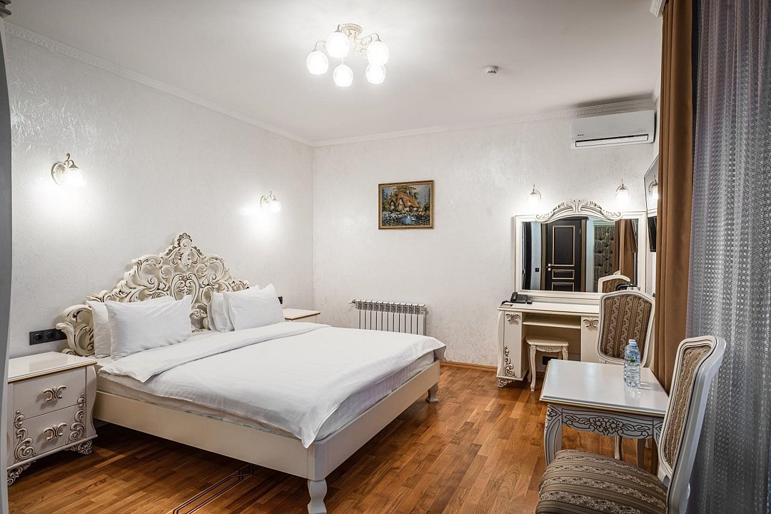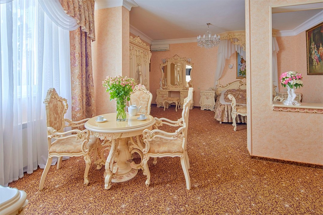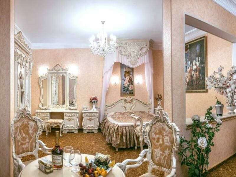 Королевский Люкс - чудесный просторный номер площадью 35 м2 с изысканным дизайном в светлой цветовой гамме. Тщательно подобранная авторская итальянская мебель идеально гармонирует между собой и подходит для особенных людей и исключительных событий. В номере Вас ждет чудесная двуспальная кровать, журнальный столик, прикроватные тумбы, трюмо с зеркалом и многое другое для Вашего максимального комфорта. В ванной комнате для Вас джакузи, душевая кабина, биде и вся необходимая косметика.Услуги и удобства