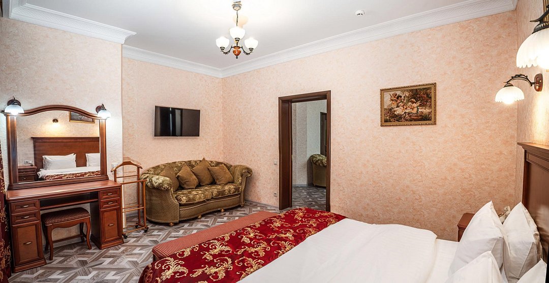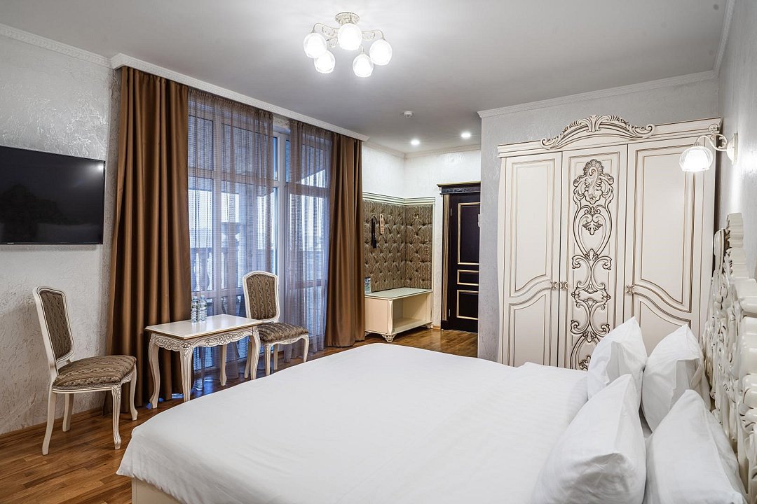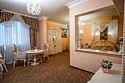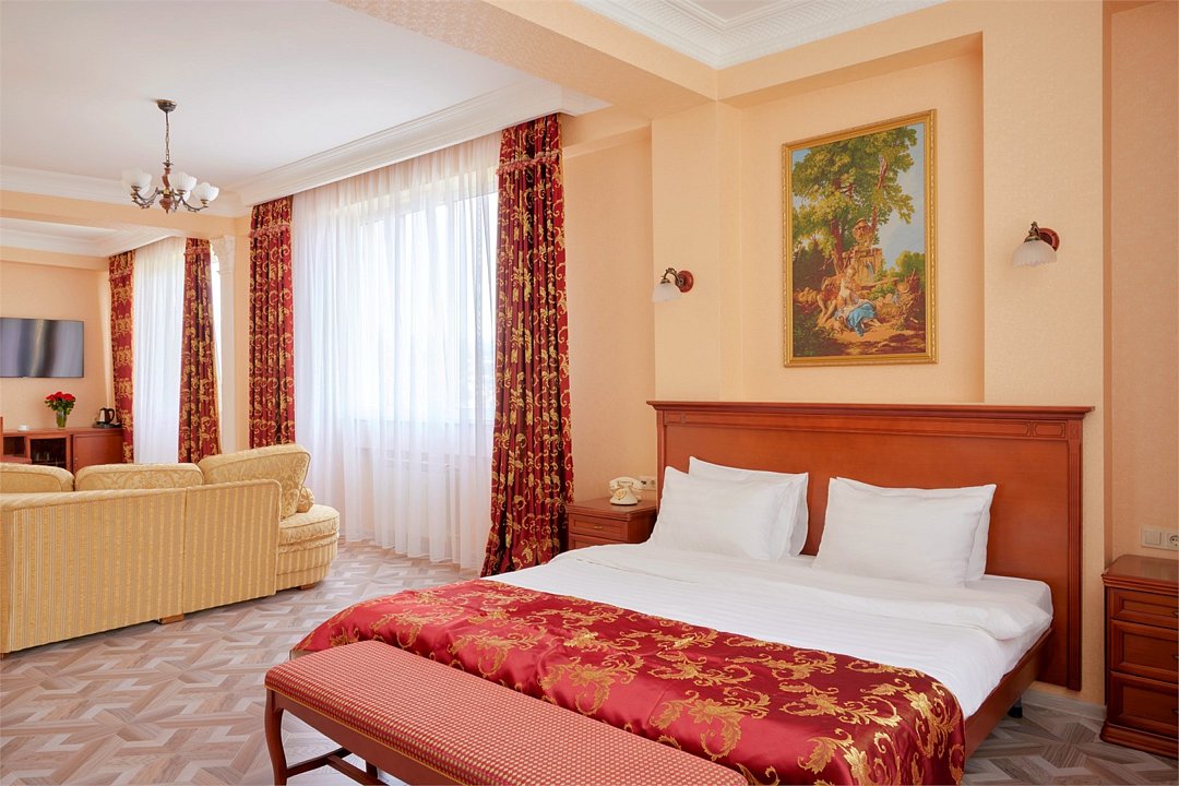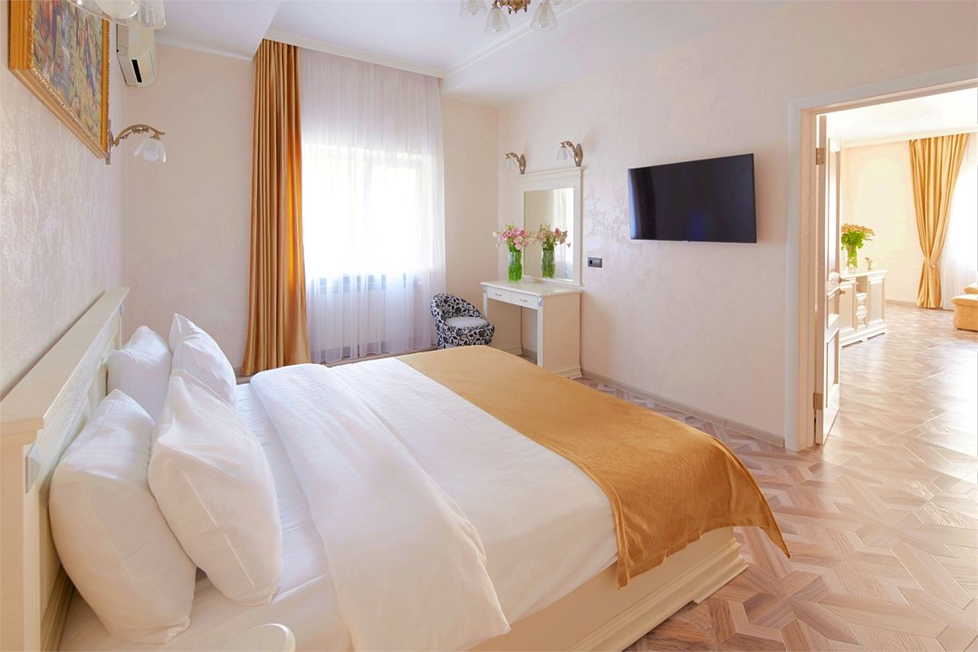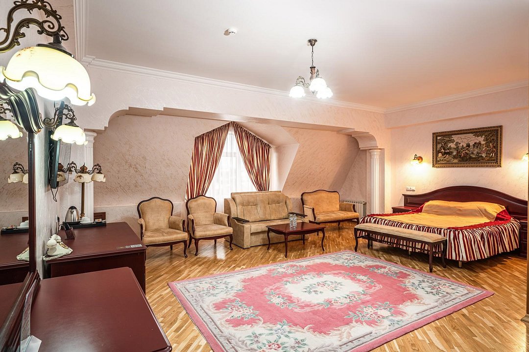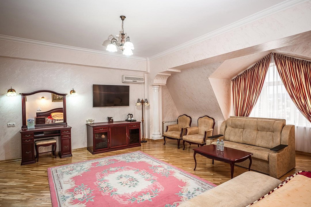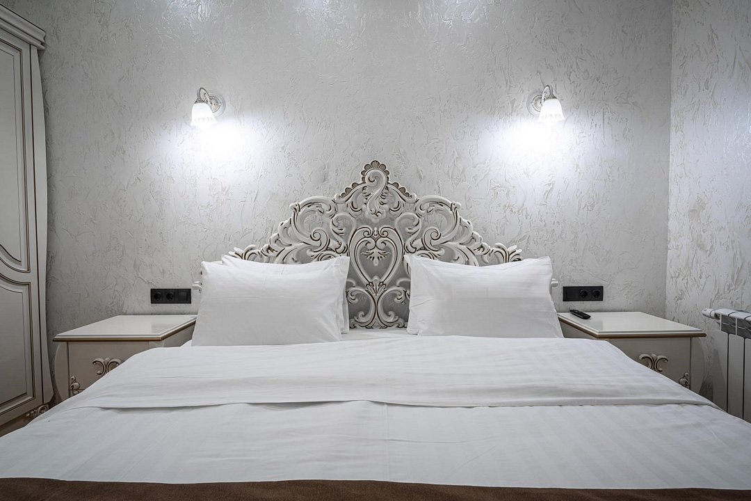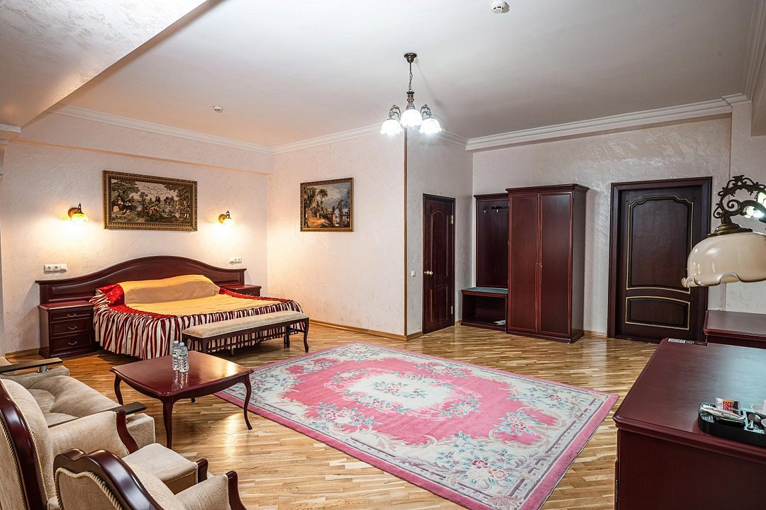Королевский Люкс - чудесный просторный номер площадью 35 м2 с изысканным дизайном в светлой цветовой гамме. Тщательно подобранная авторская итальянская мебель идеально гармонирует между собой и подходит для особенных людей и исключительных событий. В номере Вас ждет чудесная двуспальная кровать, журнальный столик, прикроватные тумбы, трюмо с зеркалом и многое другое для Вашего максимального комфорта. В ванной комнате для Вас джакузи, душевая кабина, биде и вся необходимая косметика.Услуги и удобства