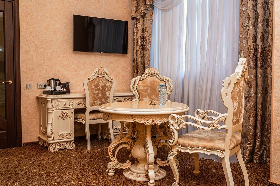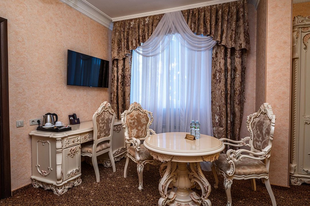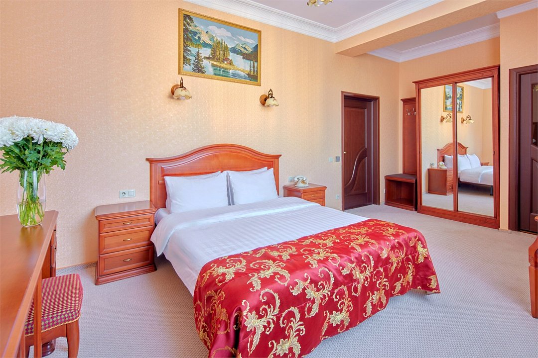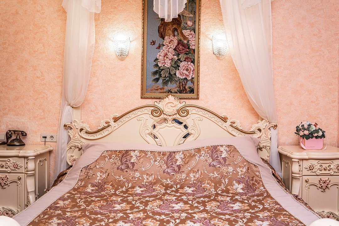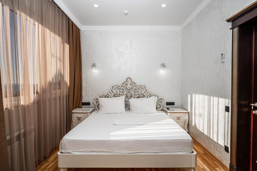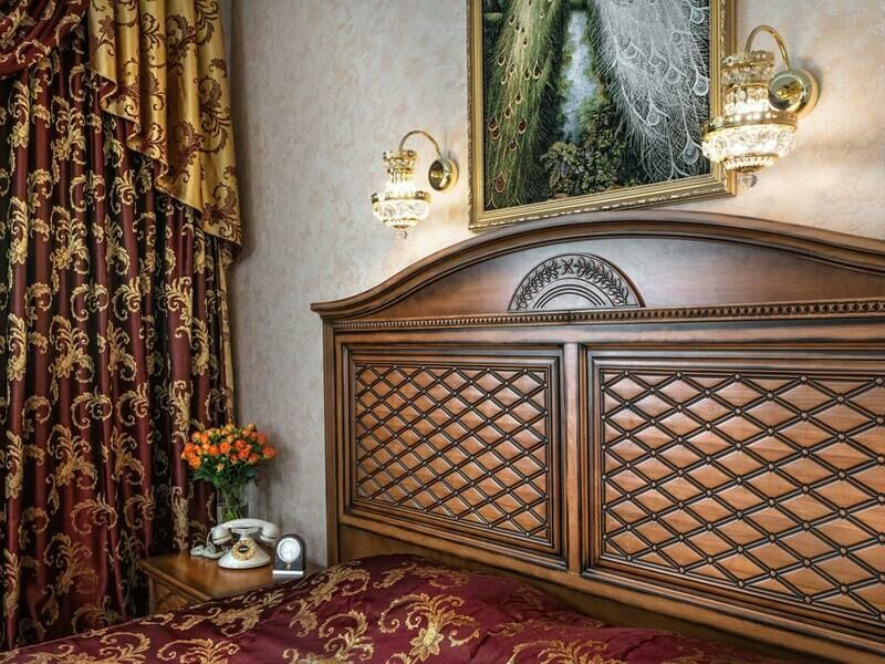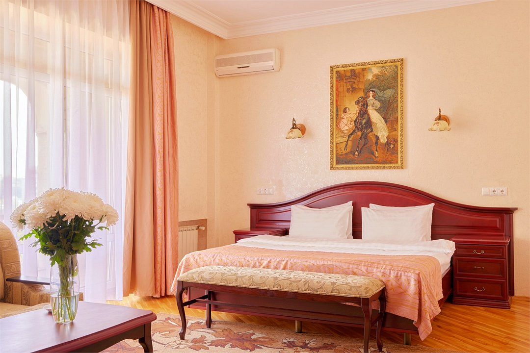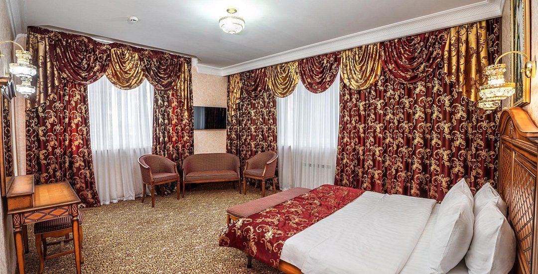 Королевский Люкс - чудесный просторный номер площадью 35 м2 с изысканным дизайном в светлой цветовой гамме. Тщательно подобранная авторская итальянская мебель идеально гармонирует между собой и подходит для особенных людей и исключительных событий. В номере Вас ждет чудесная двуспальная кровать, журнальный столик, прикроватные тумбы, трюмо с зеркалом и многое другое для Вашего максимального комфорта. В ванной комнате для Вас джакузи, душевая кабина, биде и вся необходимая косметика.Услуги и удобства