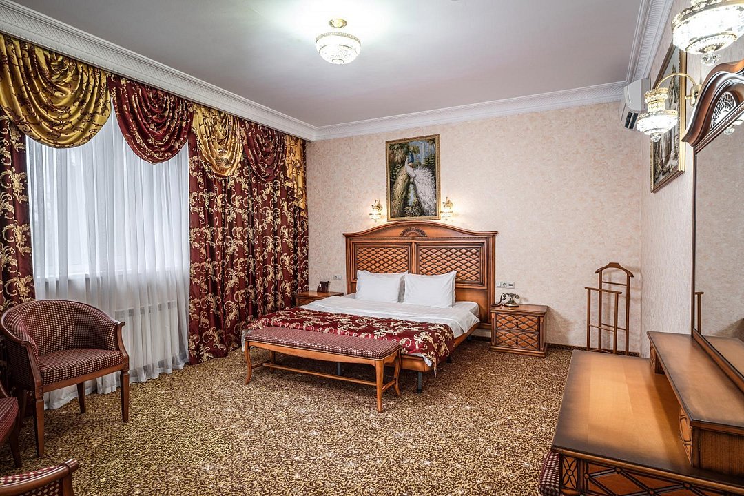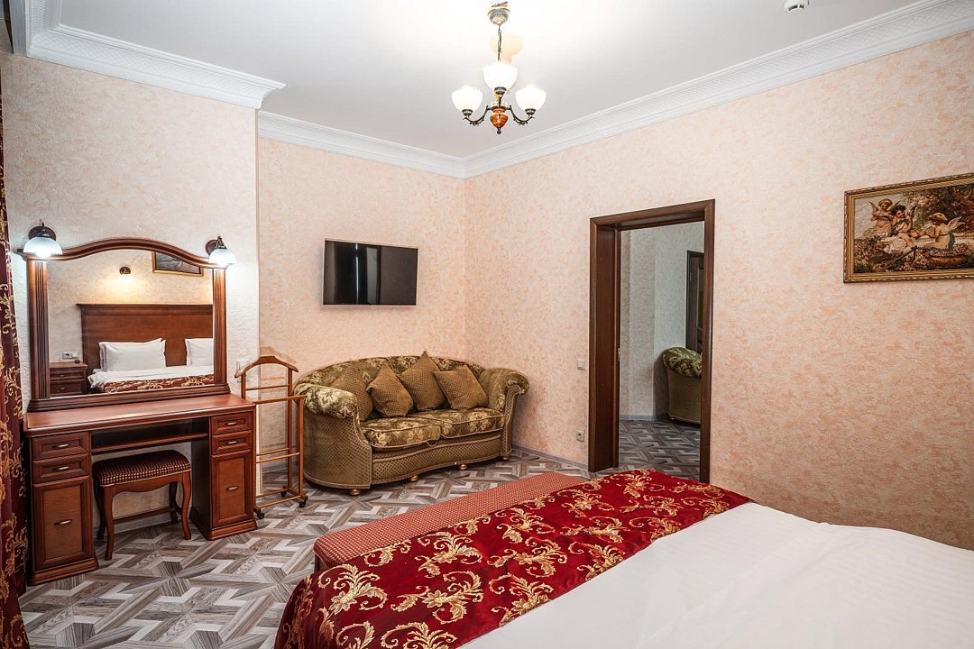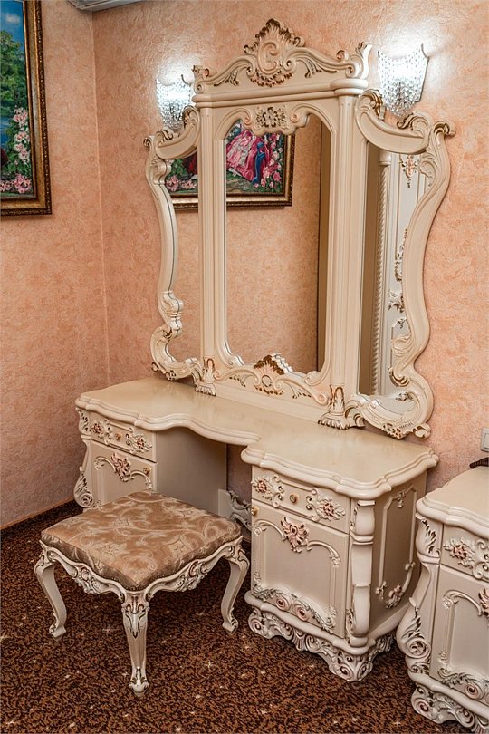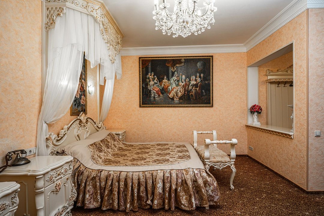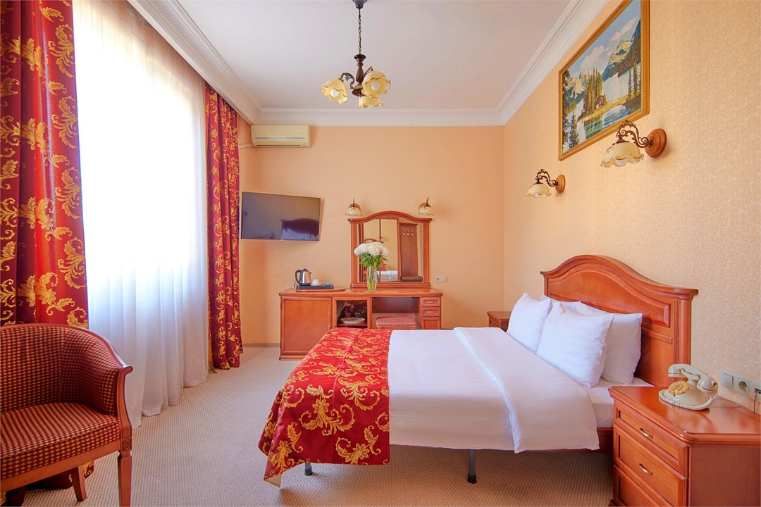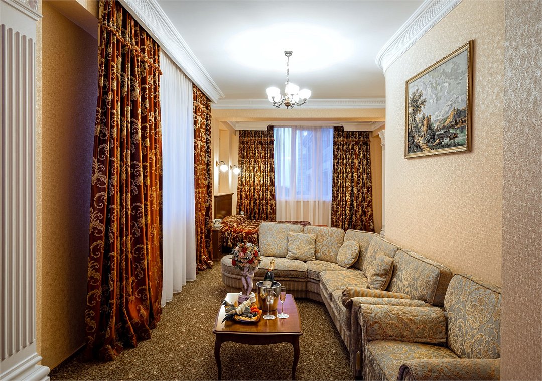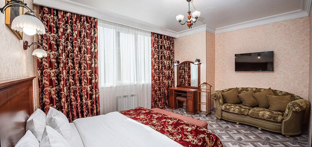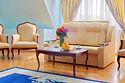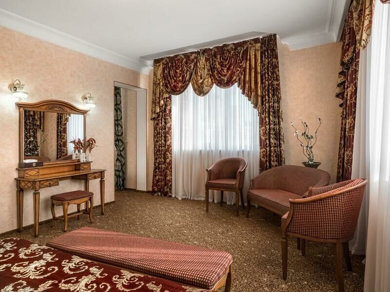Королевский Люкс - чудесный просторный номер площадью 35 м2 с изысканным дизайном в светлой цветовой гамме. Тщательно подобранная авторская итальянская мебель идеально гармонирует между собой и подходит для особенных людей и исключительных событий. В номере Вас ждет чудесная двуспальная кровать, журнальный столик, прикроватные тумбы, трюмо с зеркалом и многое другое для Вашего максимального комфорта. В ванной комнате для Вас джакузи, душевая кабина, биде и вся необходимая косметика.Услуги и удобства