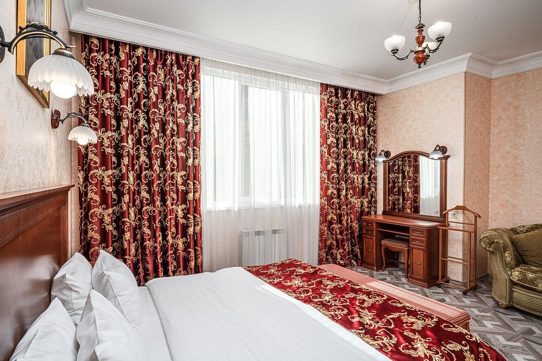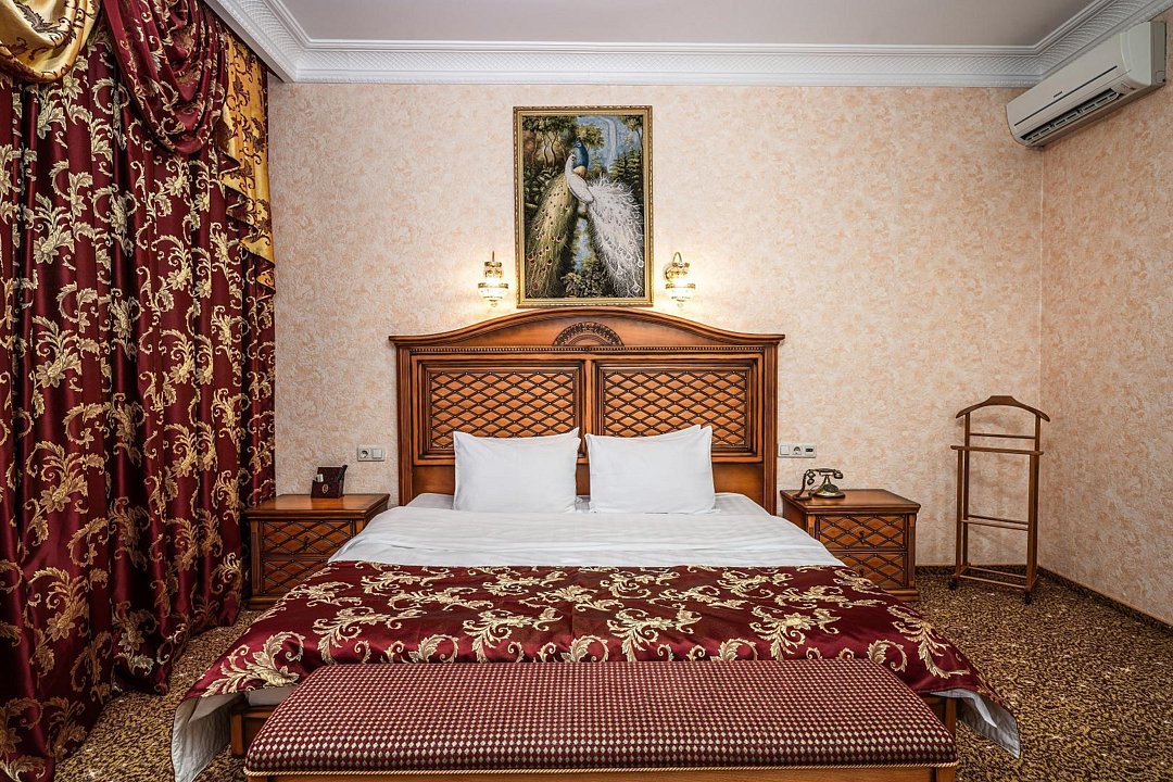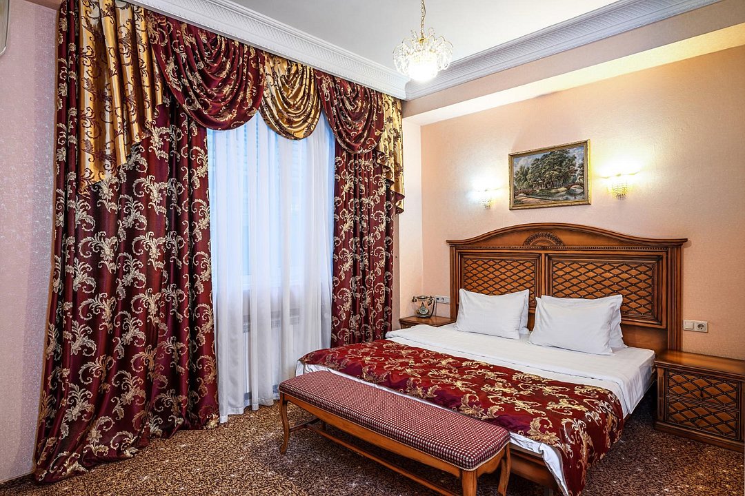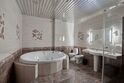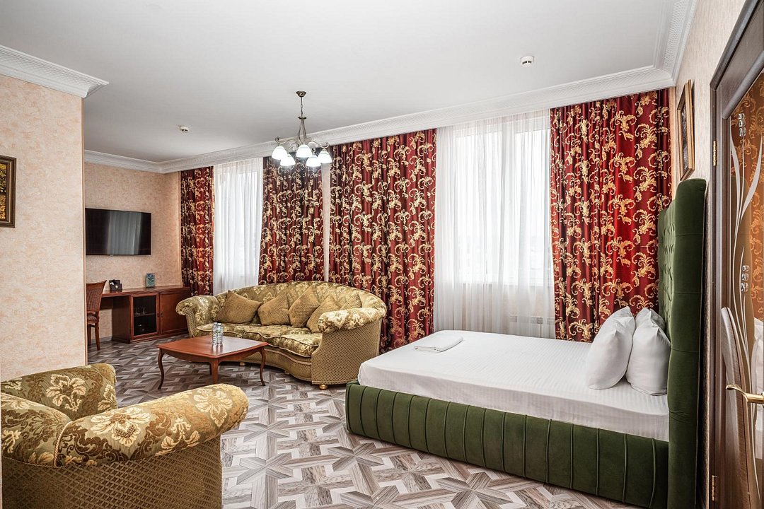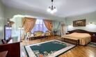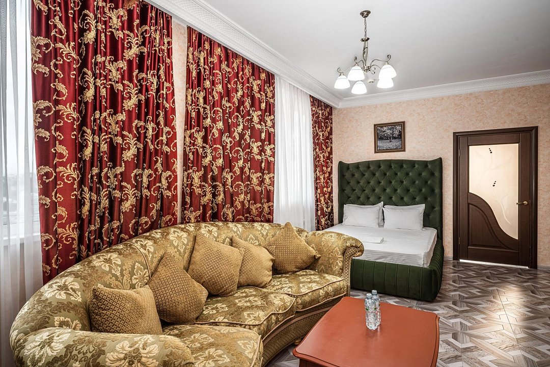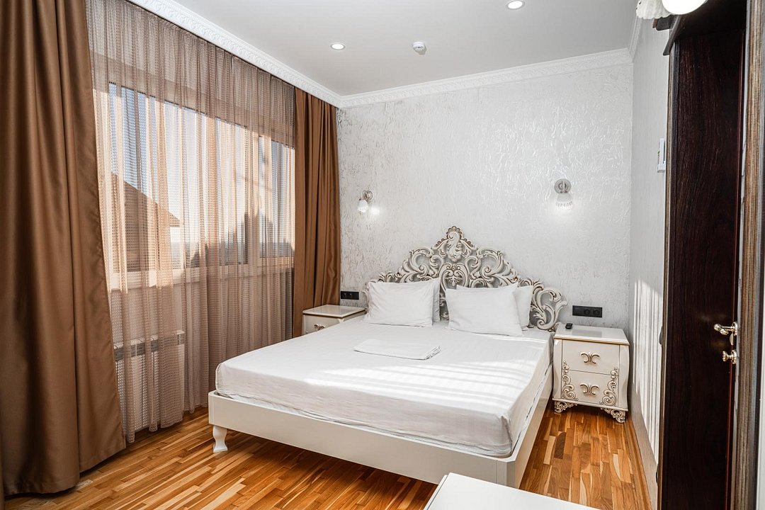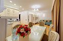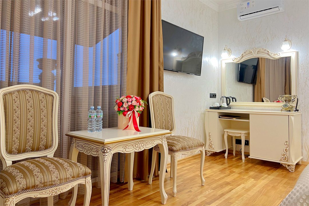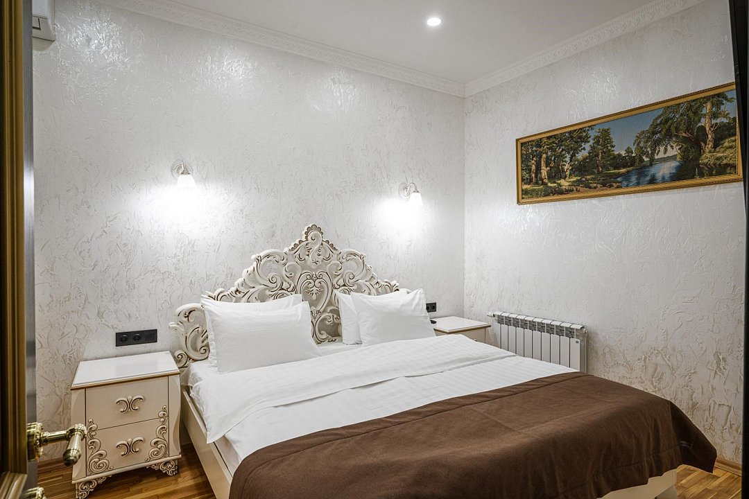 Королевский Люкс - чудесный просторный номер площадью 35 м2 с изысканным дизайном в светлой цветовой гамме. Тщательно подобранная авторская итальянская мебель идеально гармонирует между собой и подходит для особенных людей и исключительных событий. В номере Вас ждет чудесная двуспальная кровать, журнальный столик, прикроватные тумбы, трюмо с зеркалом и многое другое для Вашего максимального комфорта. В ванной комнате для Вас джакузи, душевая кабина, биде и вся необходимая косметика.Услуги и удобства
