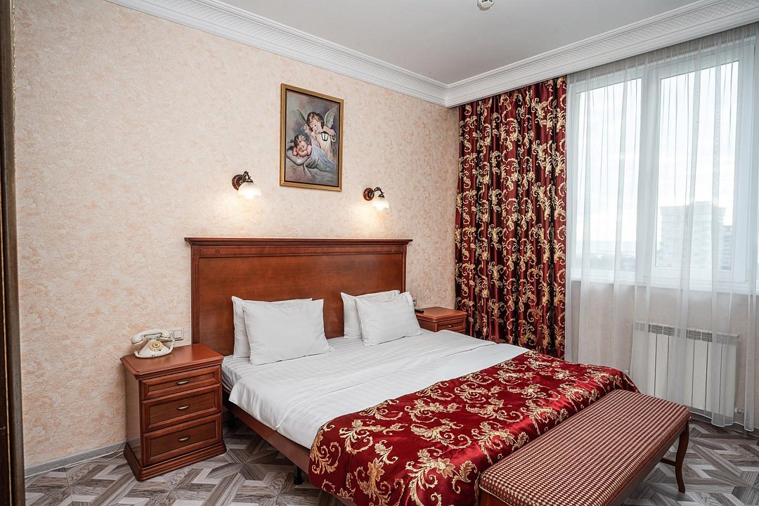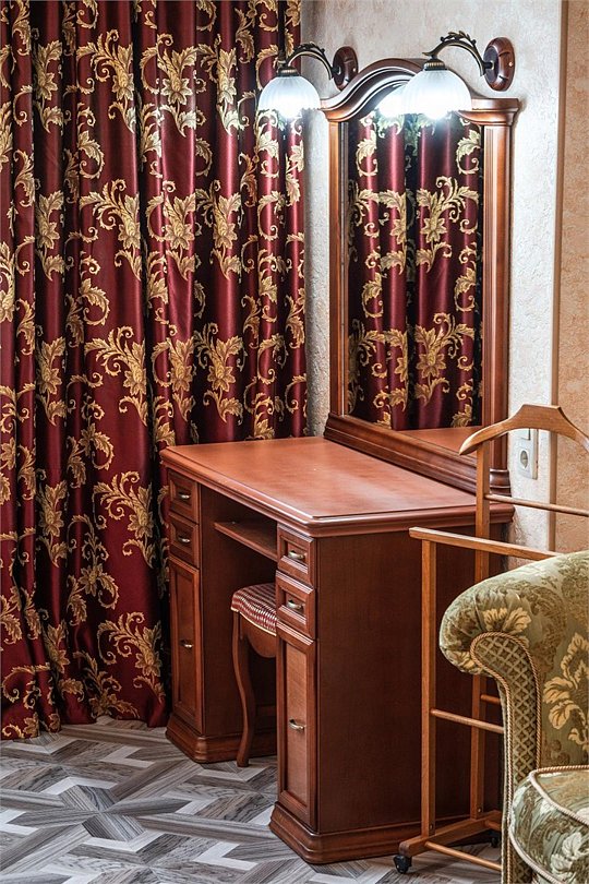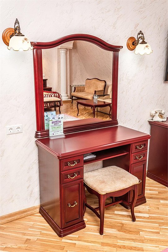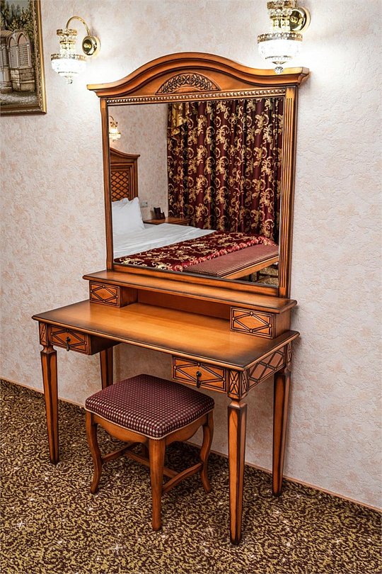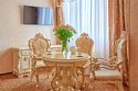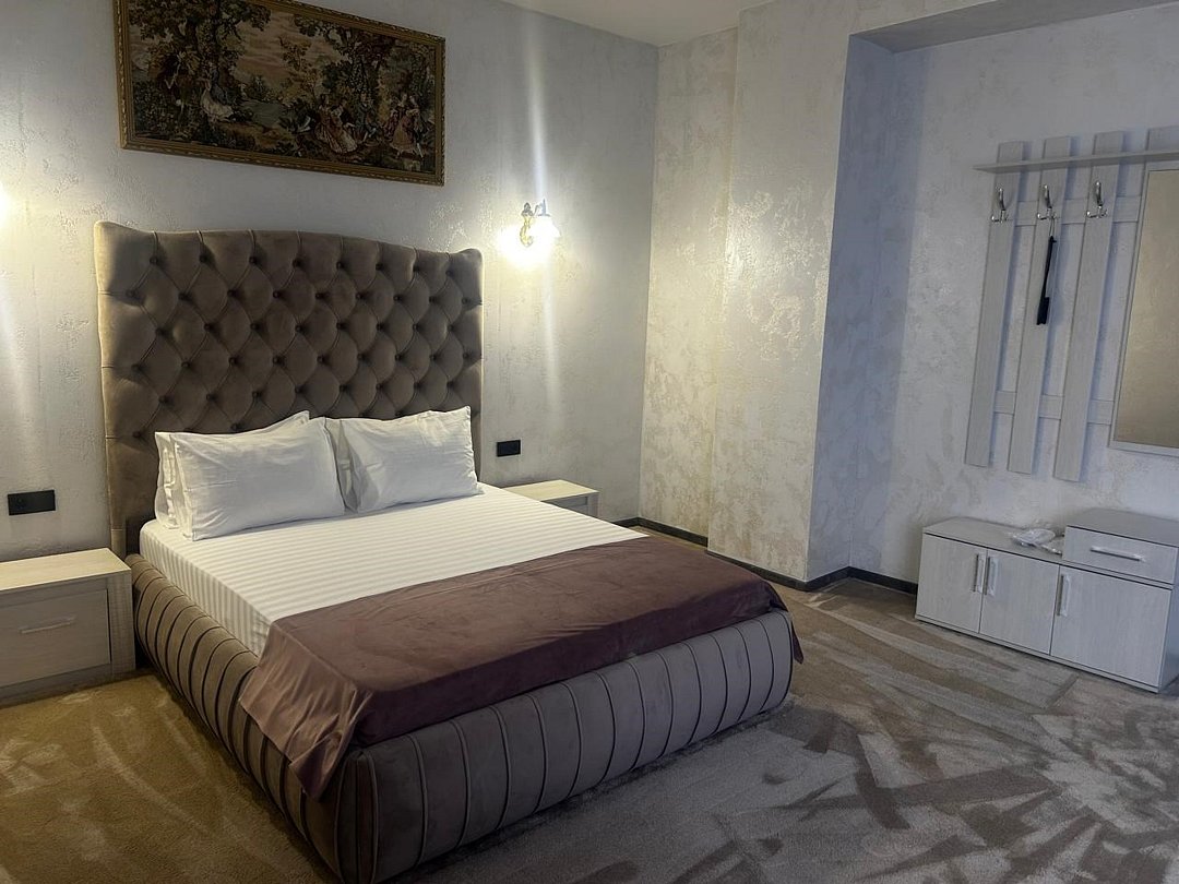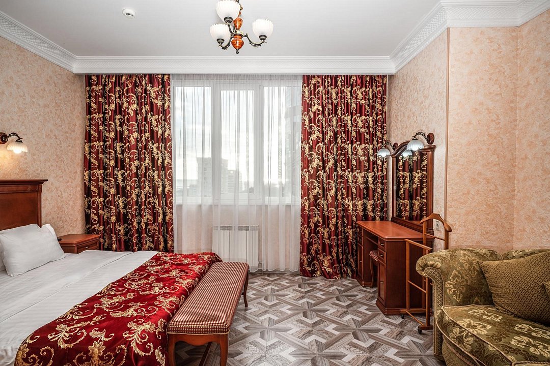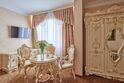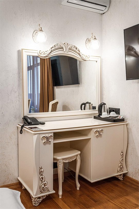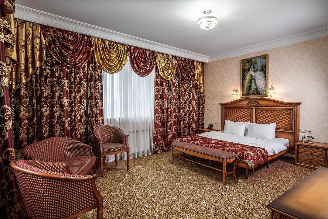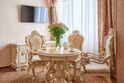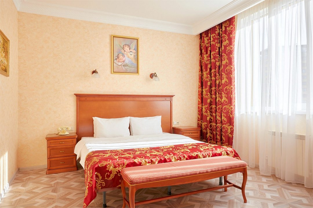 Королевский Люкс - чудесный просторный номер площадью 35 м2 с изысканным дизайном в светлой цветовой гамме. Тщательно подобранная авторская итальянская мебель идеально гармонирует между собой и подходит для особенных людей и исключительных событий. В номере Вас ждет чудесная двуспальная кровать, журнальный столик, прикроватные тумбы, трюмо с зеркалом и многое другое для Вашего максимального комфорта. В ванной комнате для Вас джакузи, душевая кабина, биде и вся необходимая косметика.Услуги и удобства