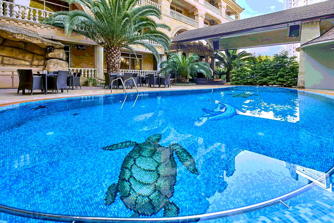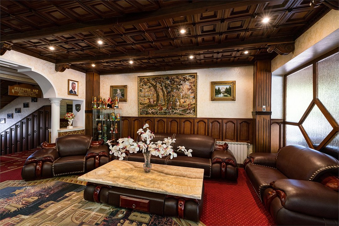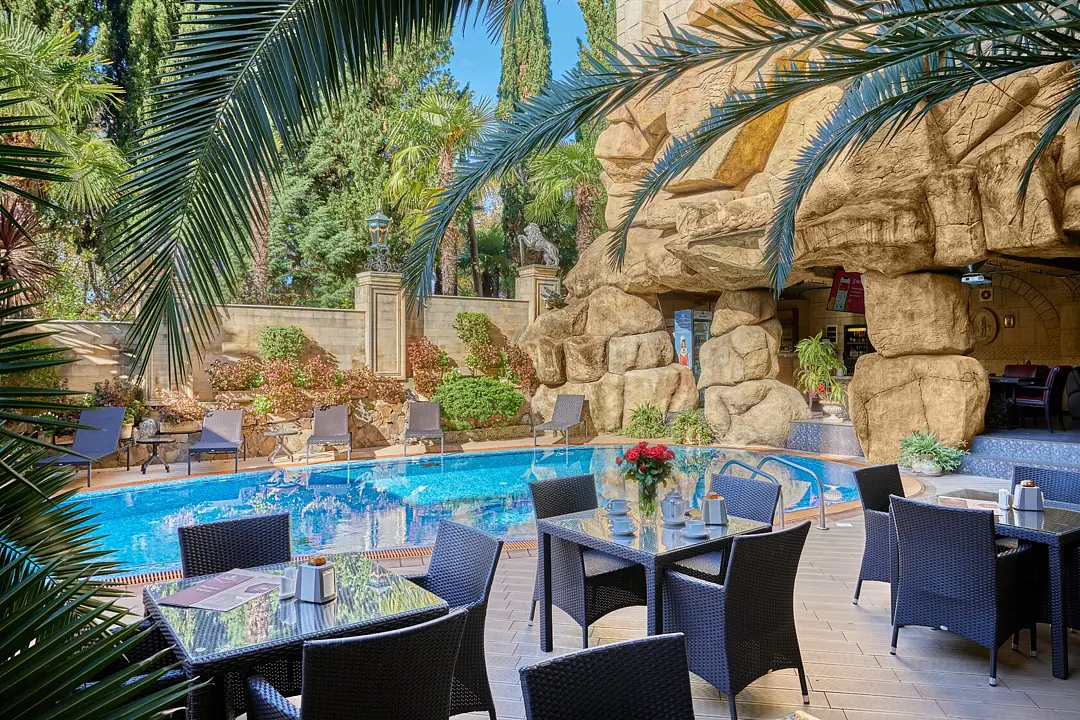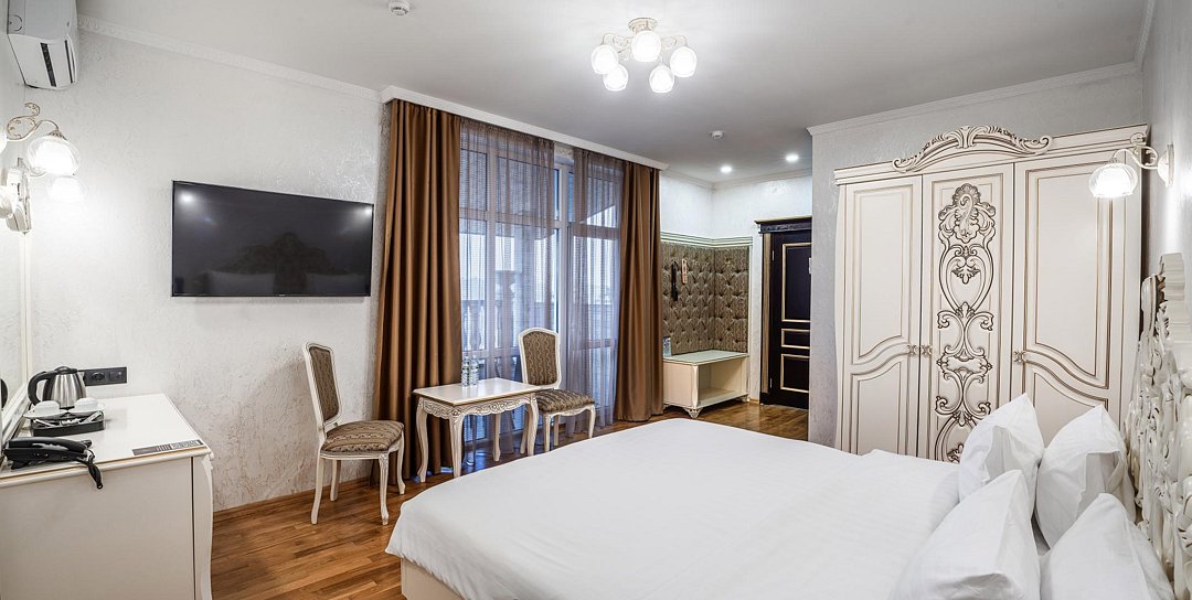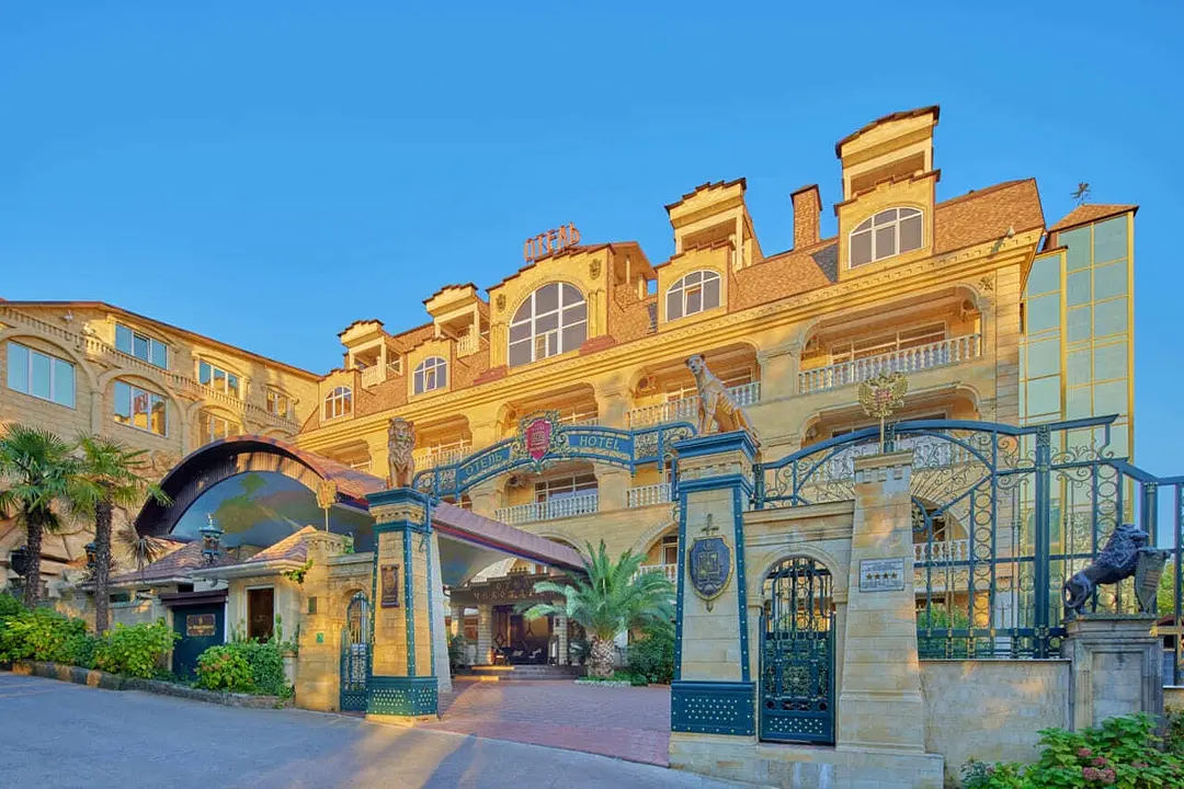 Путешествие по работеПродуманный отель имени себяЛокация конечно такая себе, до моря минут 20 пешком, правда трансфер есть; в шаговой доступности никакой Магнит ну и хорошая Алкотека, зато несколько неплохих ресторанов. Много гостей на авто, преимущественно из "суровых" регионов - Тюмень, Челябинск, Новосибирск. Охраняемая территория, на ночь ворота закрывают, охрана бдит, и загулявший допоздна постоялец вернётся без проблем. Классический недешёвый интерьер, в коридорах дорогие ковры, ампирный говорящий как в метро неспешный лифт. Изумительные девушки на ресепшн. В огромных номерах делюкс основательная деревянная мебель, тоже ковры, высокого качества гигиенические принадлежности, халаты и тапочки, холодильник, чайная станция. Уборка каждый день - идеально, полотенца свежие, вода, бельё без проблем. Убирают в номерах и на кухне сотрудницы из БСССР но с хорошим знанием языка и видимо воспитанием. Мощные пасторальные завтраки: пельмени, вареники, плов, другие вторые блюда, несколько видов сосисок и сарделек, гарниров, и вегетарианских капуст типа брокколи; море фруктов и десертов, отменный кофе, по выходным очень хороший брют от души. Небольшой уютный подогреваемый бассейн, стильные и качественные бордовые полотенца для него и пляжа. Всё отлично, культ личности и традиций, - как уместная изюминка, и ещё раз респект сотрудницам ресепшн!