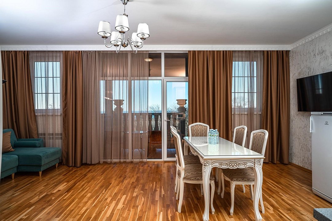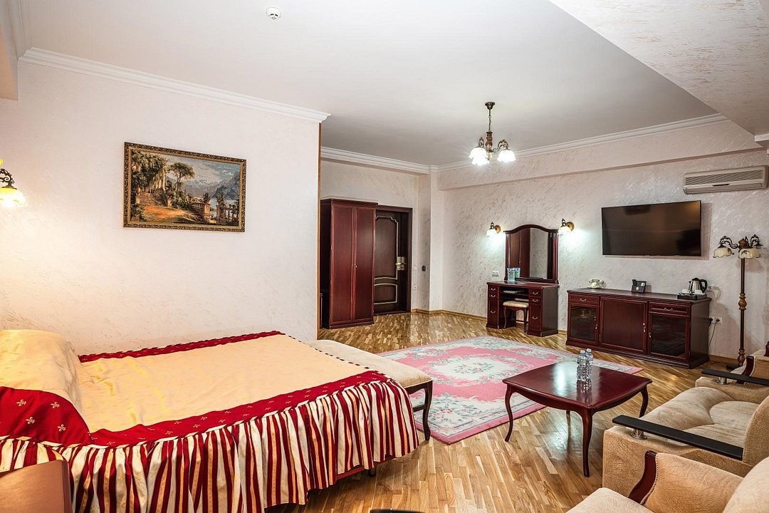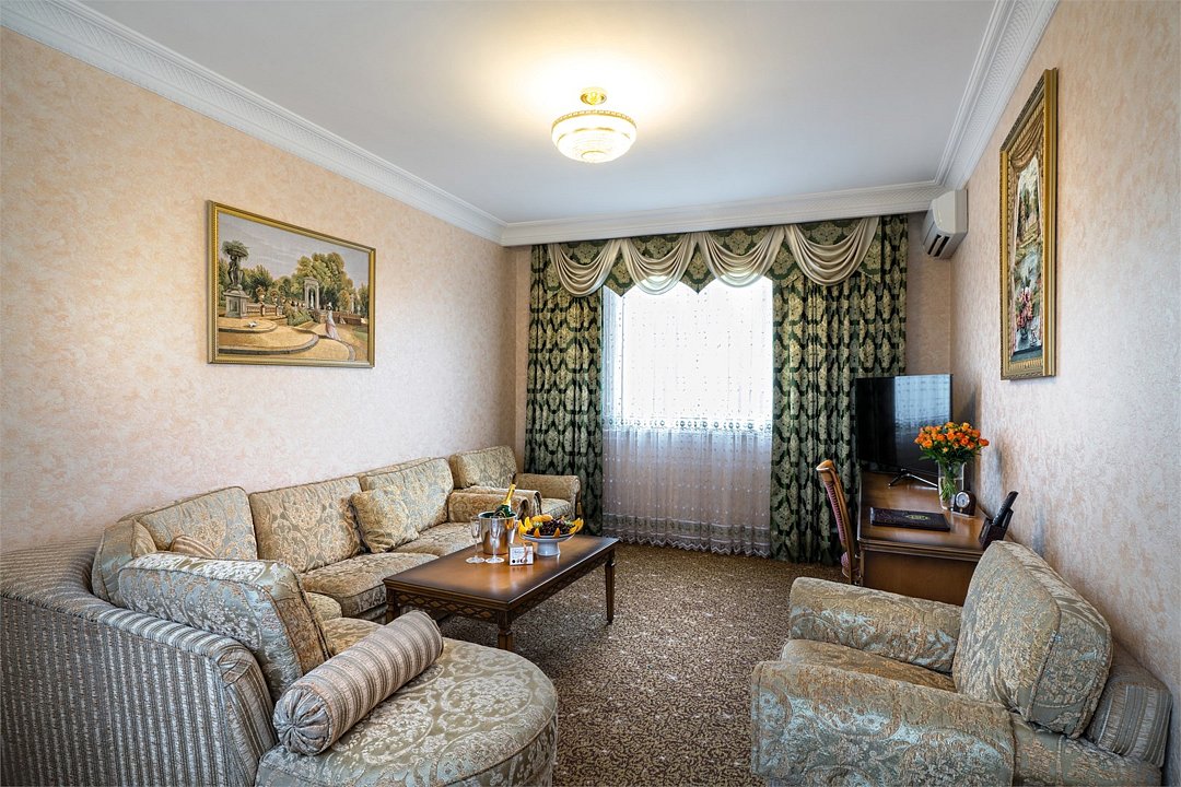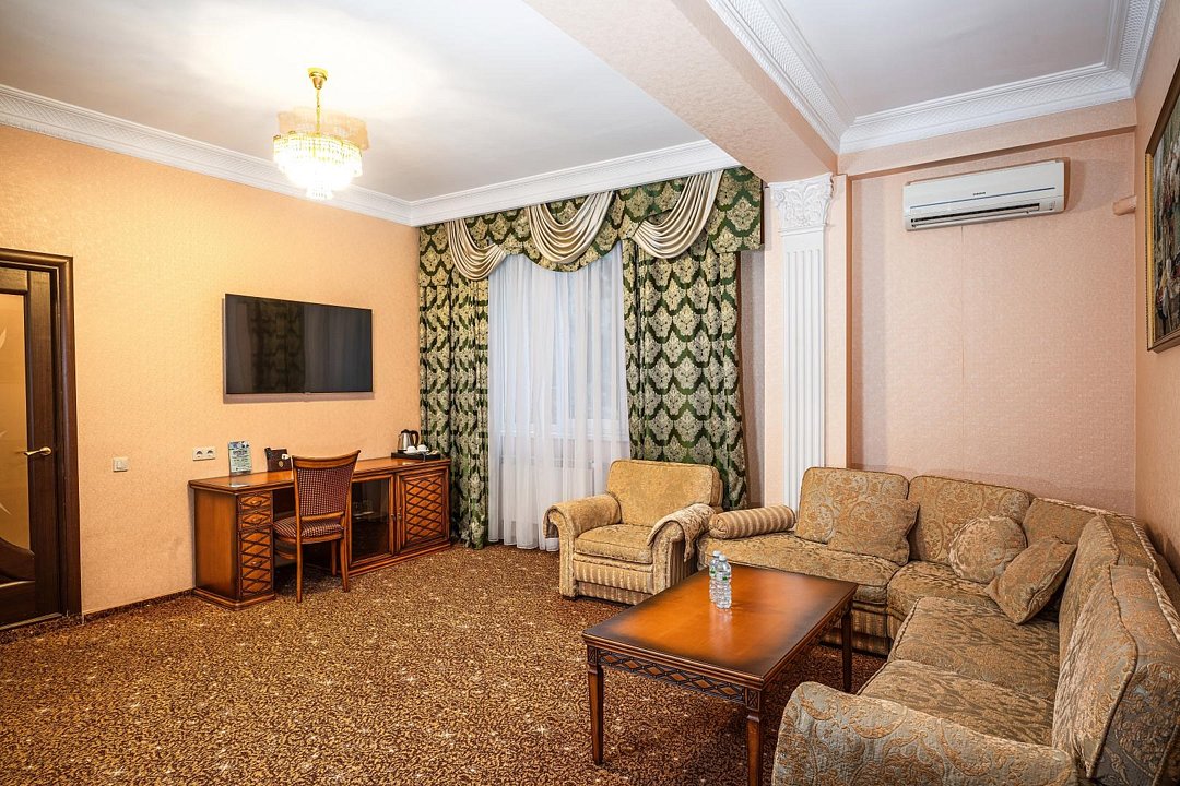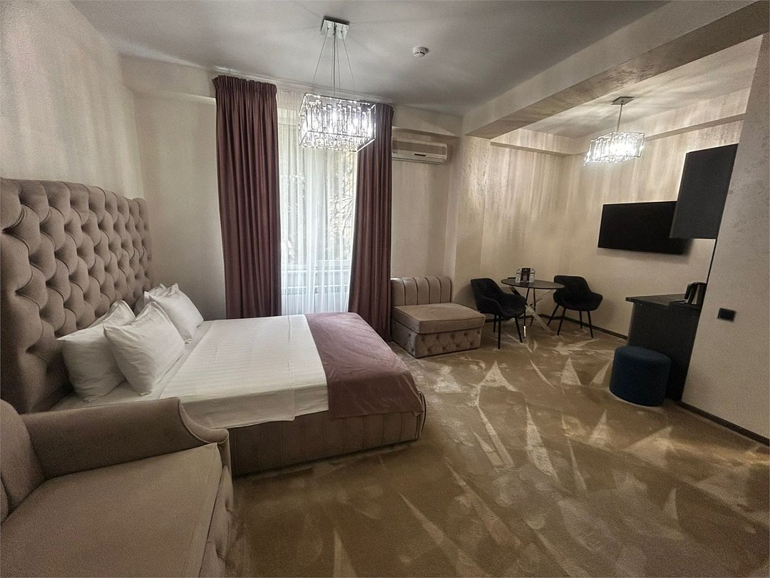 Президентский Люкс Президентский Люкс - Шикарный 2-х комнатный номер площадью 90 м2 имеет эксклюзивный интерьер, продуманный до мелочей и дизайнерское оформление в современном стиле. Номер состоит из просторной гостиной, где расположены письменный стол, стул, журнальный столик, диван и кресло, а также из комфортной спальной комнаты с двуспальной кроватью, прикроватными тумбами и телефоном. Ванная комната полна удобств и включает: душевую кабину, туалет, биде и джакузи для полной расслабления и релаксации. В наличии есть вся необходимая косметика и пол подогреваемый, что очень приятно после принятия водных процедур. Этот номер идеально подходит тем, кто ценит повышенный комфорт и удобство. Вид из окна номера открывается на Сочи.Услуги и удобства