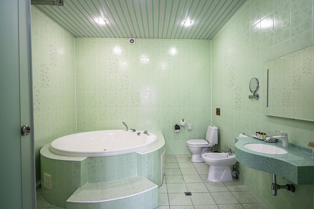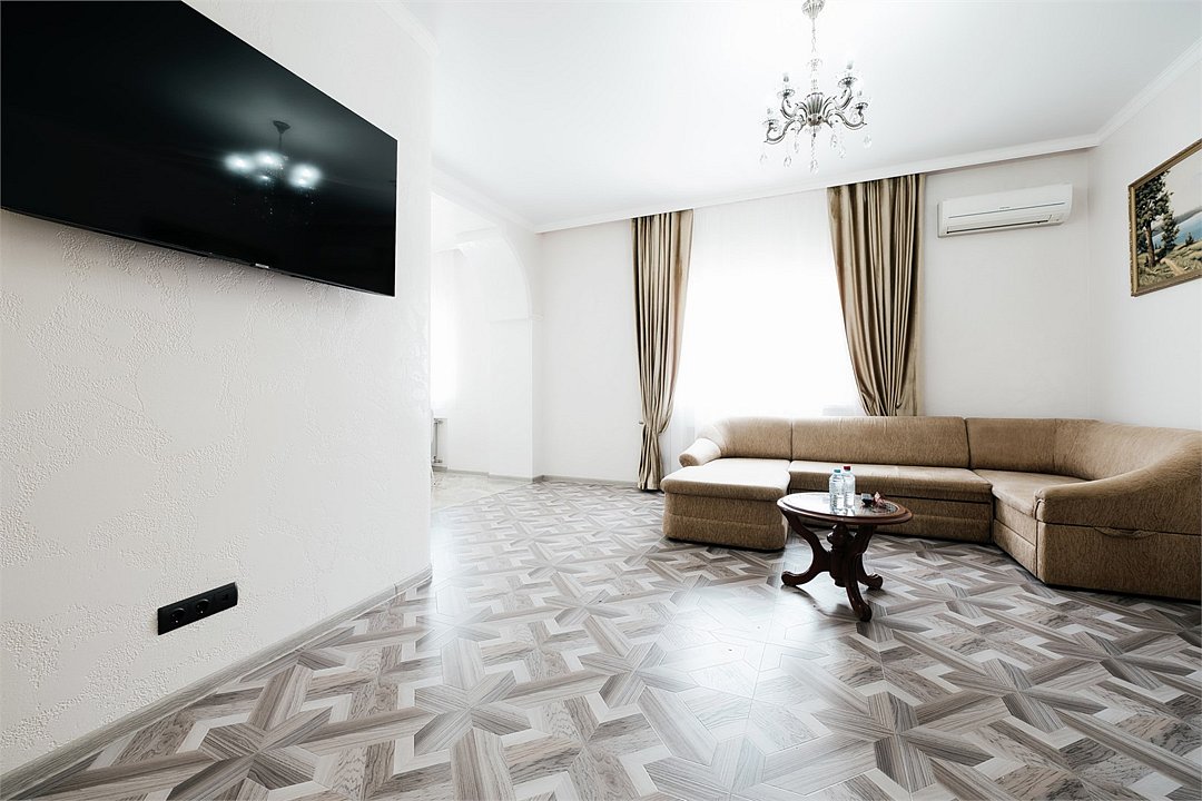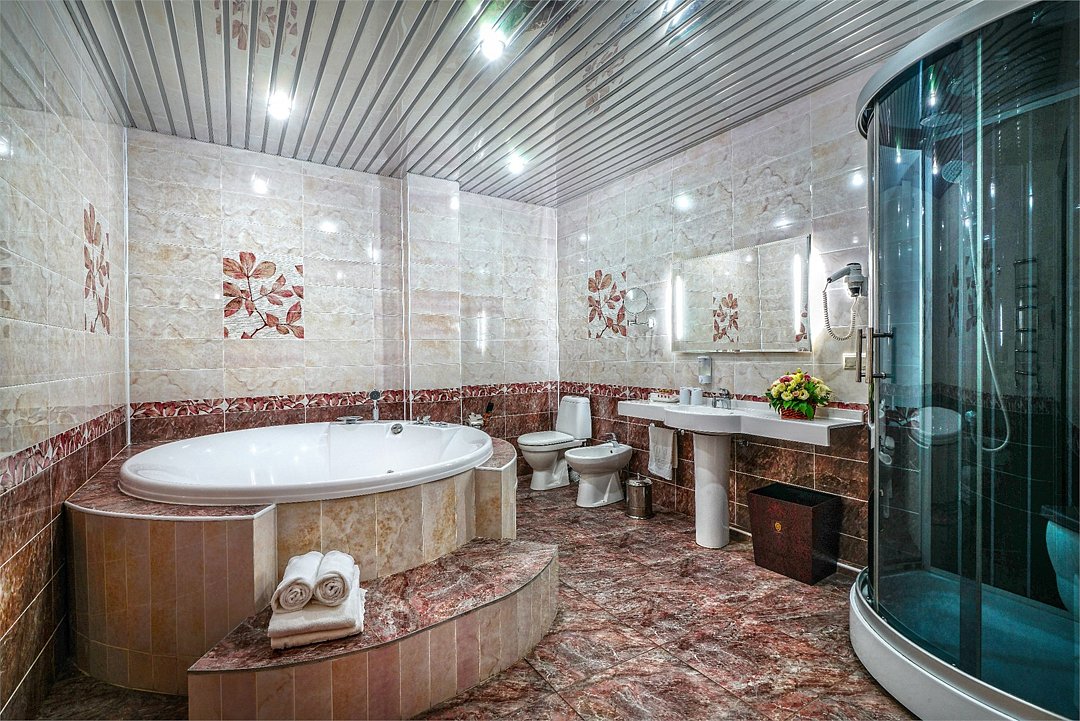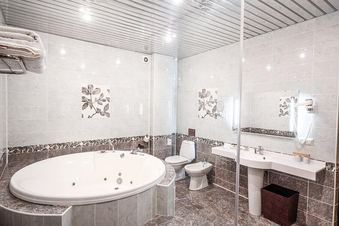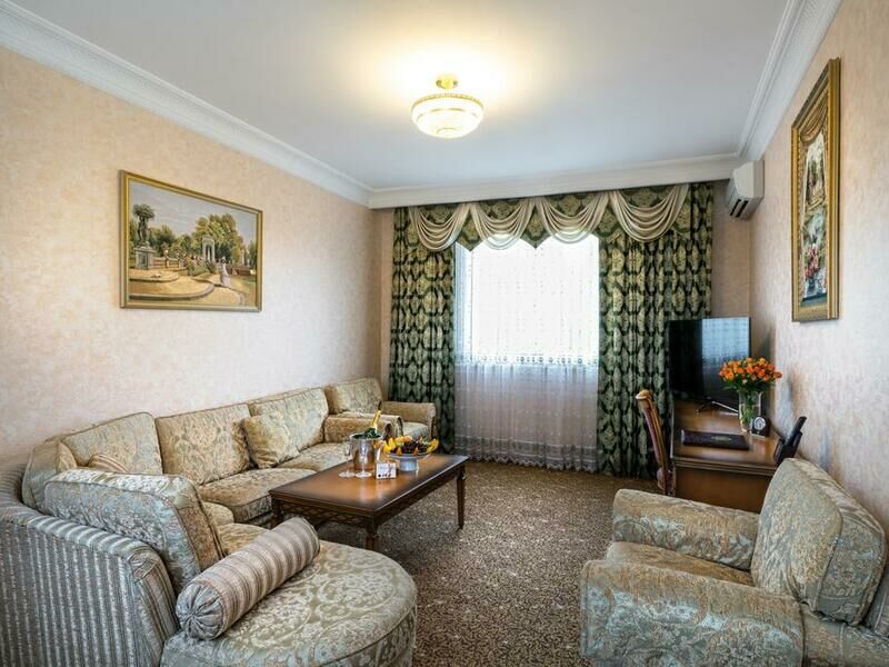 Президентский Люкс Президентский Люкс - Шикарный 2-х комнатный номер площадью 90 м2 имеет эксклюзивный интерьер, продуманный до мелочей и дизайнерское оформление в современном стиле. Номер состоит из просторной гостиной, где расположены письменный стол, стул, журнальный столик, диван и кресло, а также из комфортной спальной комнаты с двуспальной кроватью, прикроватными тумбами и телефоном. Ванная комната полна удобств и включает: душевую кабину, туалет, биде и джакузи для полной расслабления и релаксации. В наличии есть вся необходимая косметика и пол подогреваемый, что очень приятно после принятия водных процедур. Этот номер идеально подходит тем, кто ценит повышенный комфорт и удобство. Вид из окна номера открывается на Сочи.Услуги и удобства