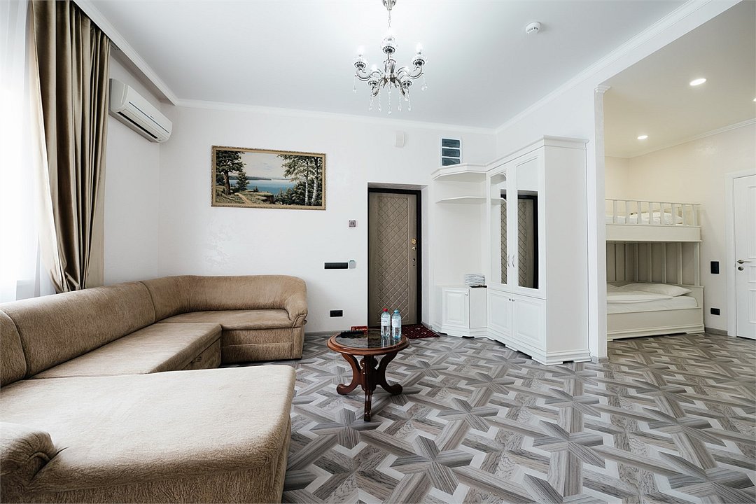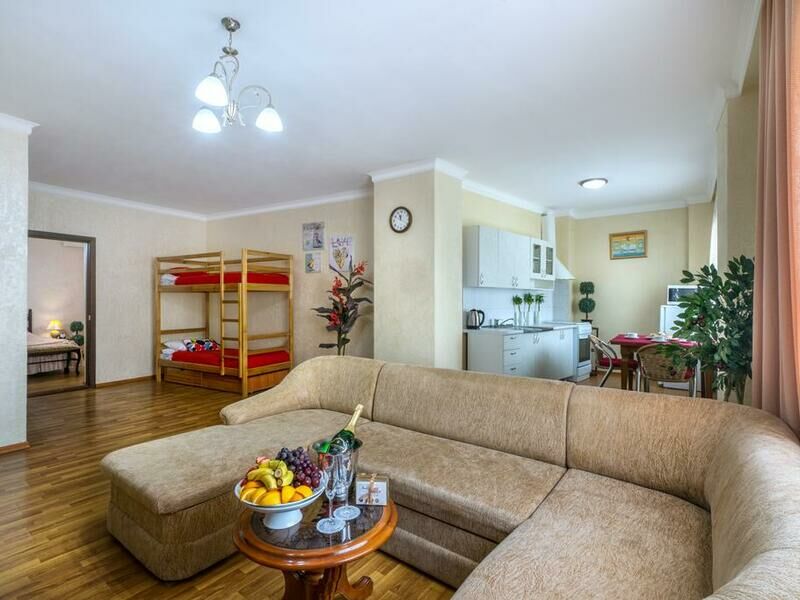 Апартаменты - Светлый комфортный 2-х комнатный семейный номер площадью 70 м2 для райского отдыха большой семьи до 5 человек. В номере удобная спальня с большой двуспальной кроватью, прикроватные тумбы, платяной шкаф и трюмо с зеркалом. А в просторной гостиной обеденная зона, кухня, раскладной диван и двухъярусная кровать, а также выход на балкон, с которого открываются потрясающие виды на море и Сочи! В ванной душ, туалет и биде создают особый комфорт для полного расслабления на отдыхе. Стилистика номера идеально подходит для размещения и отдыха большой семьи.Услуги и удобства