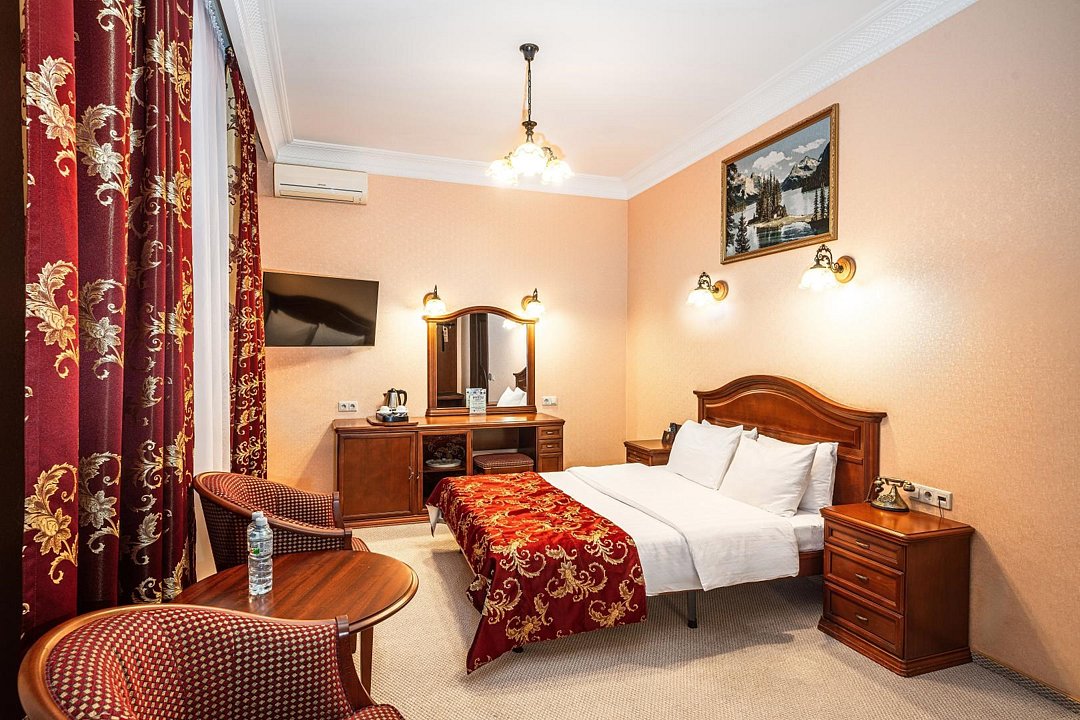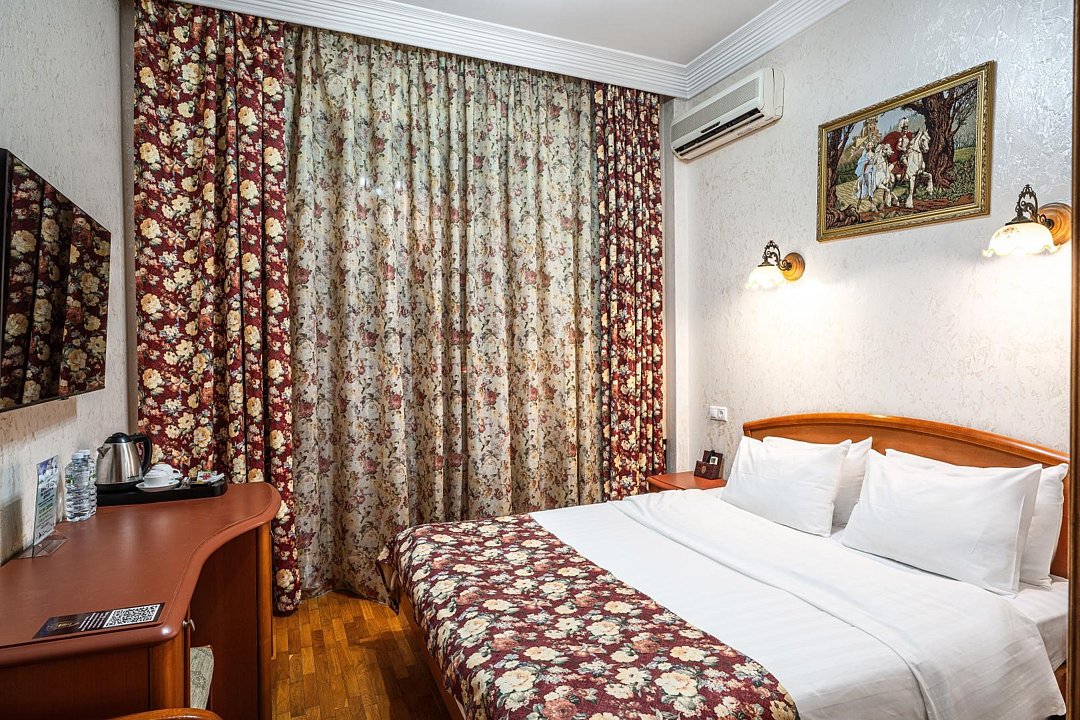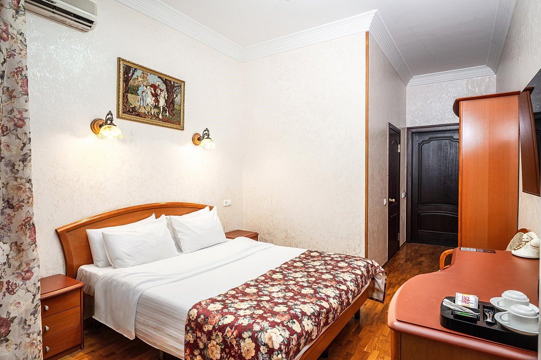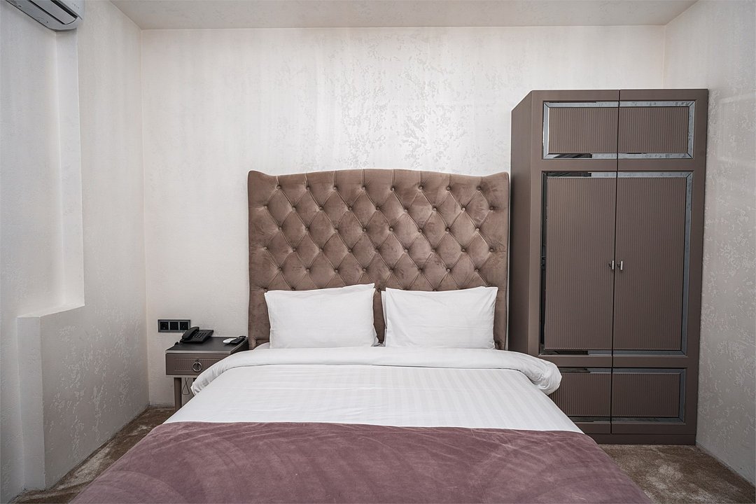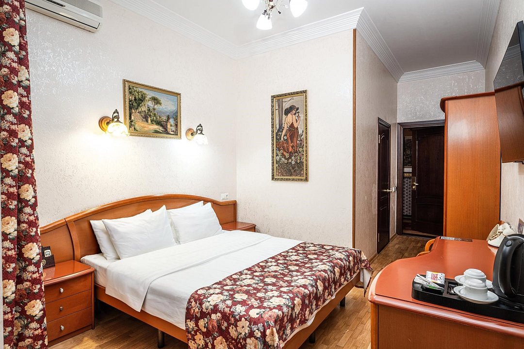 Стандарт - это комфортный и уютный номер для двоих площадью 20 м2 отлично подходит для отдыха или бизнес-поездки. Шикарные виды с балкона направлены на центр Сочи, горы и/или море. Стандарт оснащен одной двуспальной кроватью с прикроватными тумбами и шкаф-купе. В номере есть всё необходимое для создания благоприятной атмосферы для отдыха после активного дня и восстановления сил. Ванная комната оснащена ванной с полным набором качественной брендированной косметической продукции.Услуги и удобства