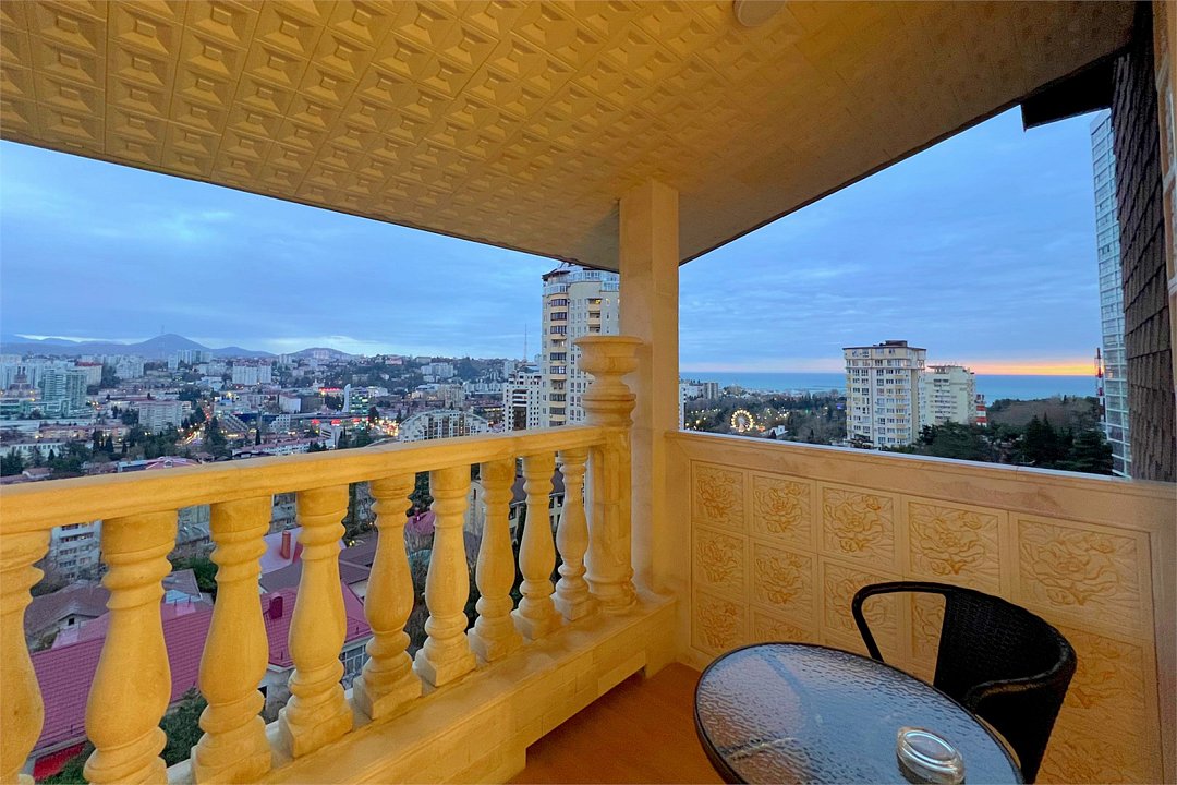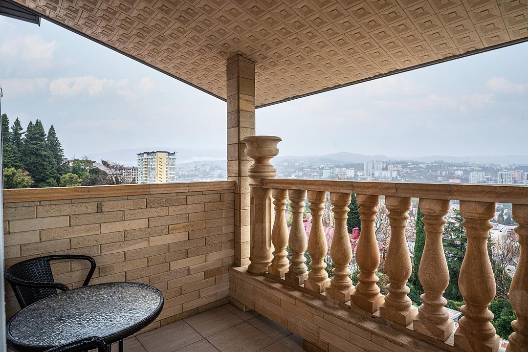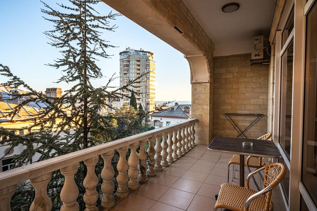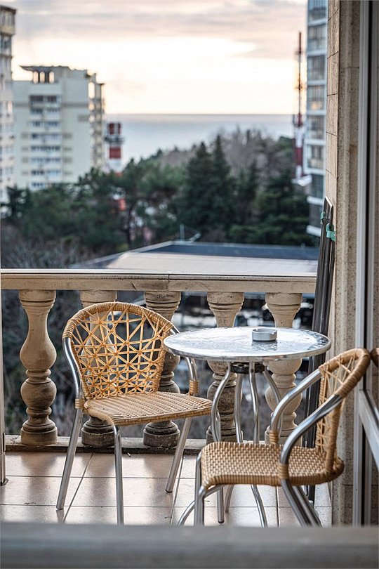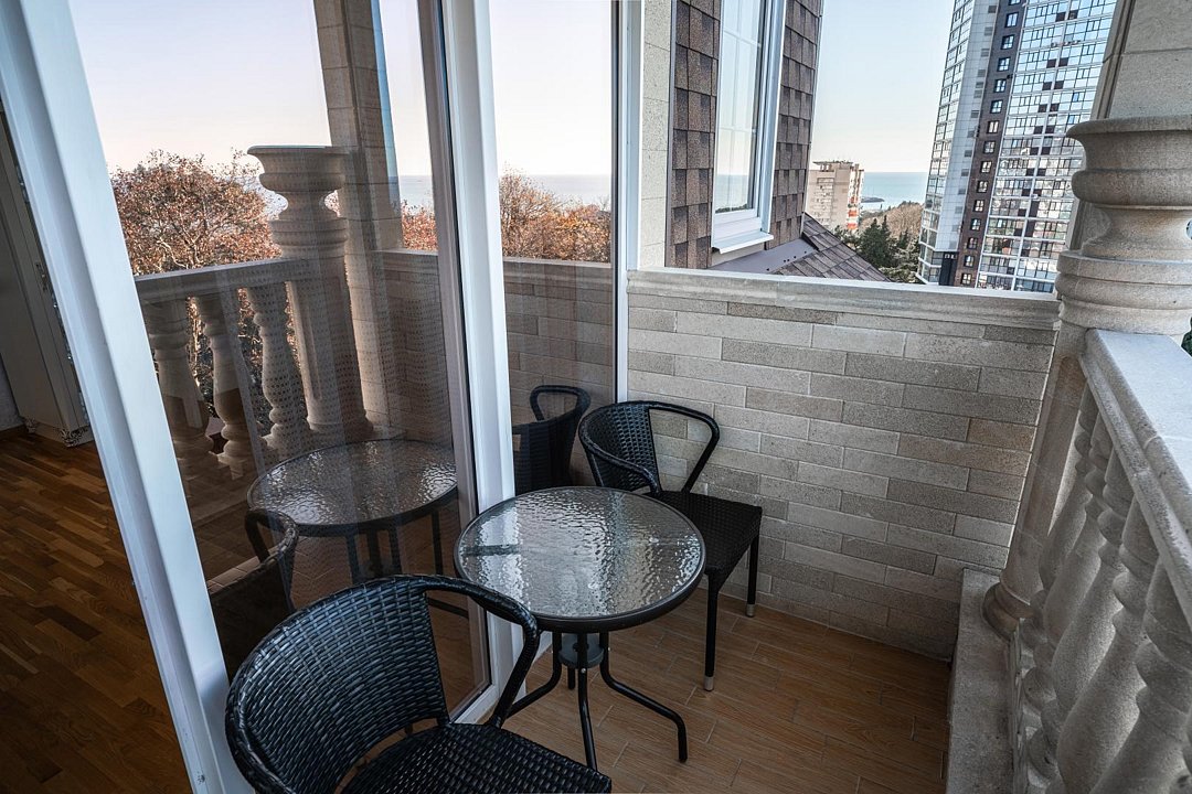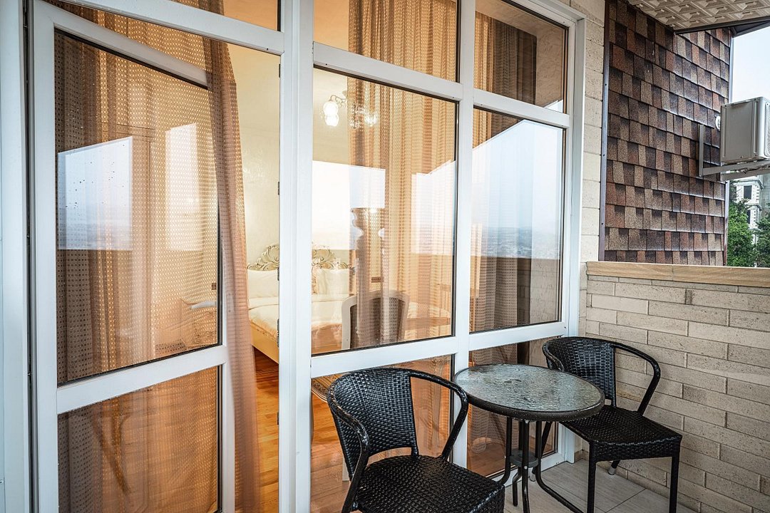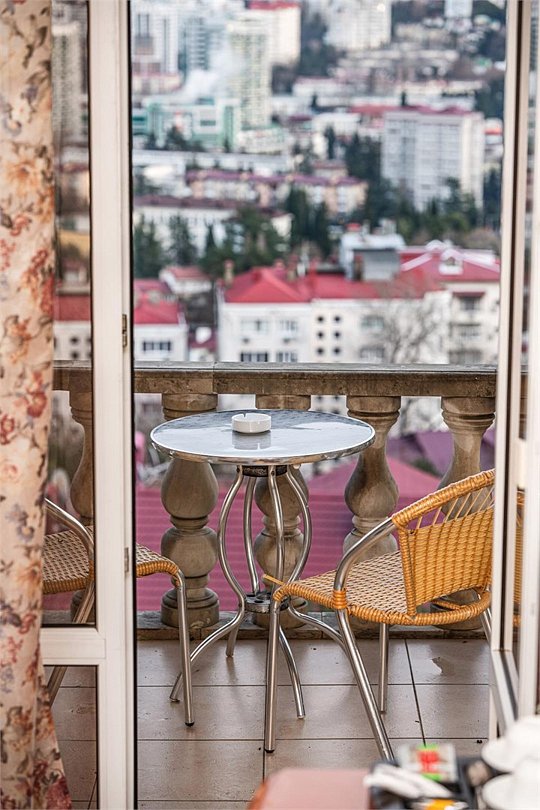 Студио с балконом - Идеальный просторный номер повышенной комфортности площадью 33 м2, имеющий много свободного места и позволяет с удобством разместить до 4-х гостей. В номере имеется двуспальная французская кровать, мягкий раскладной диван, журнальный столик, прикроватные тумбы и многое другое. А стол и 3 ротанговых кресла на просторном балконе позволят с удобством насладиться потрясающими видами на море, горы или Сочи! Спокойная атмосфера способствует беззаботному отдыху для восстановления сил и энергии. Также приятно любоваться огнями вечернего Сочи. Удобная ванна позволит с комфортом помыться и расслабиться, для чего имеются все необходимые косметические и туалетные принадлежности.Услуги и удобства