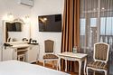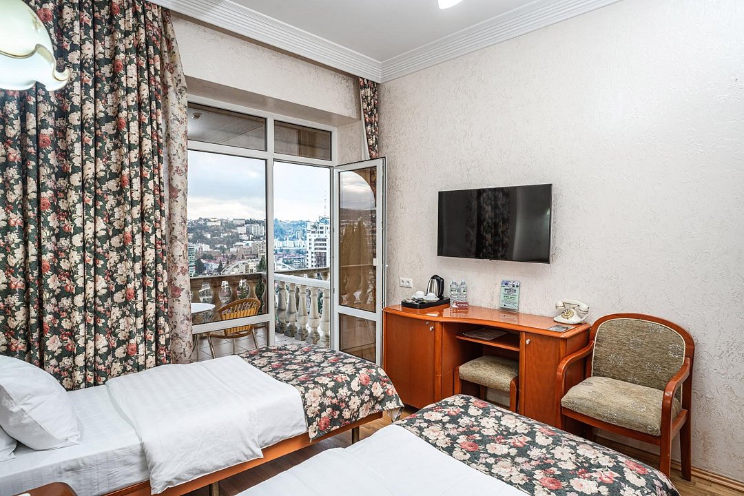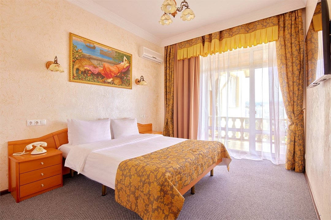 Комфорт - Изящный светлый номер для двоих площадью 25 м2 с удобной мебелью и балконом, с которого открываются потрясающие виды на море, горы и Сочи. А вечером виды на завораживающую красоту светящих огней Сочи точно ни оставят Вас равнодушными! В номере находится большая двуспальная кровать, прикроватные тумбы, журнальный столик, трюмо с зеркалом и шкаф с сейфом для личных вещей. В ванной душ, туалет и биде создают особый комфорт для расслабления и полноценного отдыха. Стилистика номера идеально подходит для молодоженов, которые собираются в Сочи провести свой медовый месяц.Услуги и удобства