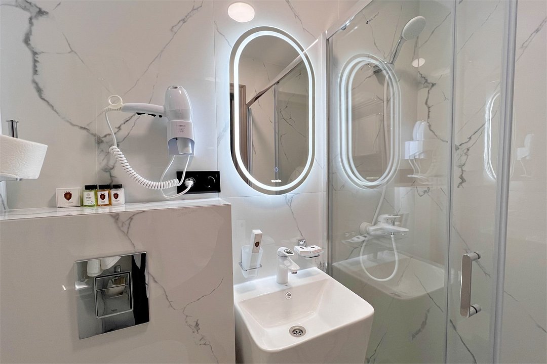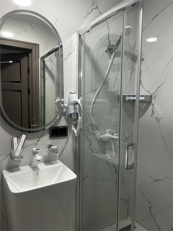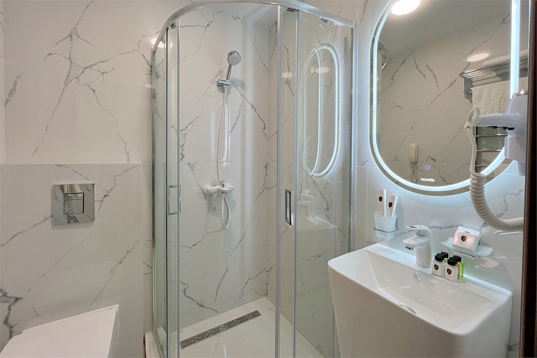 Wi-Fi, кондиционер, светильник, фен, электронные замки, санузел, халаты, банные полотенца, пляжные полотенца, тапочки, гигиенические средства, односпальная кровать, вешалки, зеркало, унитаз, раковина, душ, туалетные средства, туалет, сплит-система, цифровое тв, телевизор с плоским экраном, без питомцевВ номере
