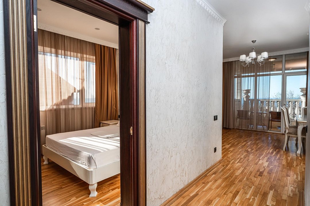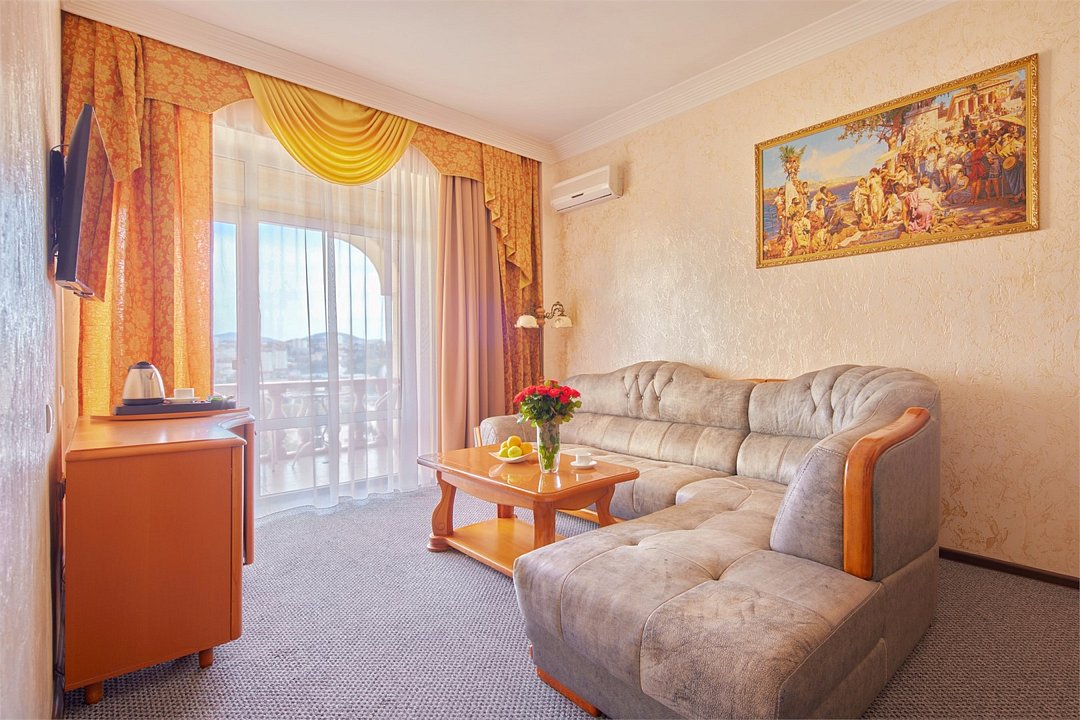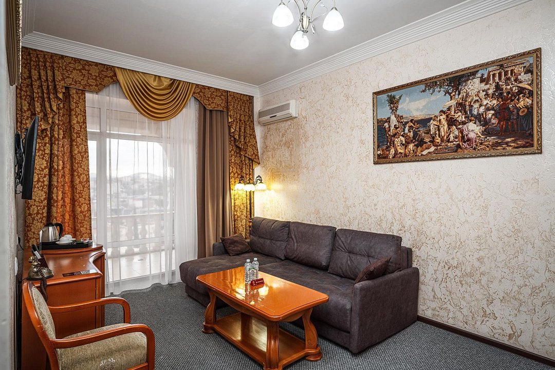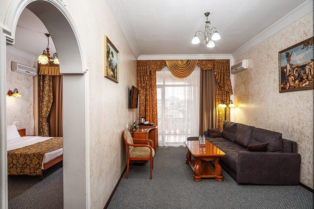 Люкс Фемили - Комфортабельный семейный номер площадью 45 м2 с двуспальной французской кроватью, прикроватными тумбами, мягкой мебелью, журнальным столиком, диваном и многим другим. Всё это создает уютную и спокойную атмосферу для полноценного отдыха и восстановления сил. Из номера открываются виды на центр Сочи и море. Также Вы сможете полюбоваться вечерними огнями города. В ванной комнате для Вас душ, биде, фен и нужные косметические принадлежности.Услуги и удобства