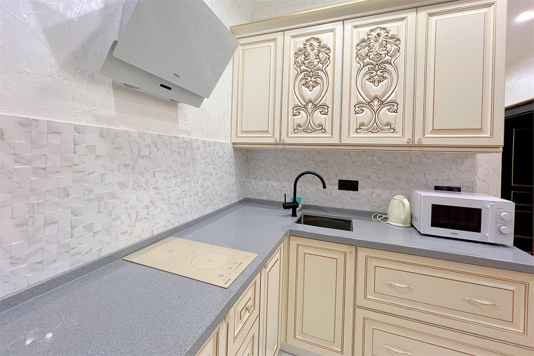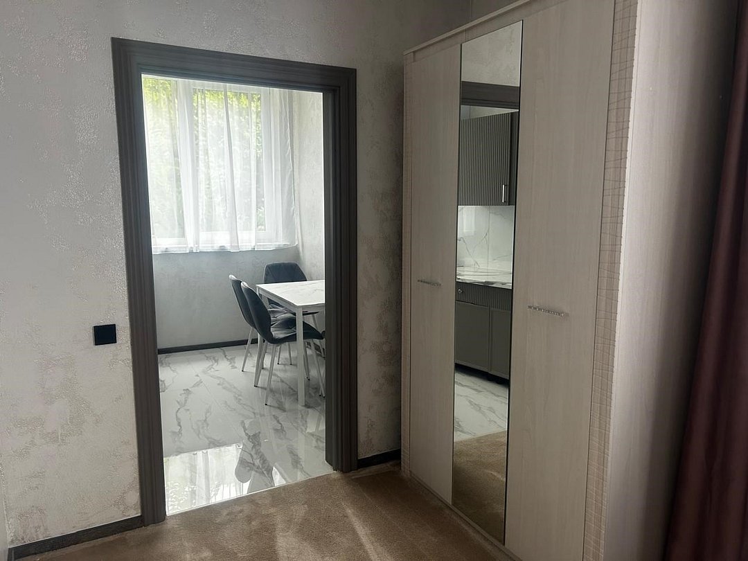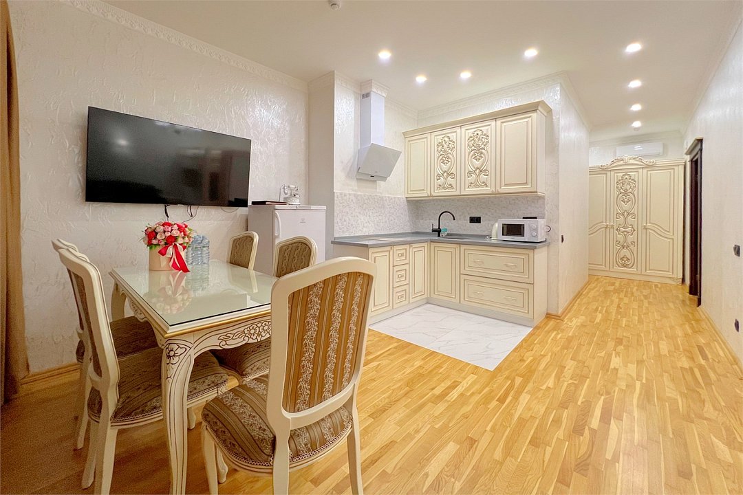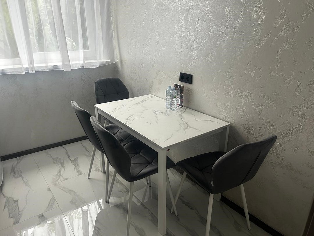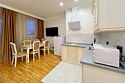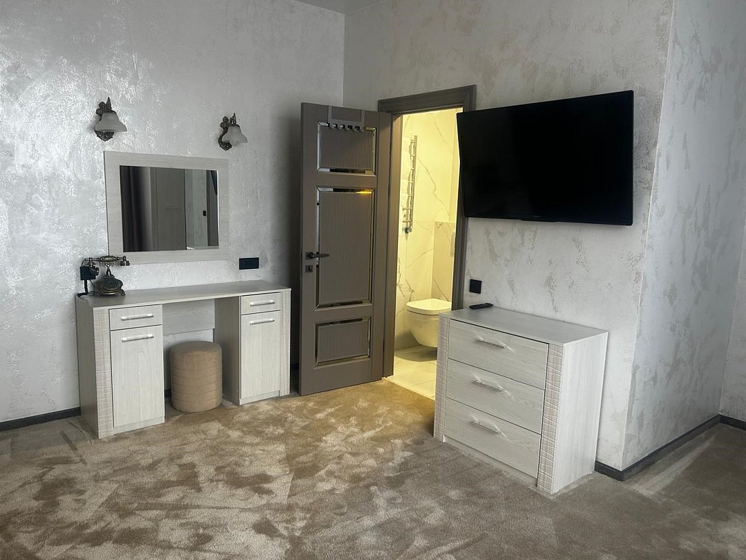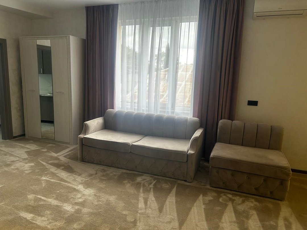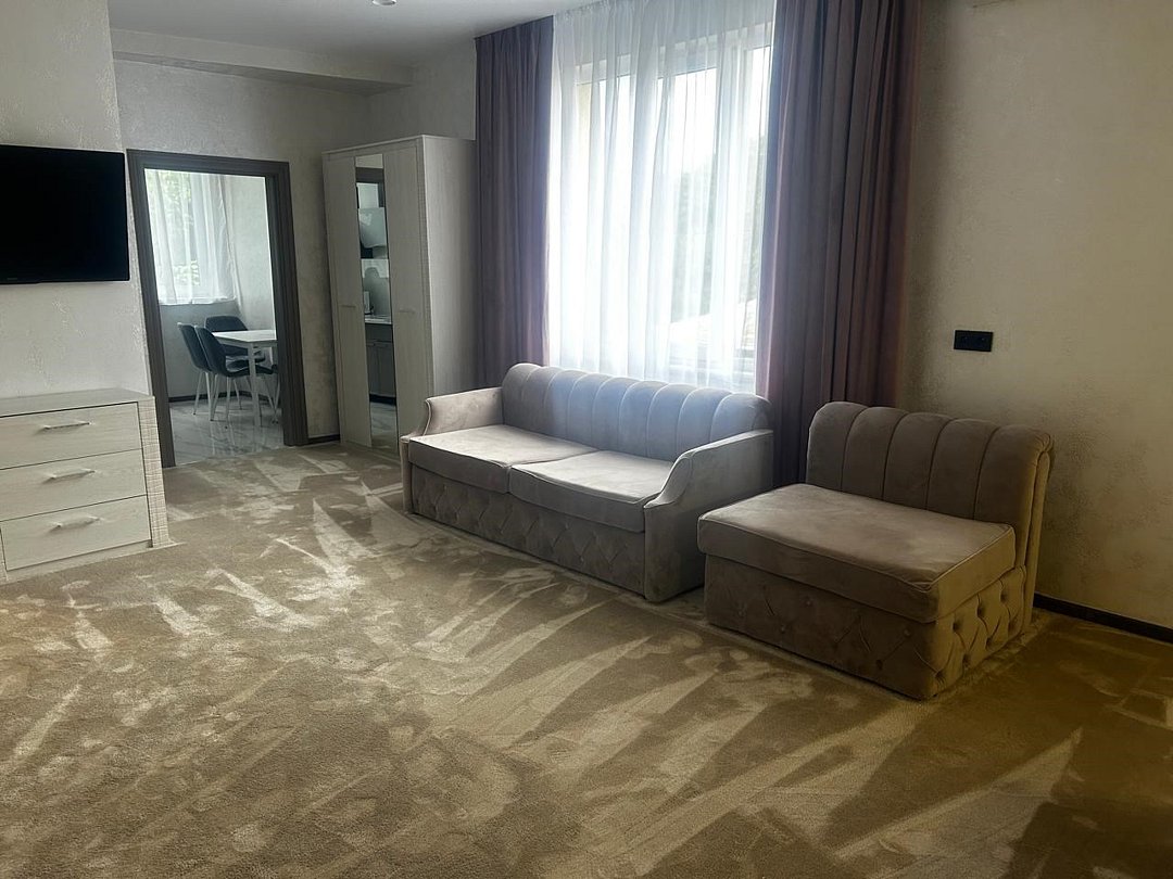 Апартаменты студио - новый, светлый, комфортный, семейный номер с современным ремонтом , площадью 54 м2 с отдельной кухней прекрасно подойдет для отдыха большой семьи до 5 человек. В номере удобная двуспальная кровать, прикроватные тумбы, платяной шкаф, комод и трюмо с зеркалом. Отдельно полноценная кухня с обеденной зоной, техникой и посудой для самостоятельного приготовления еды. В ванной комнате - душ, туалет, стиральная машина.Услуги и удобства