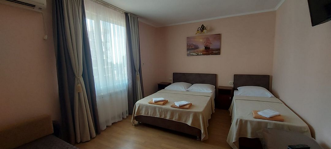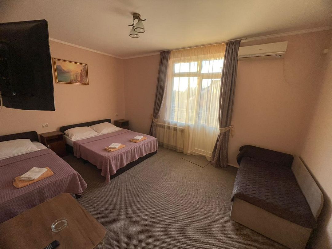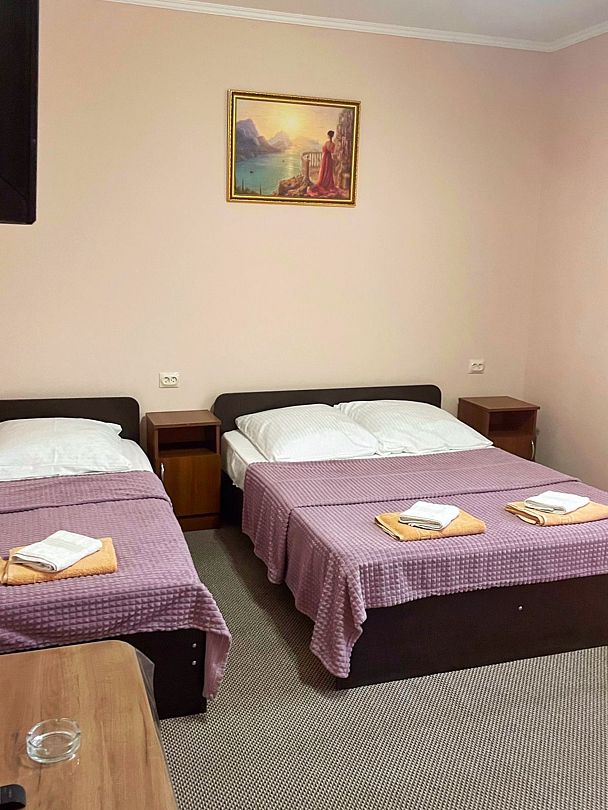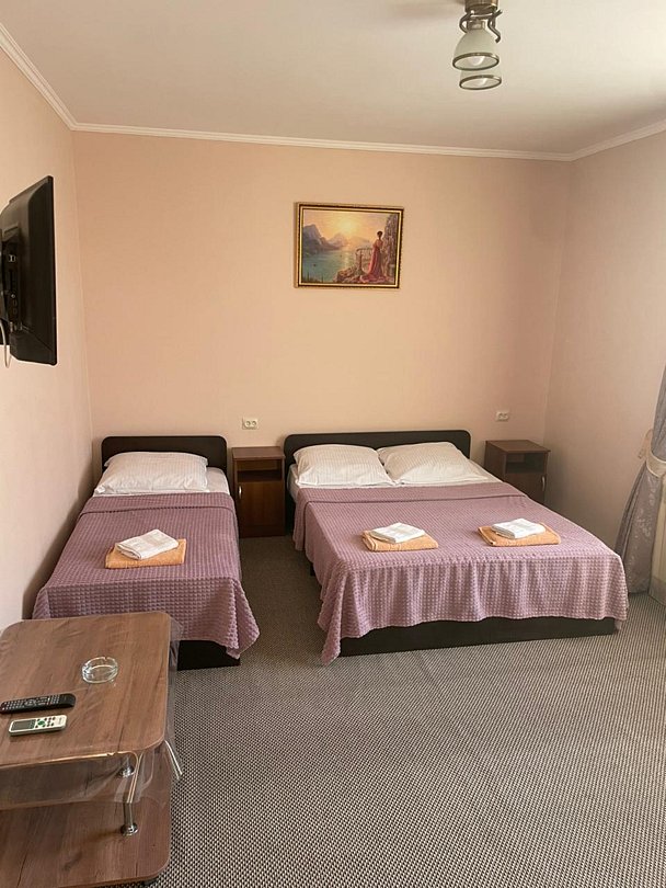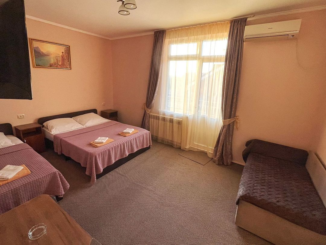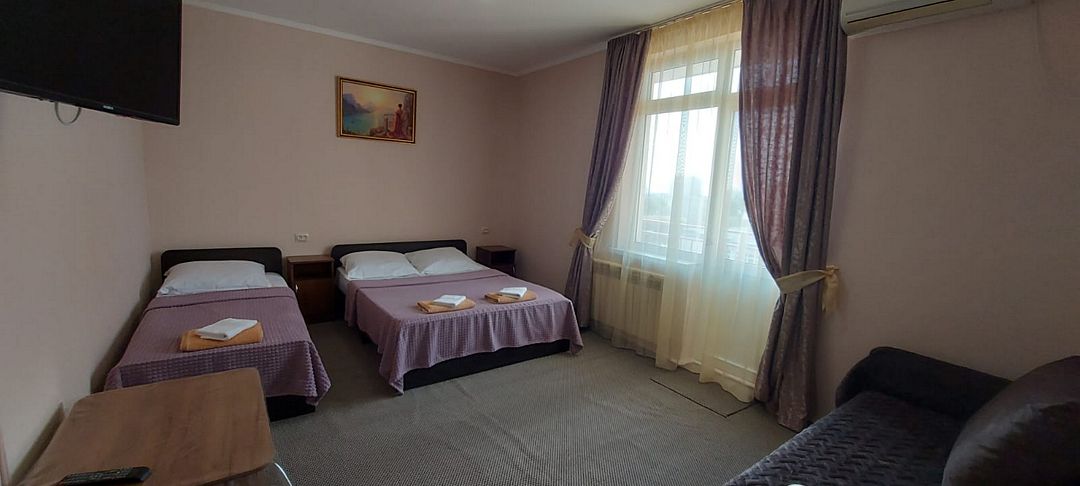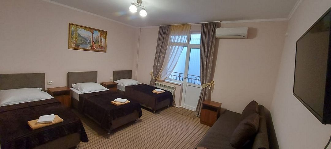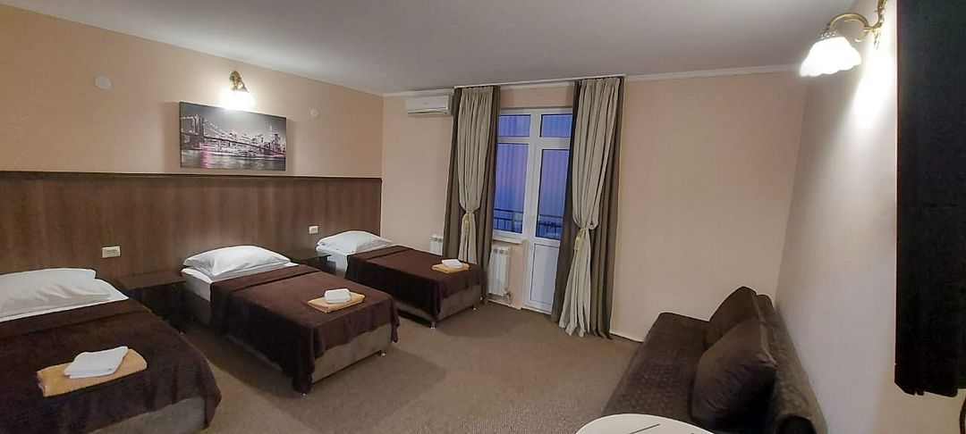 В номере: 3 односпальные кровати, 1 двуспальный диван.