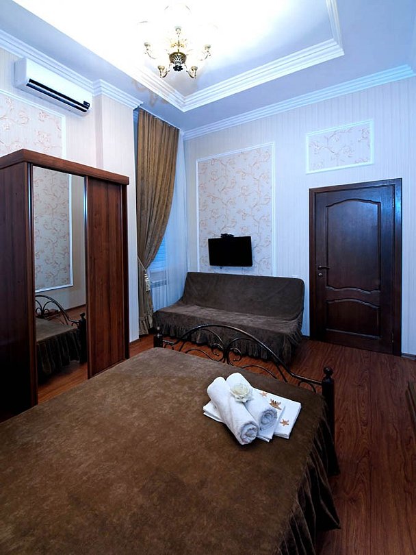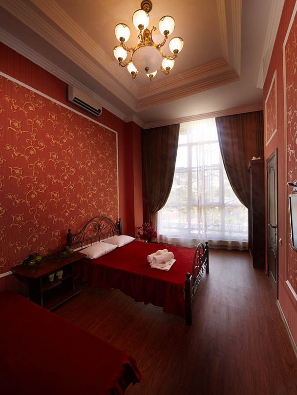 Двухэтажный корпус гостевого дома, расположенный на тихой улочке в 930 метрах от моря, предлагает уютные номера с удобствами. В номерах, оформленных в классическом стиле с использованием благородных темных оттенков, вас ждет кондиционер, плазменный телевизор и холодильник. К вашим услугам также парковка и интернет.